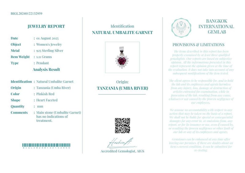 NATURAL UMBALITE GARNET (UNTREATED) PENDANT ON 925 SILVER - WITH DIGITAL CERTIFICATE ONLY Gemstone : Natural Umbalite Garnet (Untreated)Certificate (Digital): Bigl20240122132959Item Total Weight : 1.11 GramsMain Stone Color : Pinkish RedSize : Comments : Main Stone (Umbalite Garnet) Has No Indications Of Treatment.✻ Verify Report Online At Www.Bangkokinternationalgemlab.Co Condition: Good - Refer Images 01611137+33