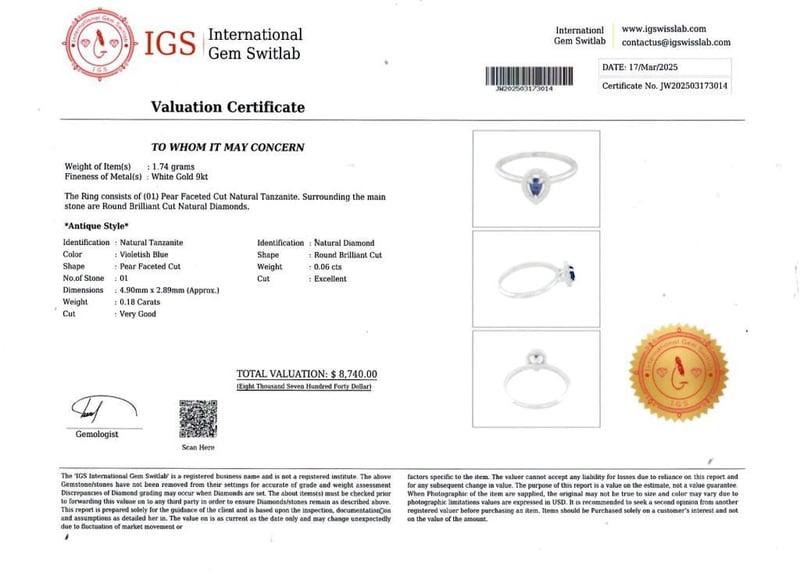9CT WHITE GOLD TANZANITE AND DIAMOND RING Ring White Gold 9K Natural Tanzanite : 0.18 Carat Natural Diamond : 0.06 Carat Item Weight : 1.74 G Valuations Provided by an Independent Third-Party Professional Not Directly Associated With Lloyds Auctions at AUD $8740This valuation has been conducted by an independent third-party professional. The valuation amount is an assessment by the issuing valuer and does not reflect the auction value of the item. Any inquiries regarding the valuation should be directed to the issuing valuer (refer to contact details on the certificate), as Lloyds Auctions has no affiliation or influence over the valuation, the valuer, or the stated amount. Condition: Good - Refer Images 0586170+173014