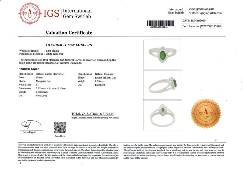 9CT WHITE GOLD GARNET (TSAVORITE) AND DIAMOND Ring White Gold 9K Natural Garnet (Tsavorite) : 0.48 Carat Natural Diamond : 0.29 Carat Item Weight : 1.98 G Valuations Provided by an Independent Third-Party Professional Not Directly Associated With Lloyds Auctions at AUD $8775This valuation has been conducted by an independent third-party professional. The valuation amount is an assessment by the issuing valuer and does not reflect the auction value of the item. Any inquiries regarding the valuation should be directed to the issuing valuer (refer to contact details on the certificate), as Lloyds Auctions has no affiliation or influence over the valuation, the valuer, or the stated amount. Condition: Good - Refer Images 0586170+183040