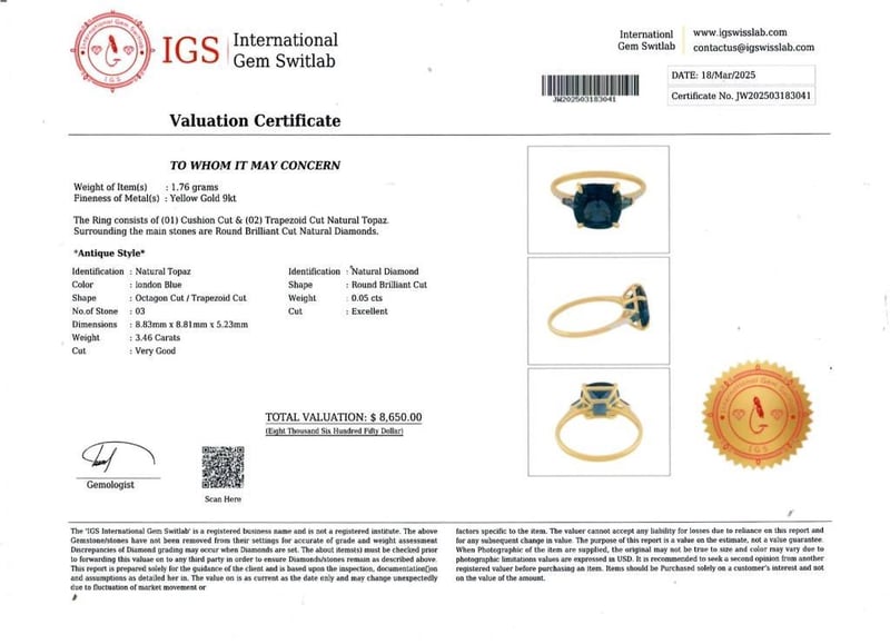 9CT YELLOW GOLD LONDON BLUE TOPAZ AND DIAMOND RING Ring Yellow Gold 9K Natural London Blue Topaz : 3.46 CtNatural Diamond : 0.05 Carat Item Weight : 1.76 G Valuations Provided by an Independent Third-Party Professional Not Directly Associated With Lloyds Auctions at AUD $8650This valuation has been conducted by an independent third-party professional. The valuation amount is an assessment by the issuing valuer and does not reflect the auction value of the item. Any inquiries regarding the valuation should be directed to the issuing valuer (refer to contact details on the certificate), as Lloyds Auctions has no affiliation or influence over the valuation, the valuer, or the stated amount. Condition: Good - Refer Images 0586170+183041