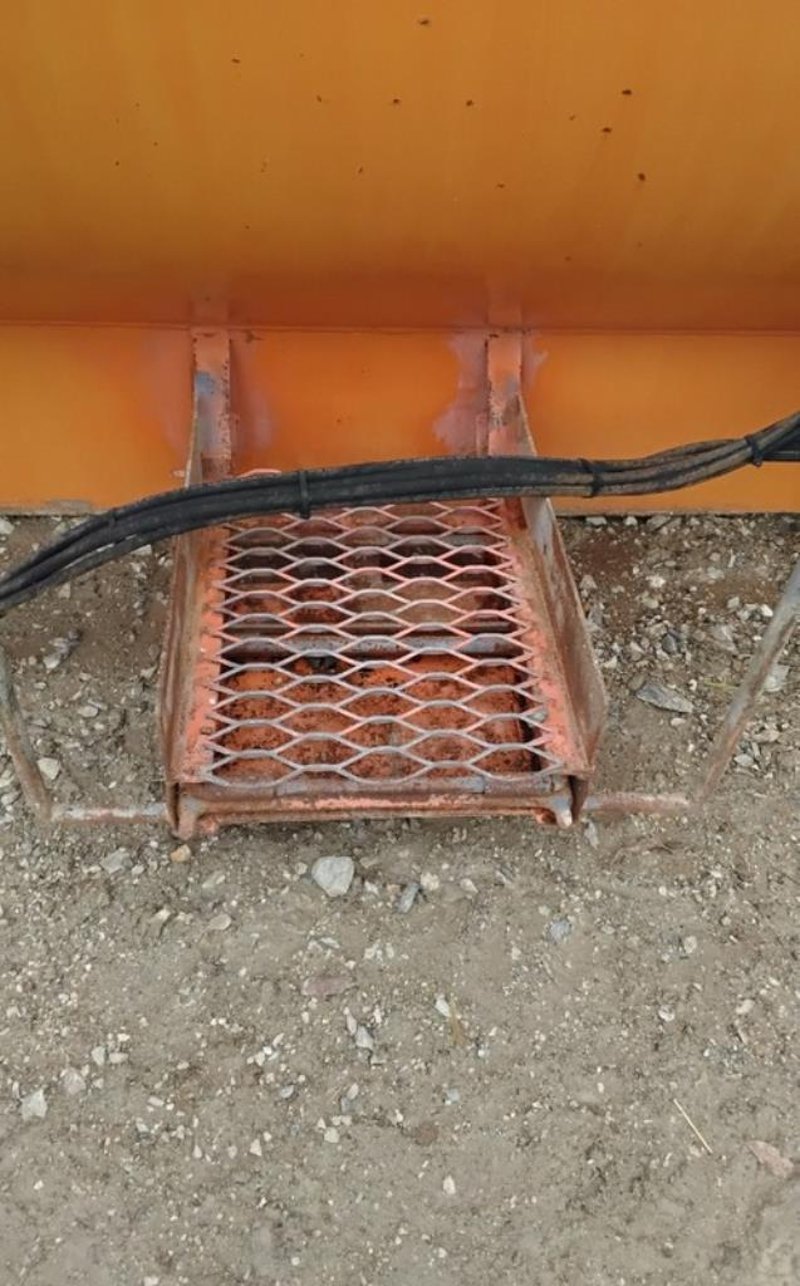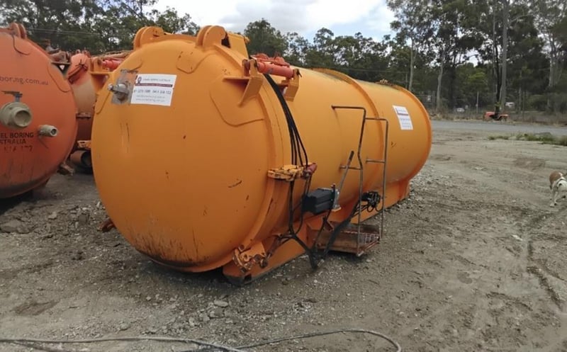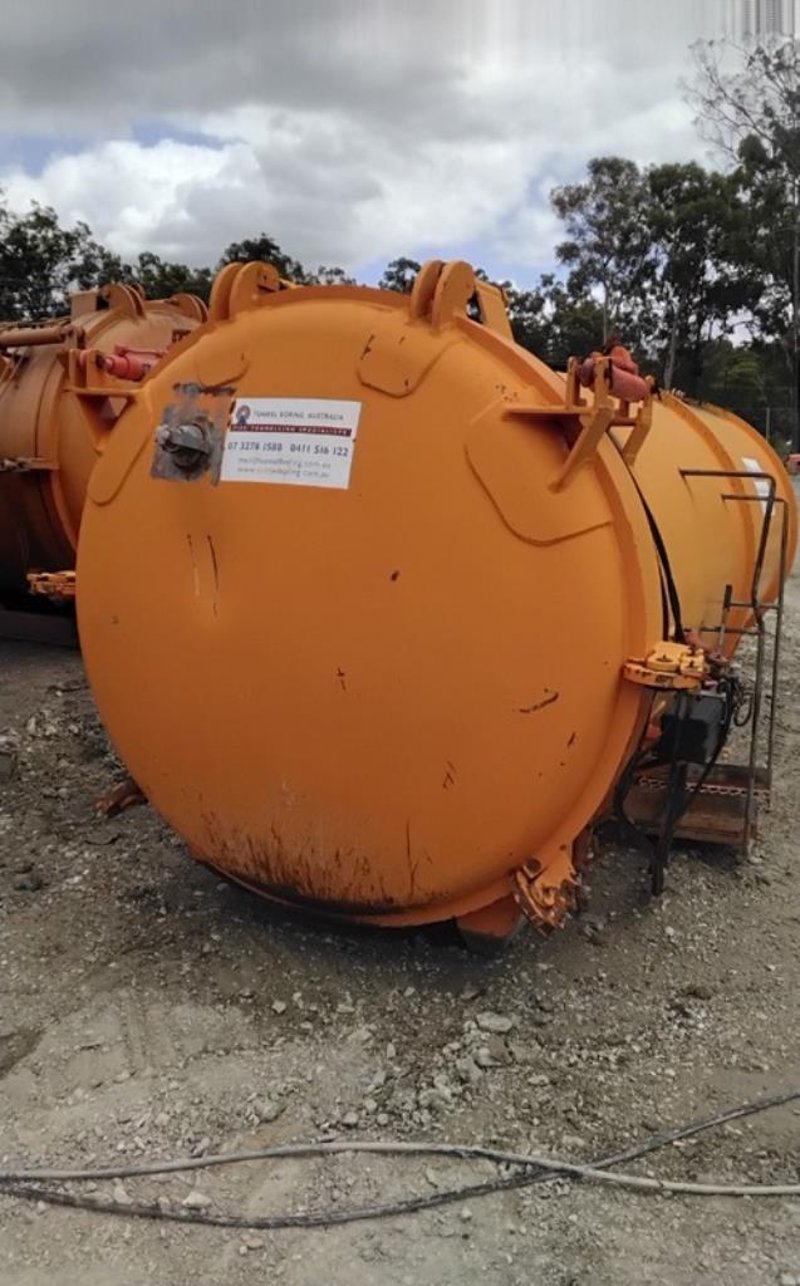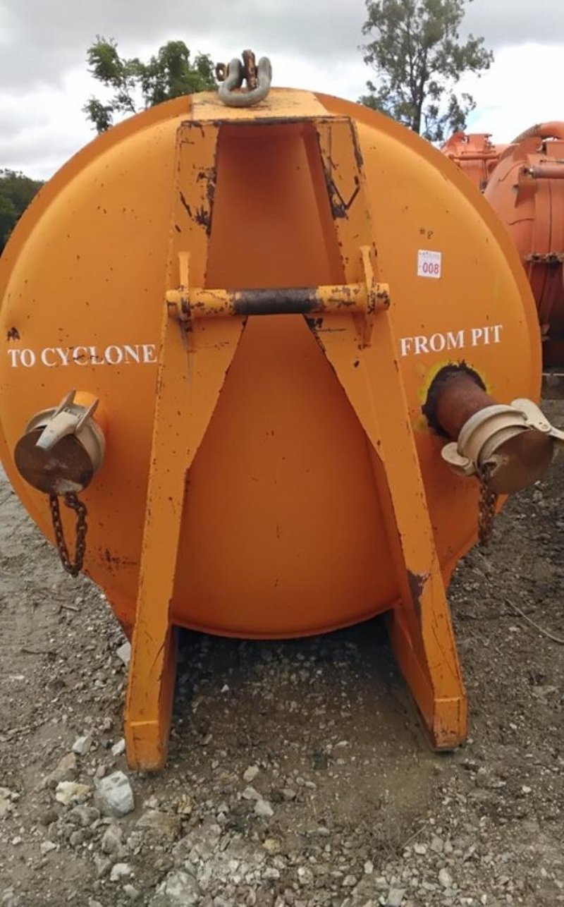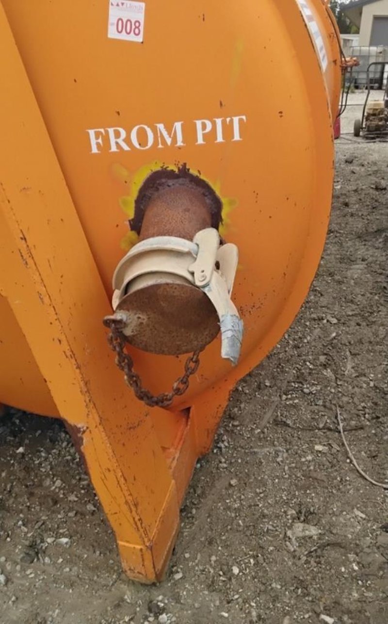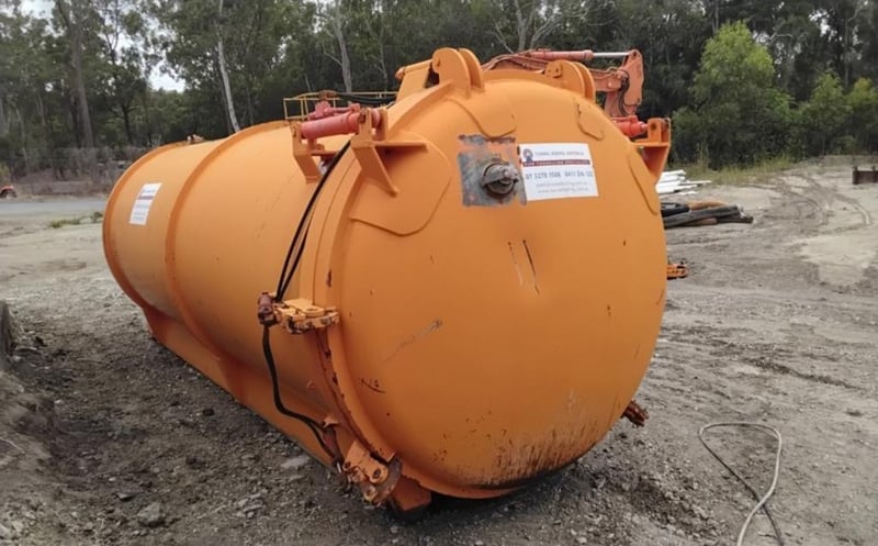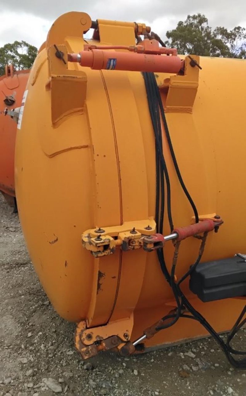 6000 to 8000 litre steel tank on skids, Hook truck lifting capabilities, rear of tank hydraulically opened, two hose coupling on front of tank, pull out steps bottom of tank, Hydraulic pump and levers on side of tank manually operated
