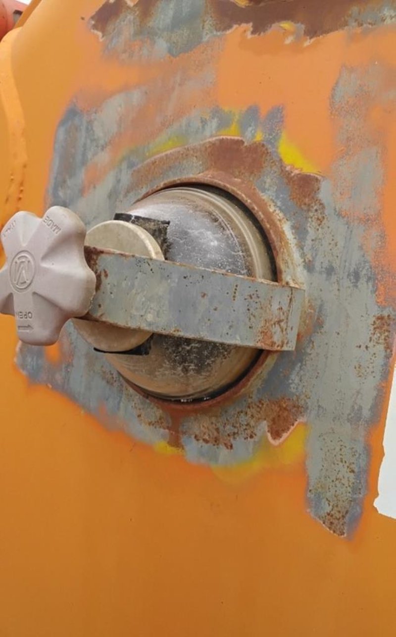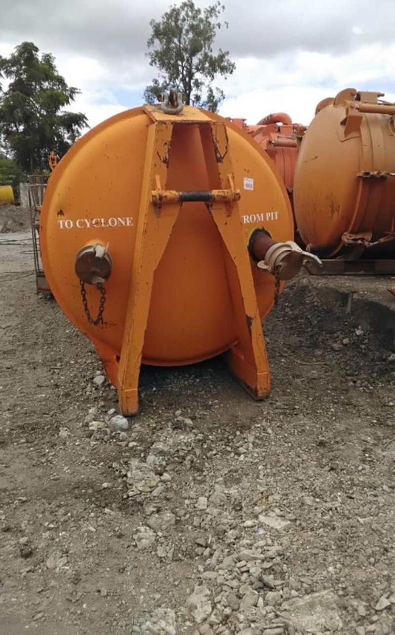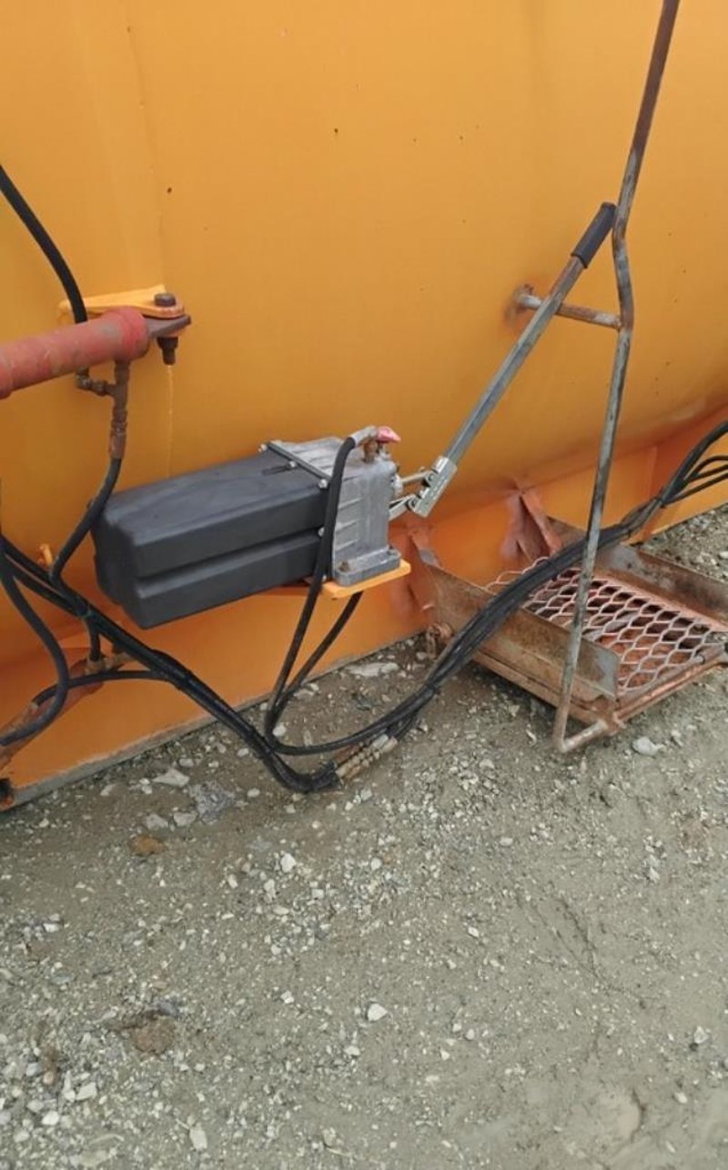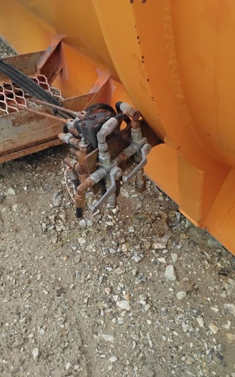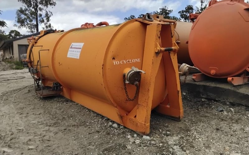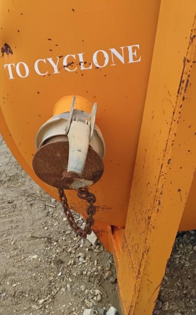 6000 to 8000 litre steel tank on skids, Hook truck lifting capabilities, rear of tank hydraulically opened, two hose coupling on front of tank, pull out steps bottom of tank, Hydraulic pump and levers on side of tank manually operated