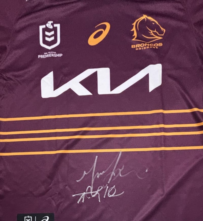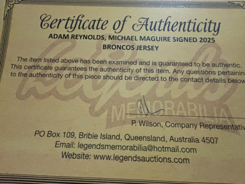 BRISBANE BRONCOS 2025 CAPTAIN & COACH SIGNED JERSEY Brisbane Broncos 2025 Nrl Champions Jersey Signed By Capatinb Adam Reynolds And Coach Michael Maguire. The Jersey Is Size M. The Item Is Accompanied By A Certificate Of Authenticity. +8