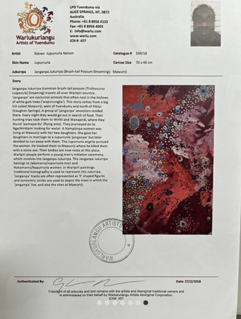 STEVEN JUPURRURLA NELSON (1978)Acrylic On Linen Title: Janganpa Jukurrpa (Brush-Tail Possum Dreaming) 2018 Image Size: 76 x 45.5cmFrame Size: Stretched Signature Details: Signed Verso Accompanied by a Certificate of Authenticity Condition: Good - Refer To Images Steven Jupurrurla Nelson Was Born 30 August 1978 In Alice Springs, Nt. He Is A Lifelong Resident Of Yuendumu, A Remote Aboriginal Community Approximately 300 Kilometres Northwest Of Alice Springs On The Tanami Road. He Was Raised By His Late Mother, Nora Nungarrayi Jurrah, And His Stepfather, Frankie Jakamarra Nelson.Steven Began Painting At Warlukurlangu Artists Aboriginal Corporation In Late 2014 After Working At The Art Centre For Some Time. He Typically Paints ‘Janganpa Jukurrpa’ (Brush-Tail Possum Dreaming). His Country Is Located Near Nyirrpi, Another Remote Aboriginal Community Approximately 170 Kilometres West Of Yuendumu. His Mother’S And Grandfather’S Country Is Also In This Area. His Mother’S Country Includes The Nginyirrpalangu Outstation. His Grandfather, Banjo Patterson, Owned Country That Includes Ngarupalya.CROSSDOCK0+2