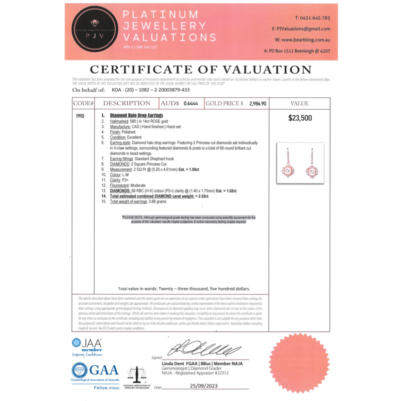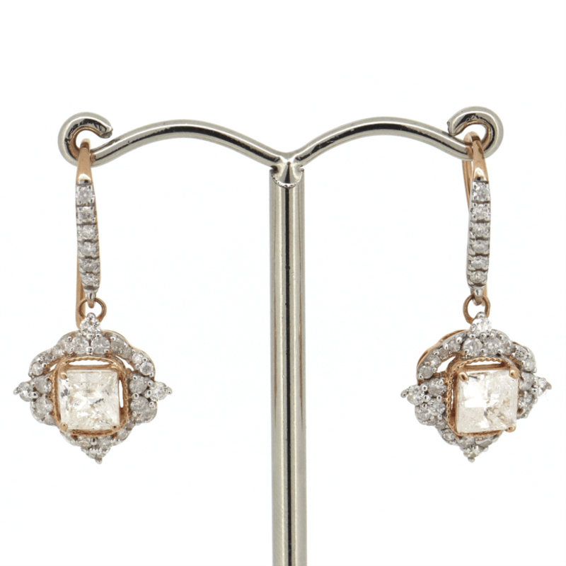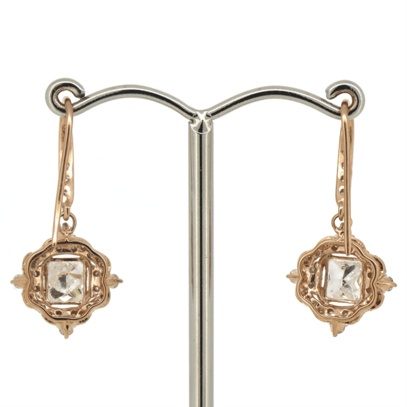 14K ROSE GOLD AND DIAMOND, VINTAGE INSPIRED DROP EARRINGS. THE CENTRES FEATURE, 2 SQUARE PRINCESS CUT, DIAMONDS (1.50CT TDW, L-M COLOUR, P3> CLARITY), 4 CLAW SET. ENCOMPASSING THE DESIGN ARE, 68 ROUND BRILLIANT CUT, DIAMONDS (1.02CT TDW, H-K COLOUR, P2+ CLARITY), BEAD SET. THE EARRINGS HAVE SHEPHERD HOOKS.