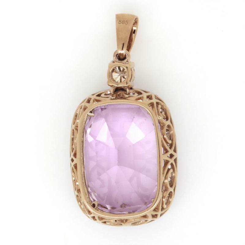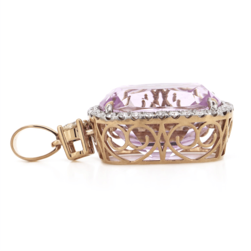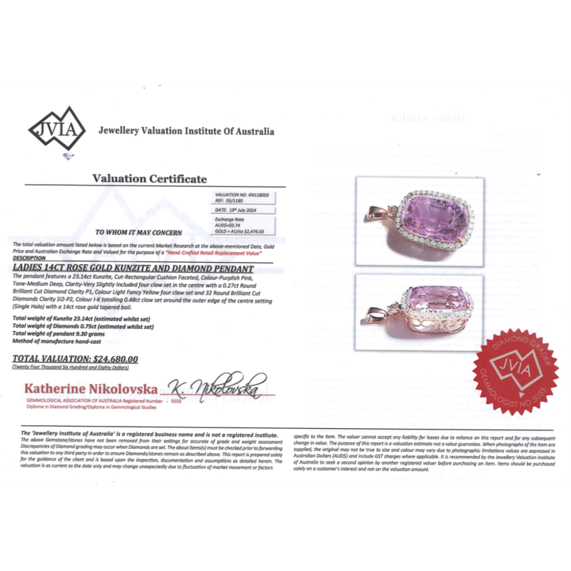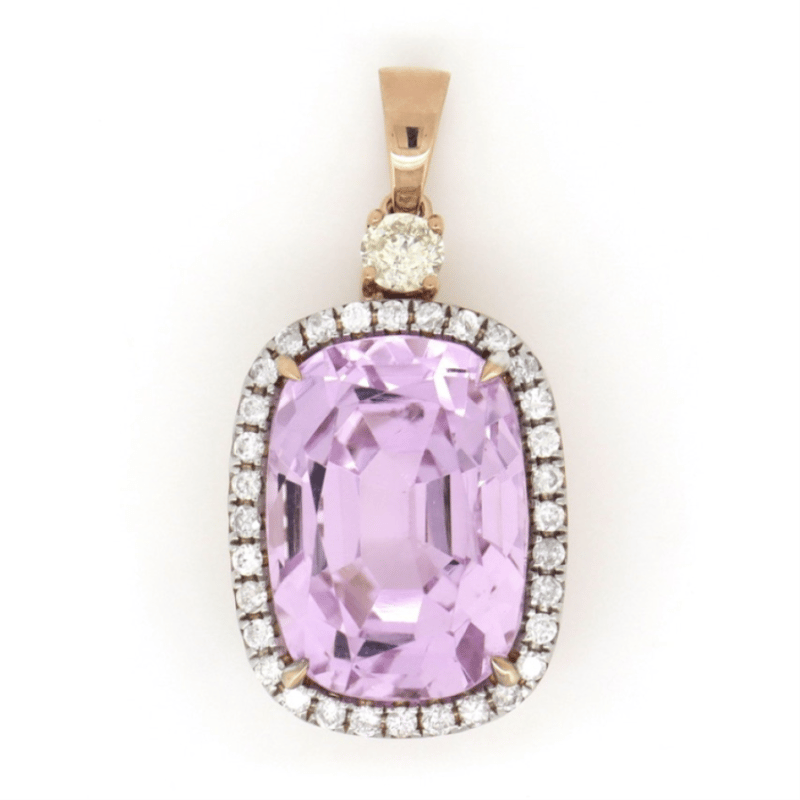14K ROSE GOLD, 23.14CT KUNZITE AND DIAMOND, STATEMENT PENDANT. THE CENTRE FEATURES, ONE RECTANGULAR CUSHION FACETED CUT, MEDIUM DEEP PURPLISH-PINK, KUNZITE (23.41CT, VERY SLIGHTLY INCLUDED), CLAW SET. SURROUNDING THE CENTRE IN A HALO ARE, 32 ROUND BRILLIANT CUT, DIAMONDS (0.48CT TDW, I-K COLOUR, SI2-P2 CLARITY), CLAW SET. ACCOMPANIED BY, ONE ROUND BRILLIANT CUT, LIGHT FANCY YELLOW, DIAMOND (0.27CT, P1 CLARITY), 4 CLAW SET. Valuations Provided by an Independent Third-Party Professional Not Directly Associated With Lloyds Auctions at AUD $24680This valuation has been conducted by an independent third-party professional. The valuation amount is an assessment by the issuing valuer and does not reflect the auction value of the item. Any inquiries regarding the valuation should be directed to the issuing valuer (refer to contact details on the certificate), as Lloyds Auctions has no affiliation or influence over the valuation, the valuer, or the stated amount. Condition: Good - Refer Images 0645857+5217