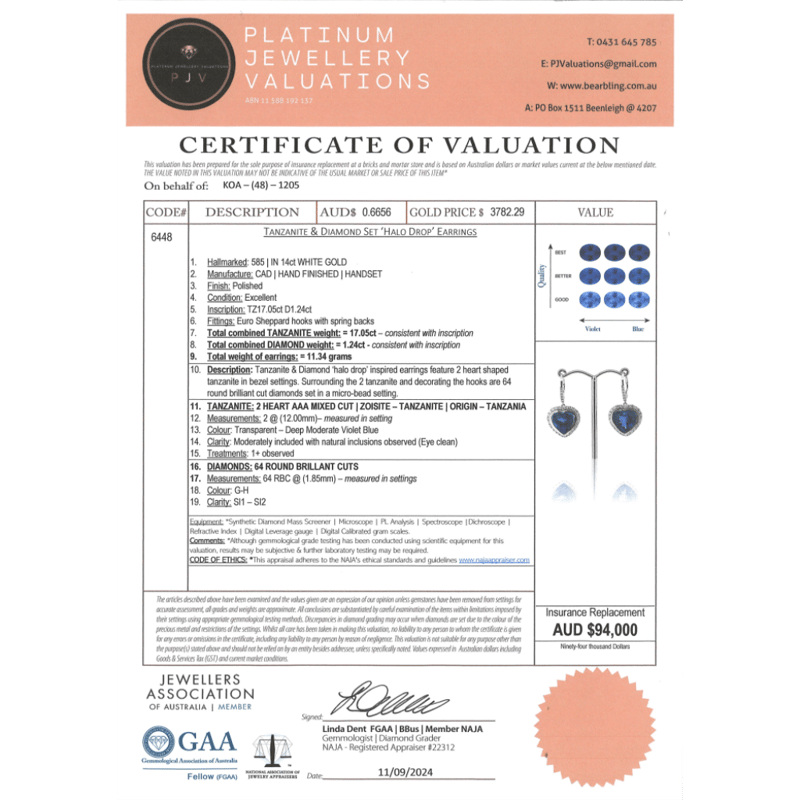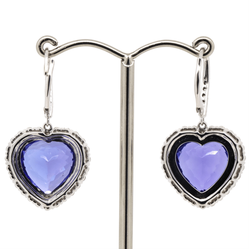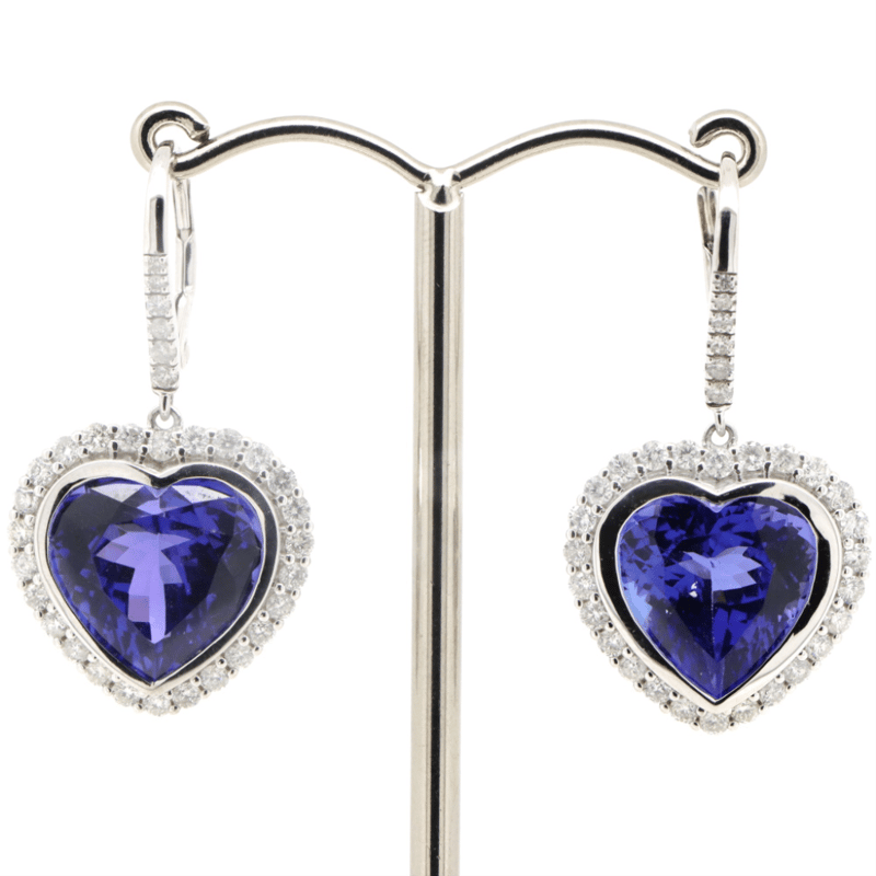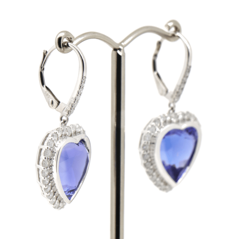 14K WHITE GOLD, TANZANITE AND DIAMOND, HALO DROP EARRINGS. THE CENTRES FEATURE, 2 HEART MIXED CUT, DEEP MODERATE VIOLET-BLUE, TANZANITES (17.05CT TSW, EYE CLEAN-MODERATELY INCLUDED), BEZEL SET. SURROUNDING THE CENTRES IN HALOS AND DECORATING THE HOOKS ARE, 64 ROUND BRILLIANT CUT, DIAMONDS (1.24CT TDW, G-H COLOUR, SI1-SI2CLARITY), MICRO-BEAD SET. THE EARRINGS FEATURE SHEPPARD HOOKS WITH SPRING BACKS.