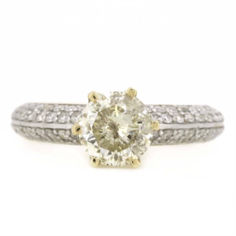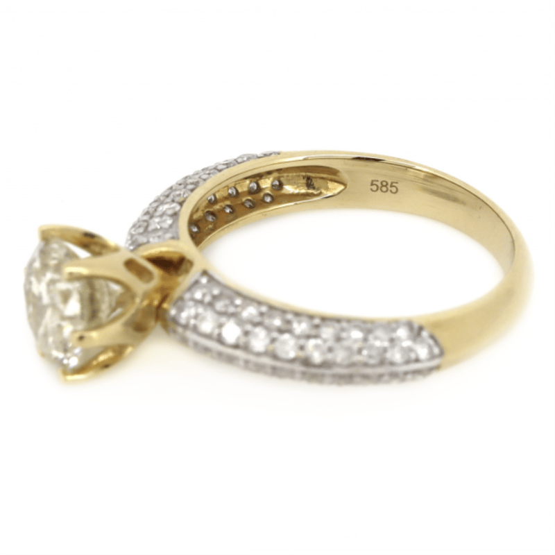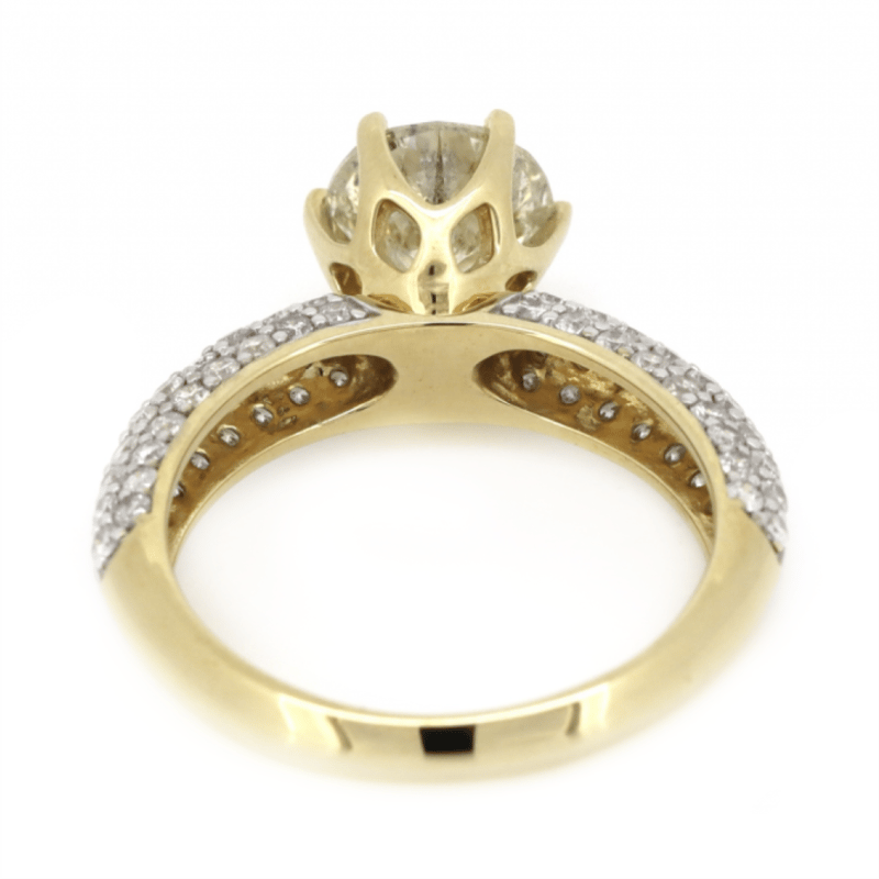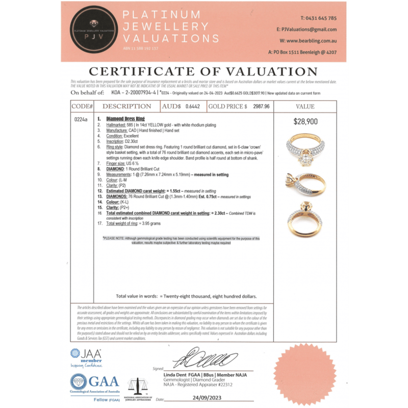 14K YELLOW GOLD AND DIAMOND, CLASSIC RING. THE CENTRE FEATURES, ONE ROUND BRILLIANT CUT, DIAMOND (1.55CT, L-M COLOUR, P2 CLARITY), 6 CLAW SET. DECORATING THE BAND ARE, 76 ROUND BRILLIANT CUT, DIAMONDS (0.75CT TDW, K-L COLOUR, P2+ CLARITY), BEAD SET. RING SIZE M.