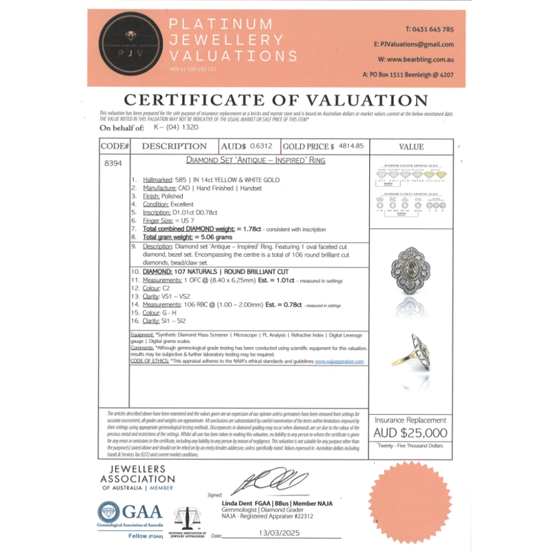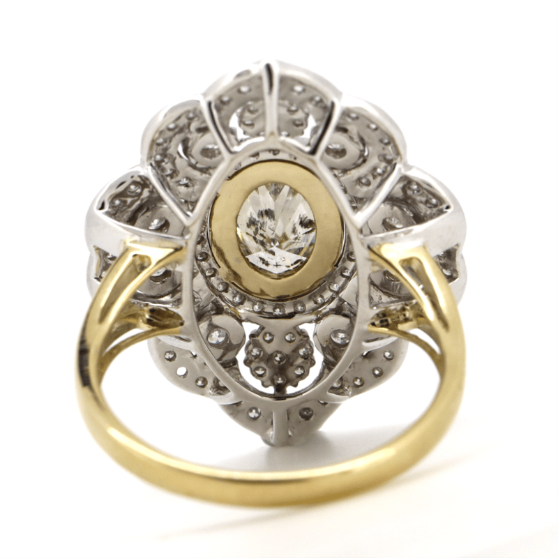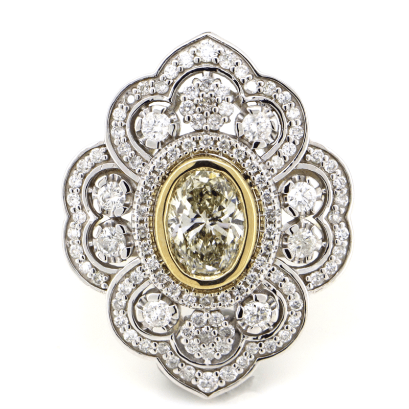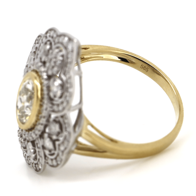14K YELLOW/WHITE GOLD, CHAMPAGNE DIAMOND, ANTIQUE INSPIRED RING. THE CENTRE FEATURES, ONE OVAL FACETED CUT, DIAMOND (1.01CT, C2 COLOUR, VS1-VS2 CLARITY), BEZEL SET. ENCOMPASSING THE CENTRE ARE, 106 ROUND BRILLIANT CUT, DIAMONDS (0.78CT TDW, G-H COLOUR, SI1-SI2 CLARITY), BEAD/CLAW SET. RING SIZE N 1/2.