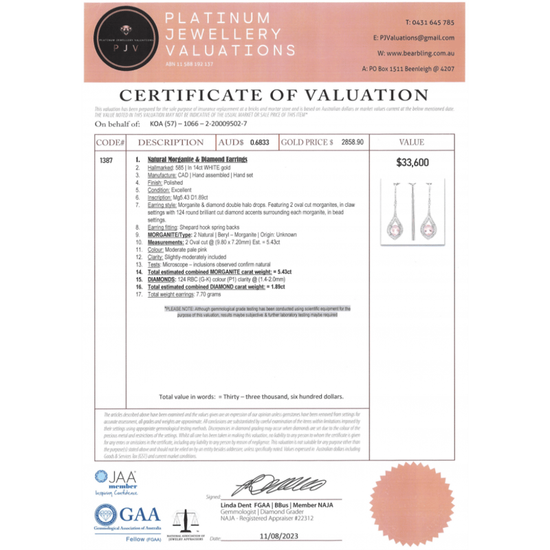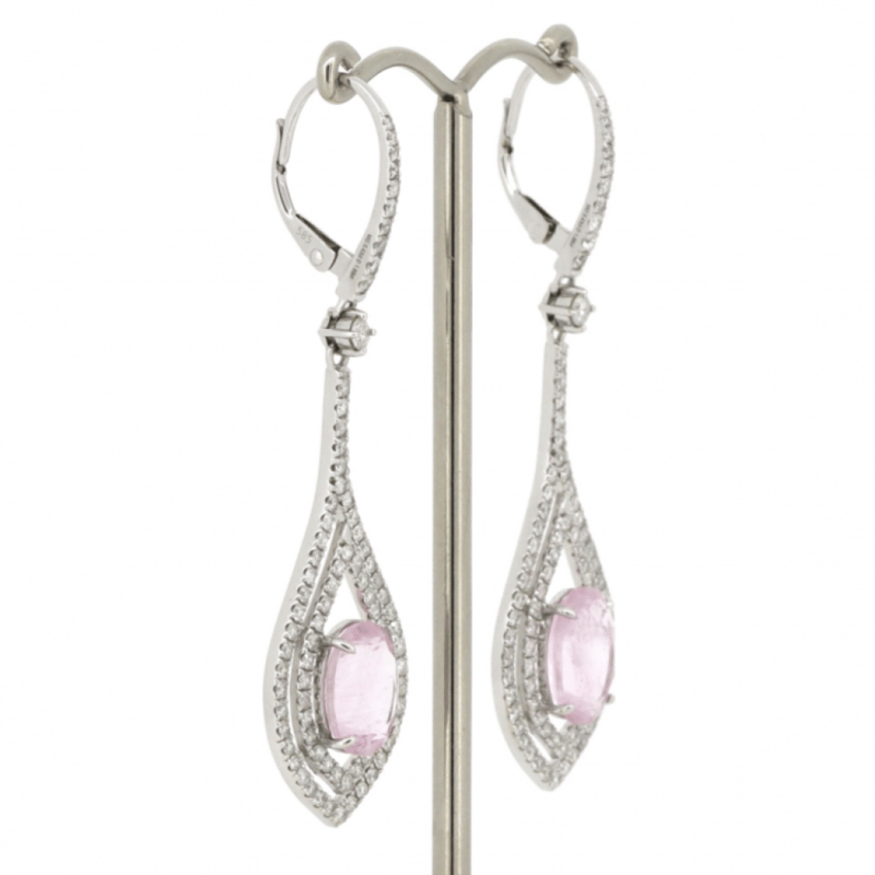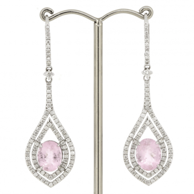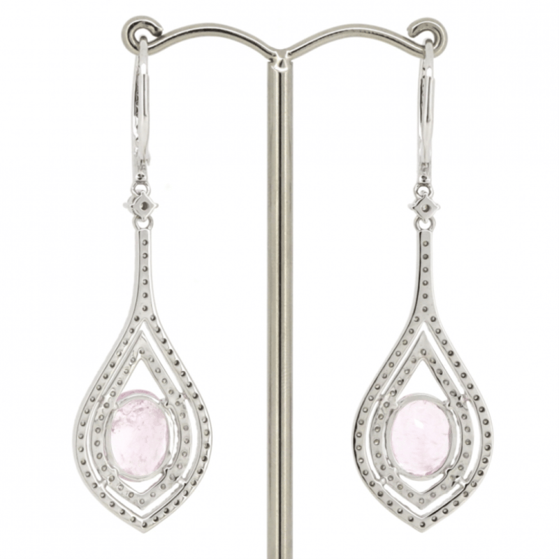 14K WHITE GOLD, MORGANITE AND DIAMOND, DOUBLE HALO DROP EARRINGS. THE DESIGN FEATURES, 2 OVAL CUT, MODERATE PALE PINK, MORGANITES (5.43CT TSW, SLIGHTLY-MODERATELY INCLUDED), CLAW SET. ACCOMPANYING THE DESIGN ARE, 124 ROUND BRILLIANT CUT, DIAMONDS (1.89CT TDW, G-K COLOUR, P1 CLARITY), BEAD SET. THE EARRINGS HAVE SHEPARD HOOK SPRING BACKS.