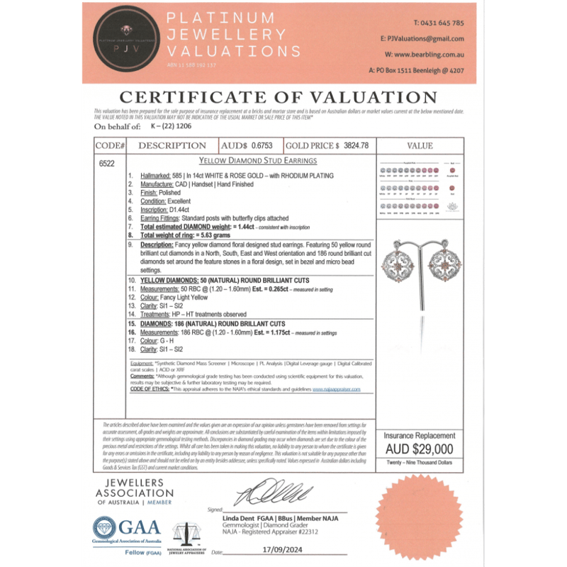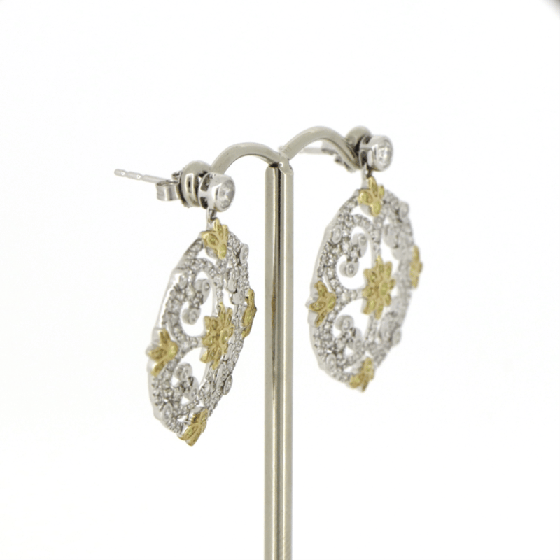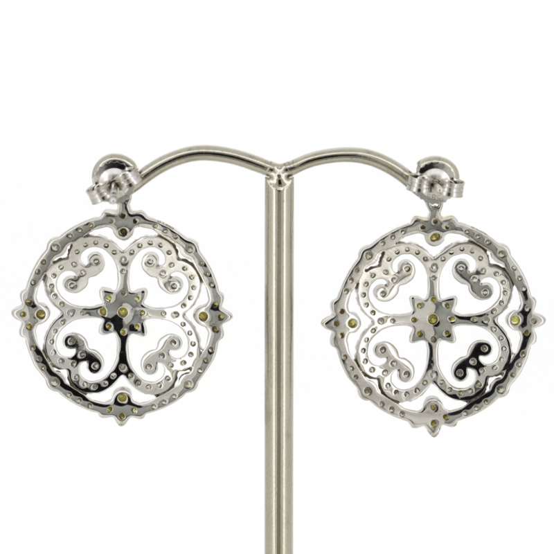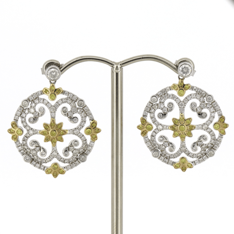 14K WHITE/YELLOW GOLD, FANCY YELLOW DIAMOND AND DIAMOND, DECORATIVE STUD EARRINGS. THE DESIGN FEATURES, 50 ROUND BRILLIANT CUT, LIGHT FANCY YELLOW, DIAMONDS (0.265CT TDW, SI1-SI2 CLARITY), BEZEL/MICRO-BEAD SET. ENCOMPASSING THE DESIGN ARE, 186 ROUND BRILLIANT CUT, DIAMONDS (1.175CT TDW, G-H COLOUR, SI1-SI2 CLARITY), MICRO-BEAD, BEZEL SET. THE EARRINGS HAVE POST BACKS, WITH 14K WHITE GOLD BUTTERFLY CLASPS.