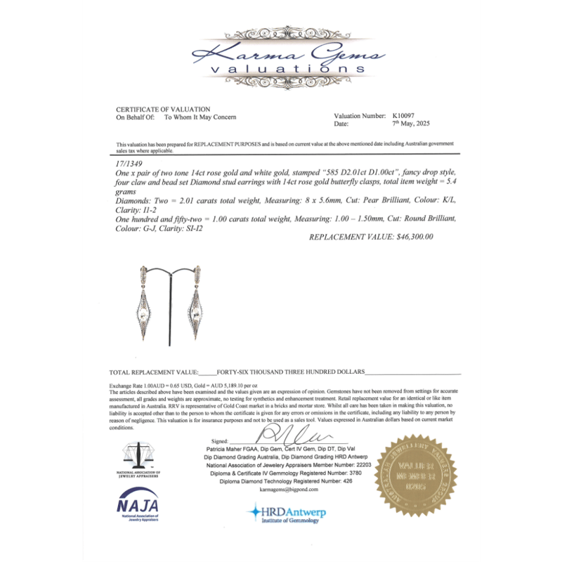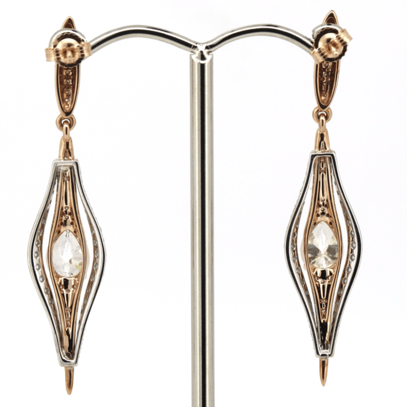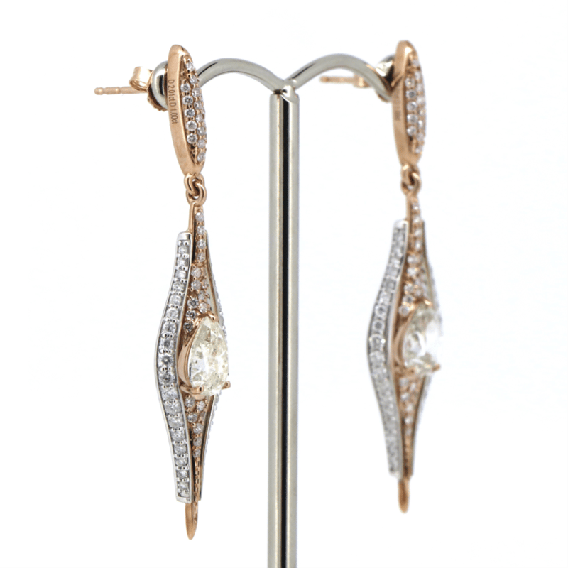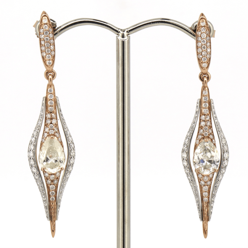 14K ROSE/WHITE GOLD AND DIAMOND, DROP EARRINGS. THE EARRINGS FEATURE, 2 PEAR BRILLIANT CUT, DIAMONDS (2.01CT TDW, K-L COLOUR, I1-2 CLARITY), 4 CLAW SET. ACCOMPANYING THE CENTRE IN A FANCY DROP ARE, 152 ROUND BRILLIANT CUT, DIAMONDS (1.00CT TDW, G-J COLOUR, SI-I2 CLARITY), BEAD SET. THE EARRINGS HAVE POST BACKS WITH 14K ROSE GOLD BUTTERFLIES.