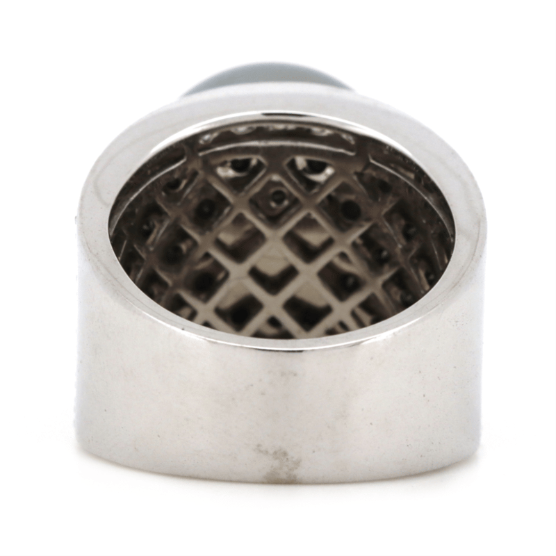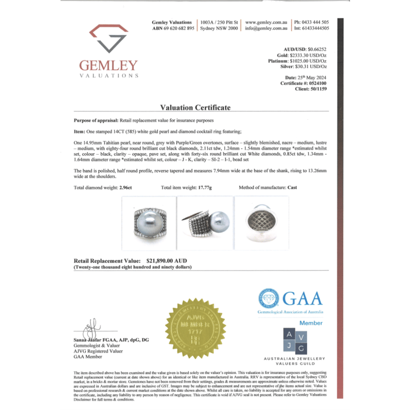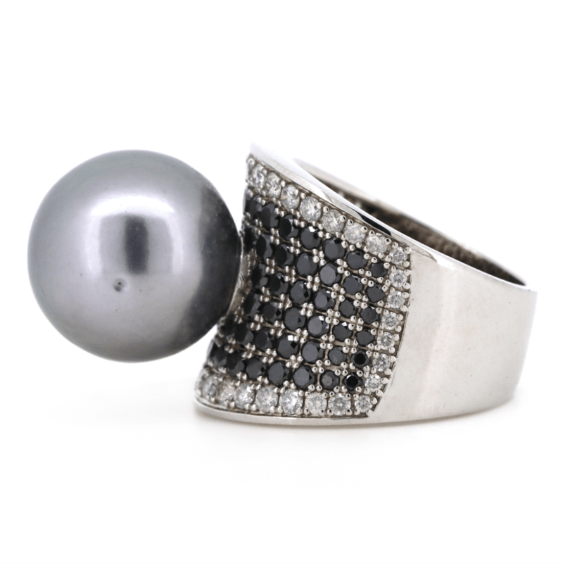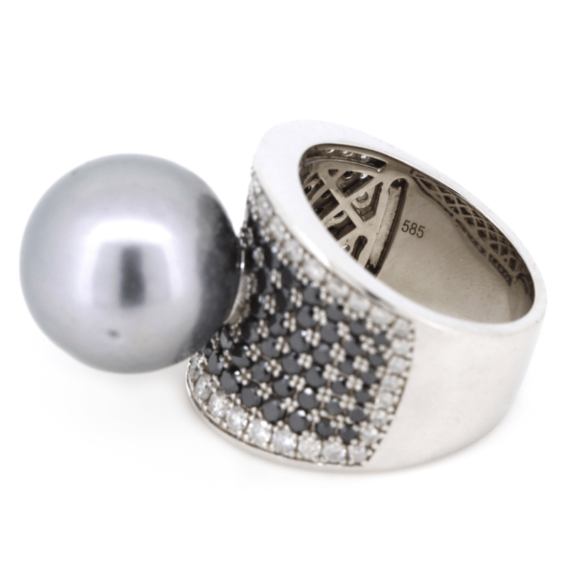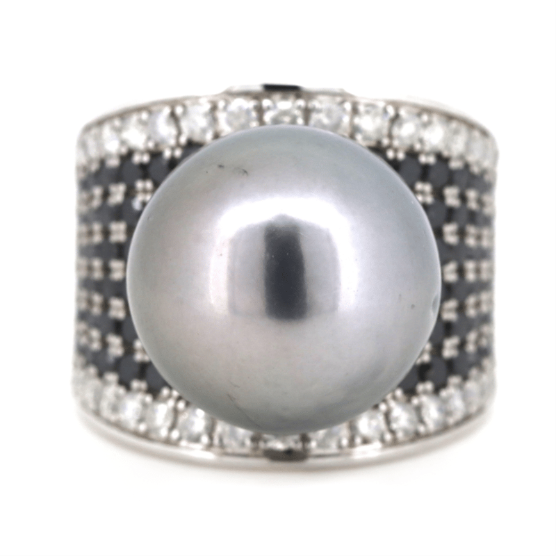 14K WHITE GOLD, GREY CULTURED TAHITIAN PEARL AND BLACK DIAMOND, CLUSTER RING. THE CENTRE FEATURES, ONE NEAR ROUND, GREY WITH GREEN/PURPLE OVERTONES, CULTURED TAHITIAN PEARL (14.95MM SIZE, MEDIUM LUSTRE). ENCOMPASSING THE DESIGN ARE, 84 ROUND BRILLIANT CUT, BLACK, DIAMONDS (2.11CT TDW, OPAQUE), PAVE SET. BORDERING THE DESIGN ARE, 46 ROUND BRILLIANT CUT, DIAMONDS (0.85CT TDW, J-K COLOUR, SI2-I1 CLARITY), BEAD SET. RING SIZE O.