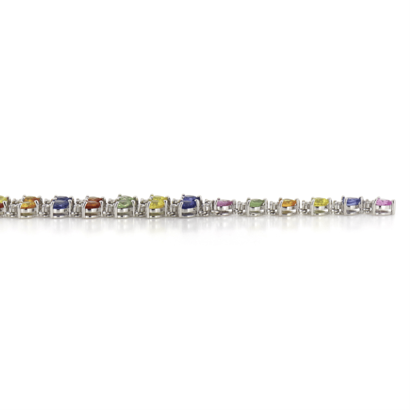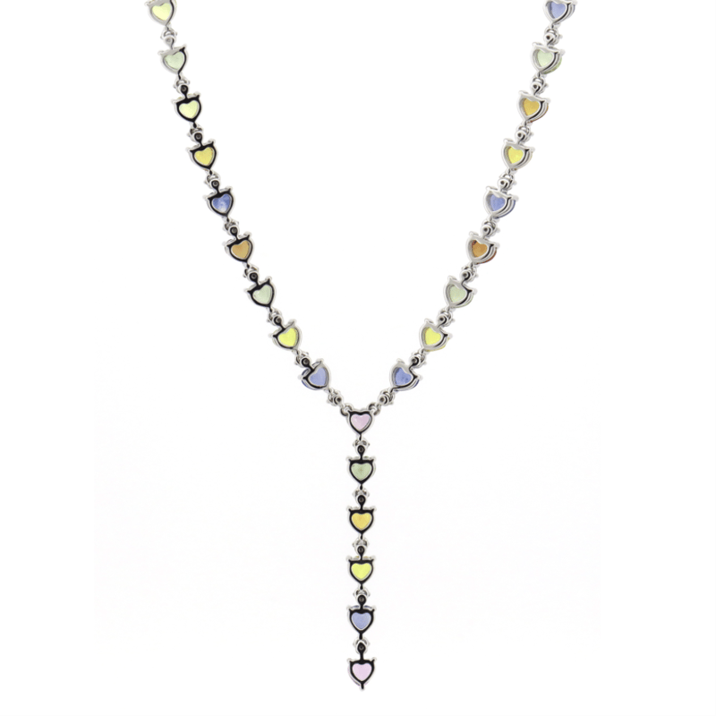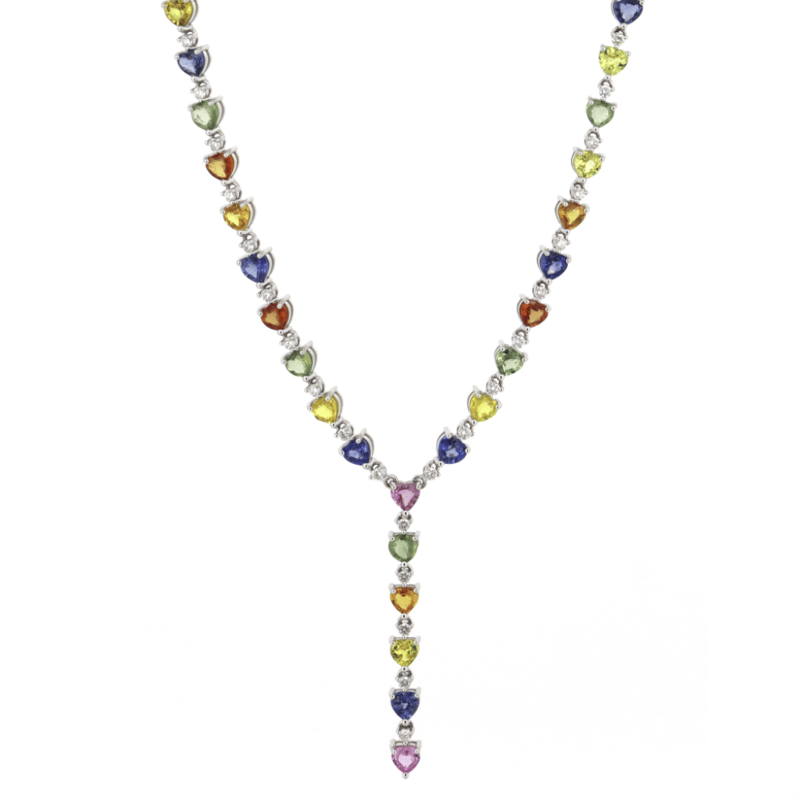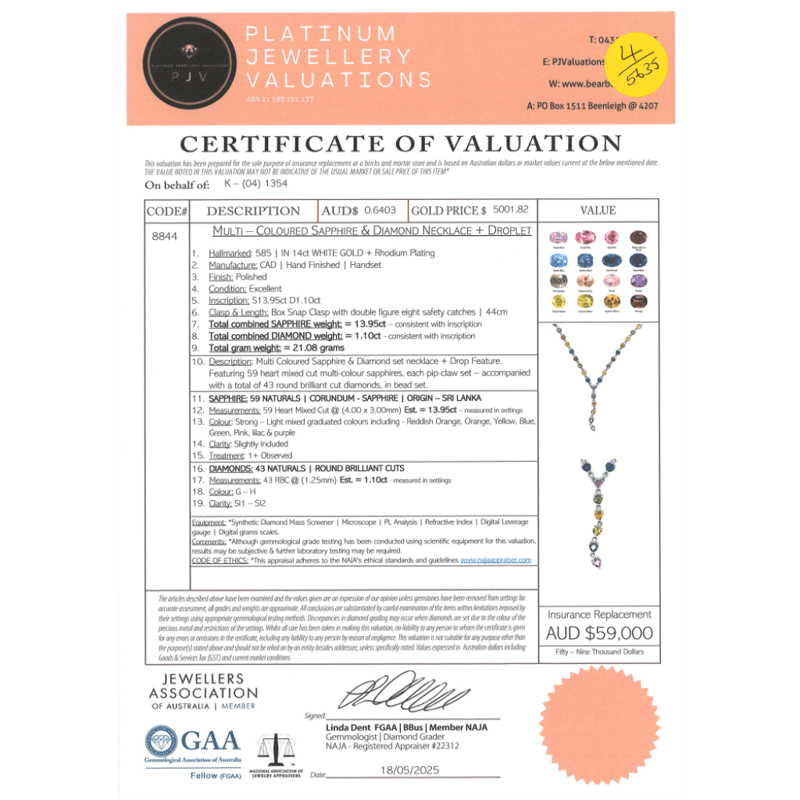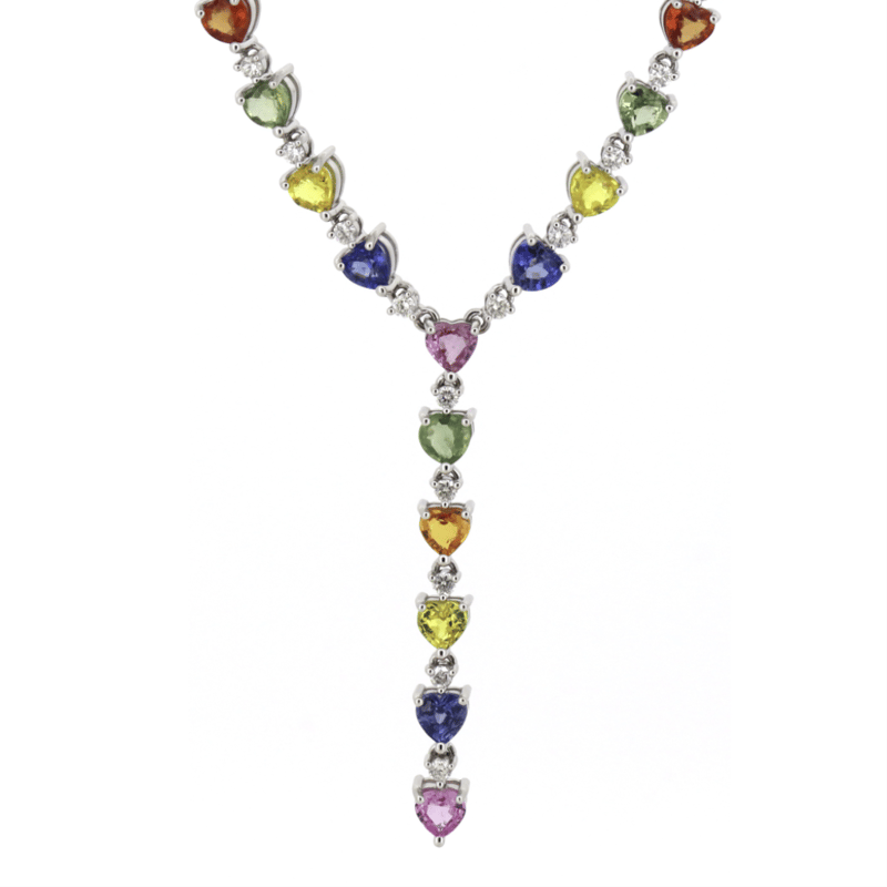 14K WHITE GOLD, 13.95CT TSW MULTI-COLOURED CEYLON SAPPHIRE AND DIAMOND, DROP NECKLACE. THE DESIGN FEATURES, 59 MIXED CUT, REDDISH-ORANGE, ORANGE, YELLOW, BLUE, GREEN, PINK, LILAC, PURPLE, SAPPHIRES (13.95CT TSW, SLIGHTLY INCLUDED, TREATMENT OBSERVED), PIP CLAW SET. ENCOMPASSING THE SAPPHIRES ARE, 43 ROUND BRILLIANT CUT, DIAMONDS (1.10CT TDW, G-H COLOUR, SI1-SI2 CLARITY), BEAD SET. THE NECKLACE FEATURES A BOX SNAP CLASP AND IS 44CM. Valuations Provided by an Independent Third-Party Professional Not Directly Associated With Lloyds Auctions at AUD $$59,000.00This valuation has been conducted by an independent third-party professional. The valuation amount is an assessment by the issuing valuer and does not reflect the auction value of the item. Any inquiries regarding the valuation should be directed to the issuing valuer (refer to contact details on the certificate), as Lloyds Auctions has no affiliation or influence over the valuation, the valuer, or the stated amount. Condition: Good - Refer Images 0645877+5218