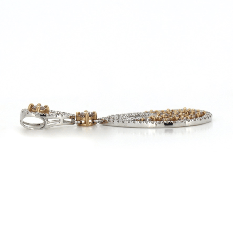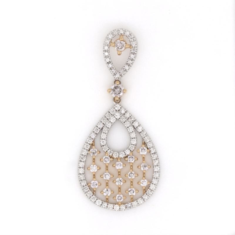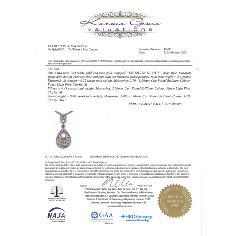 14K WHITE/ROSE GOLD, FANCY PINK DIAMOND AND DIAMOND, DECORATIVE SLIDER PENDANT. THE DESIGN FEATURES, 17 ROUND BRILLIANT CUT, FANCY LIGHT PINK, DIAMONDS (0.22CT TDW, SI CLARITY), CLAW SET IN ROSE GOLD. COMPLIMENTING THE DESIGN ARE, 15 ROUND BRILLIANT CUT, FANCY LIGHT PINK, DIAMONDS (0.43CT TDW, SI CLARITY), CLAW DROP STYLE SET. ENCOMPASSING THE DESIGN IN A HALOS AND DECORATING THE BAIL ARE, 78 ROUND BRILLIANT CUT, DIAMONDS (0.68CT TDW, G-H COLOUR, SI-I1 CLARITY), MICRO-BEAD/PIP-CLAW SET.