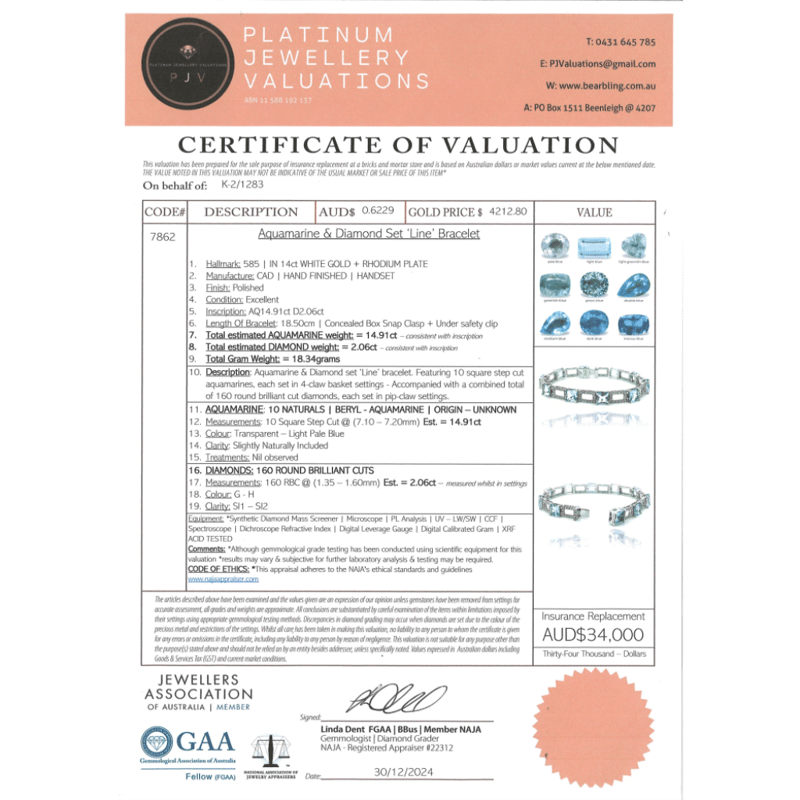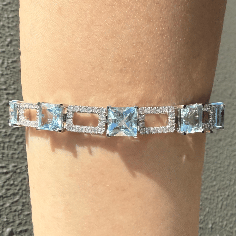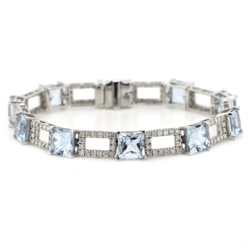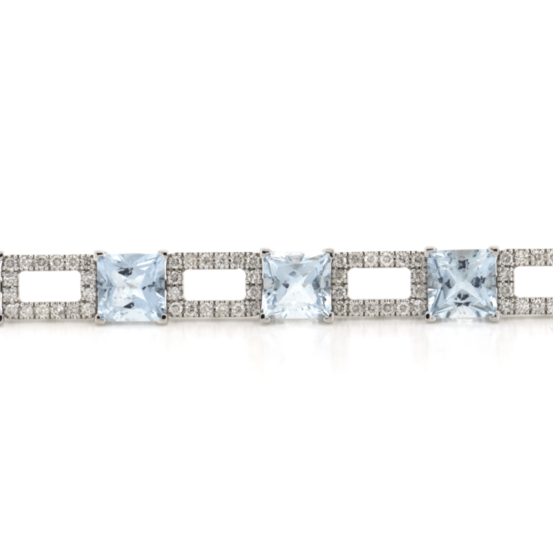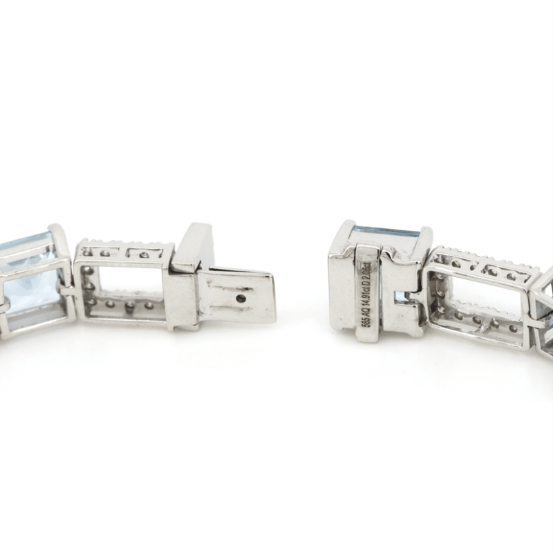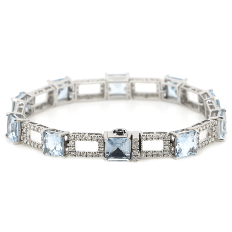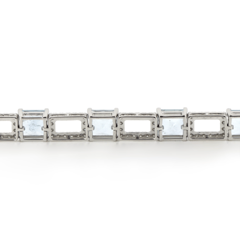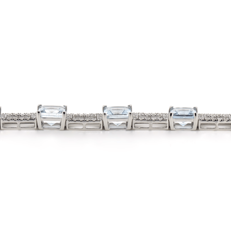 14K WHITE GOLD, AQUAMARINE AND DIAMOND, LINE BRACELET. THE DESIGN FEATURES, 10 CUSHION CUT, LIGHT PALE BLUE, AQUAMARINES (14.91CT TSW, SLIGHTLY INCLUDED), 4 CLAW SET. SURROUNDING THE DESIGN ARE, 160 ROUND BRILLIANT CUT, DIAMONDS (2.06CT TDW, G-H COLOUR, SI1-SI2 CLARITY), 4 CLAW SET. BRACELET HAS A BOX SNAP CLASP WITH DOUBLE FIGURE 8 SAFETY. BRACELET LENGTH IS 18CM.