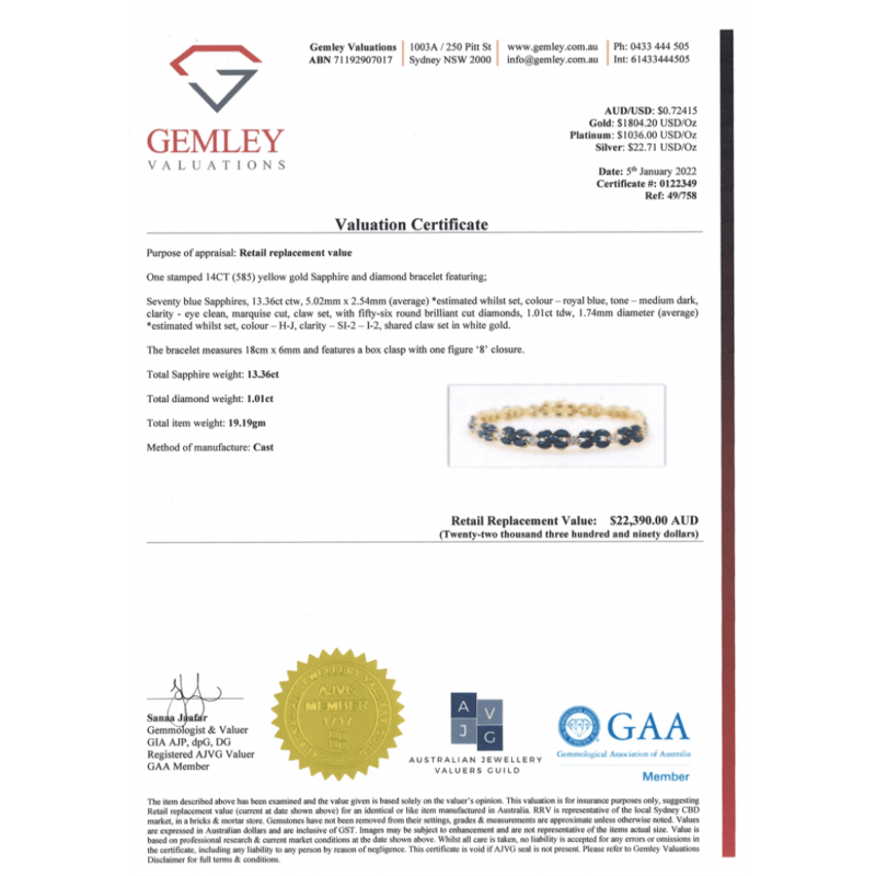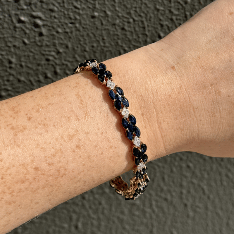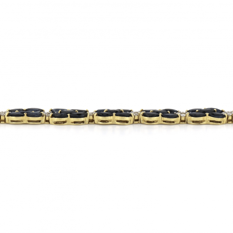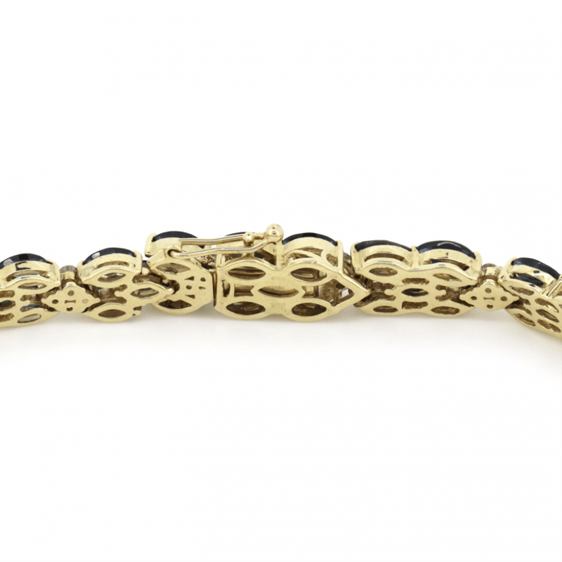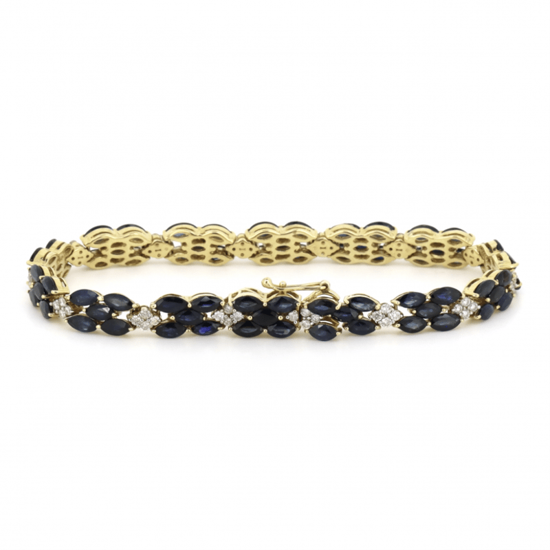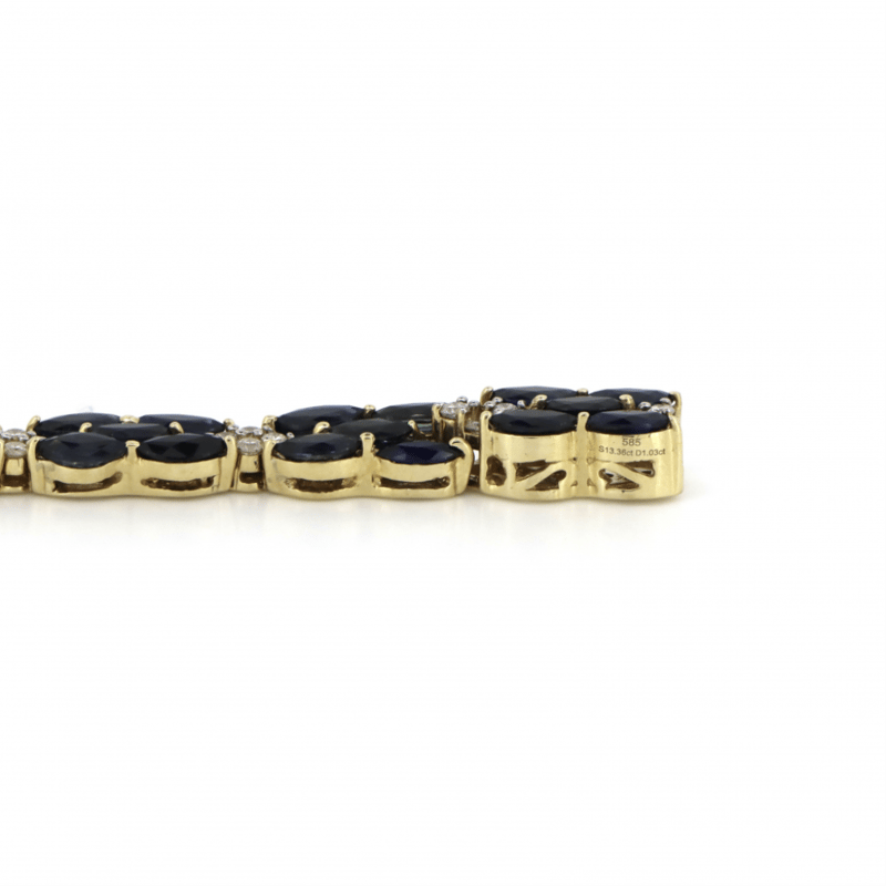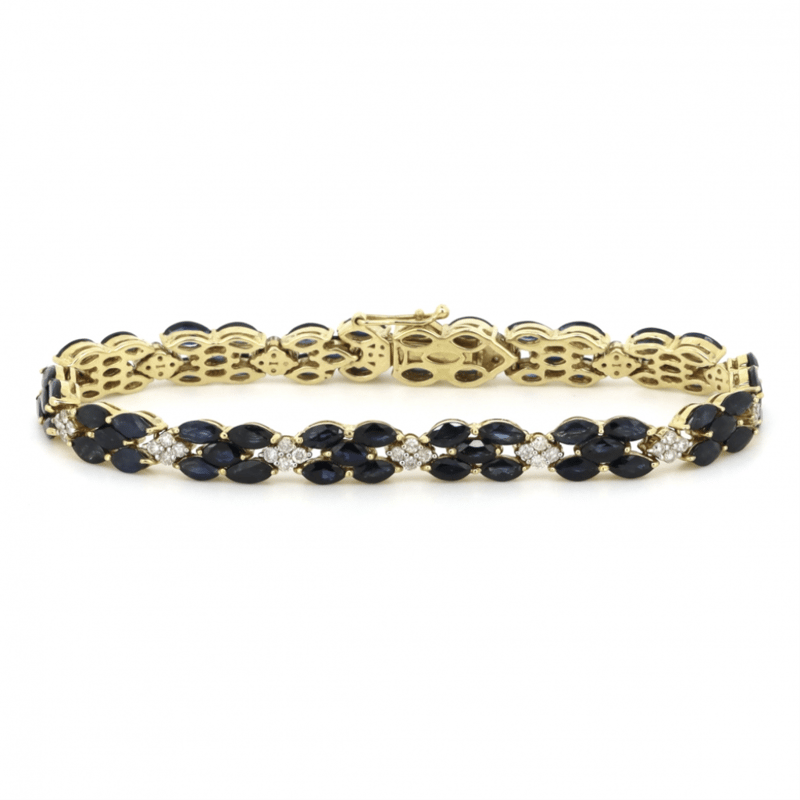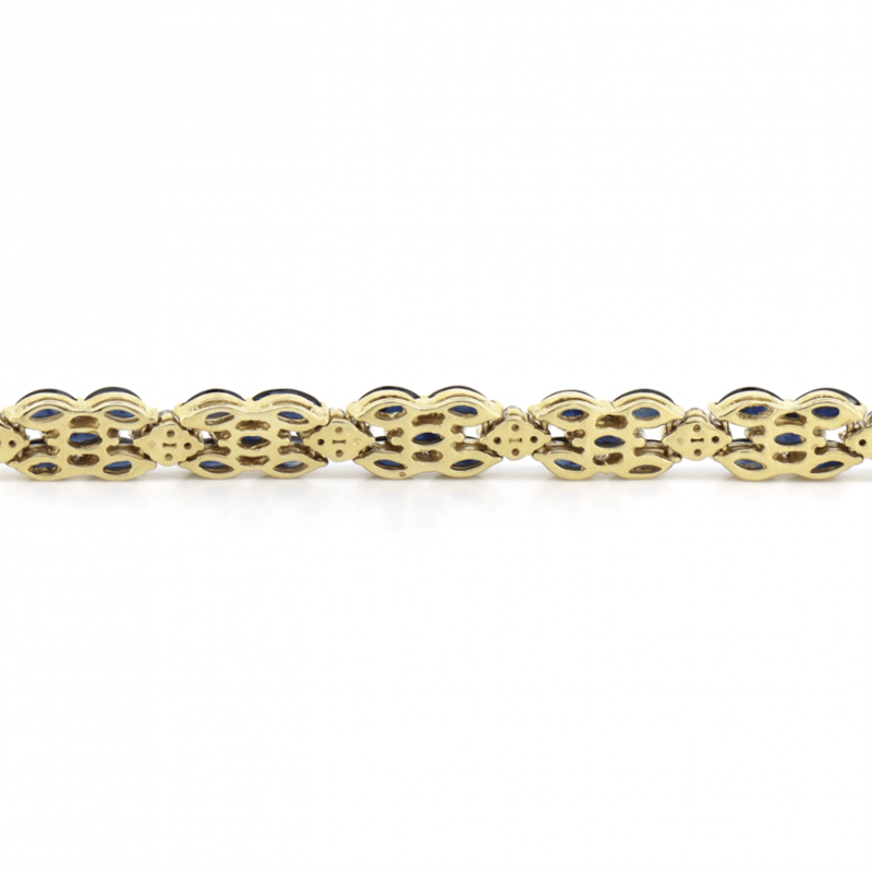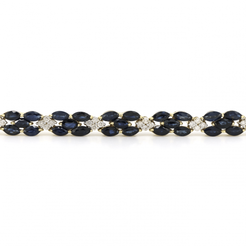 14K YELLOW GOLD, BLUE SAPPHIRE AND DIAMOND, DECORATIVE LINE BRACELET. THE BRACELET FEATURES, 70 MARQUISE CUT, ROYAL BLUE, SAPPHIRES (13.36CT TSW, EYE CLEAN CLARITY), CLAW SET. ALTERNATING BETWEEN SECTIONS ARE, 56 ROUND BRILLIANT CUT, DIAMONDS (1.01CT TDW, H-J COLOUR, SI2-I2 CLARITY), SHARED CLAW SET IN WHITE GOLD. THE BRACELET HAS A BOX LOCK CLASP WITH ONE FIGURE '8' SAFETY LATCH. BRACELET LENGTH IS 18CM.