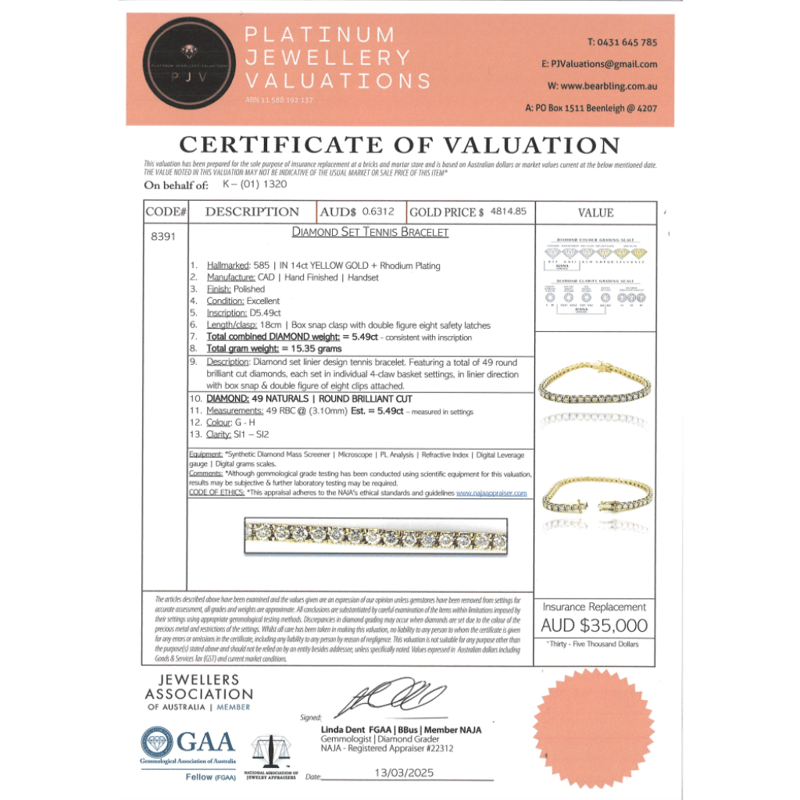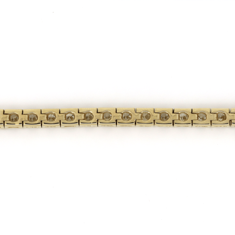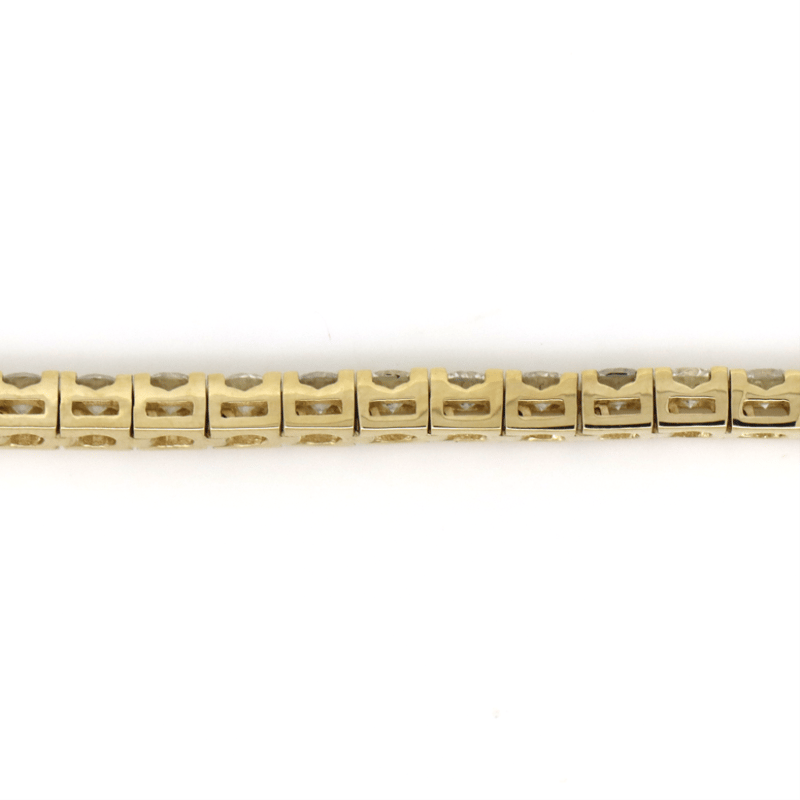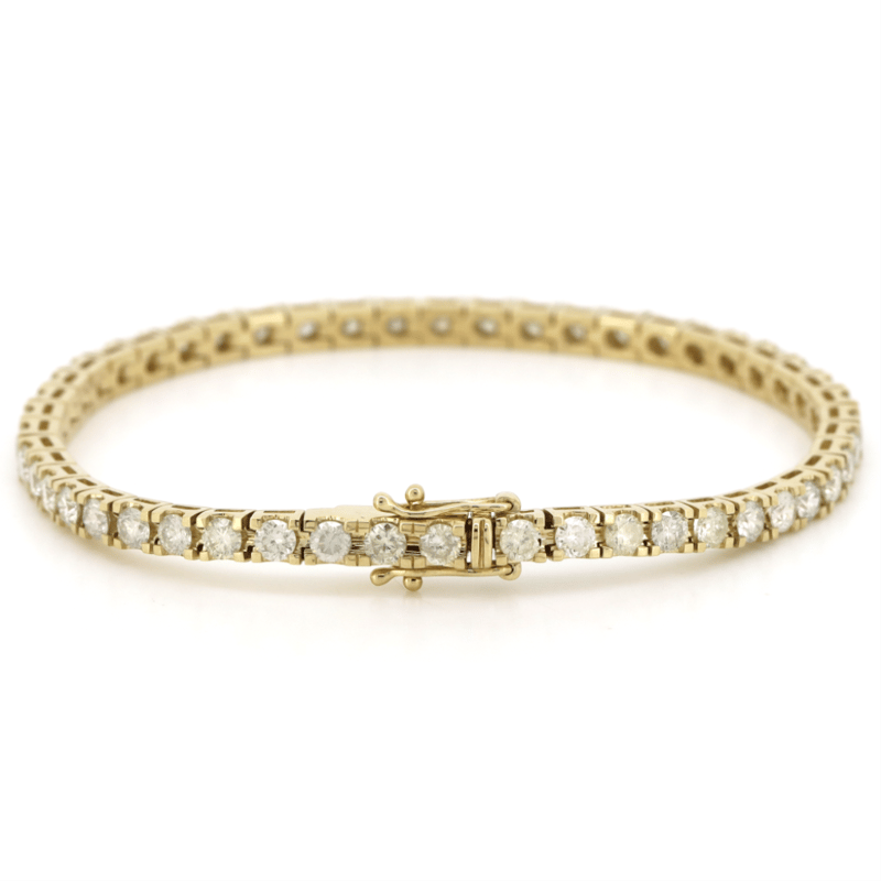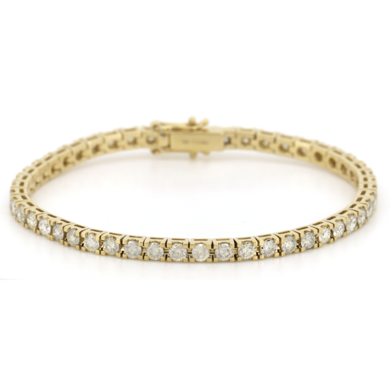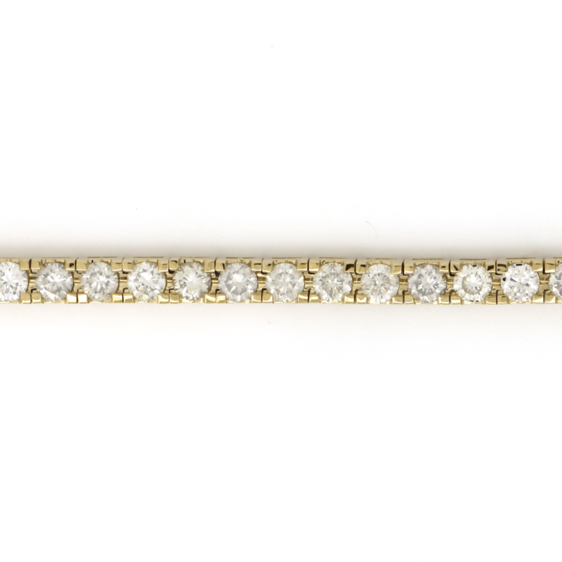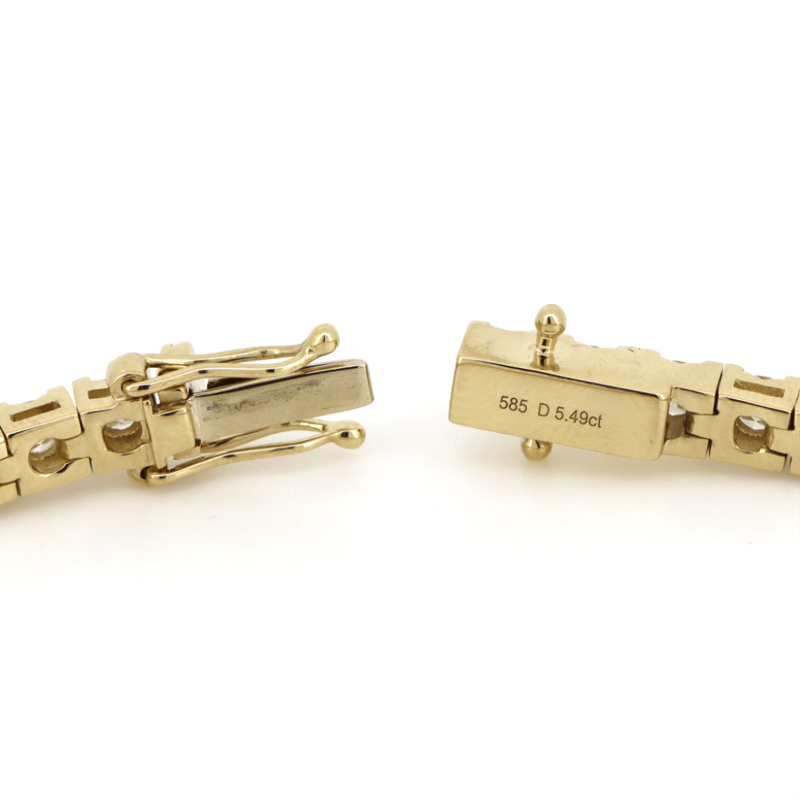 14K YELLOW GOLD, 5.49CT TDW DIAMOND, TENNIS BRACELET. THE DESIGN FEATURES, 49 ROUND BRILLIANT CUT, DIAMONDS (5.49CT TDW, G-H COLOUR, SI1-SI2 CLARITY, ), 4 CLAW SET IN A SINGLE ROW. THE BRACELET HAS A BOX LOCK WITH 2 'FIGURE 8' SAFETY CATCHES. BRACELET LENGTH IS 18.0CM.