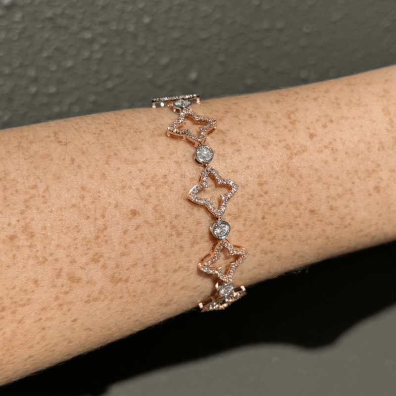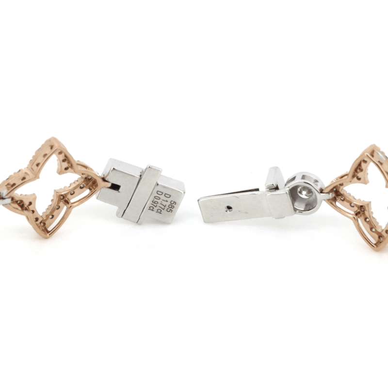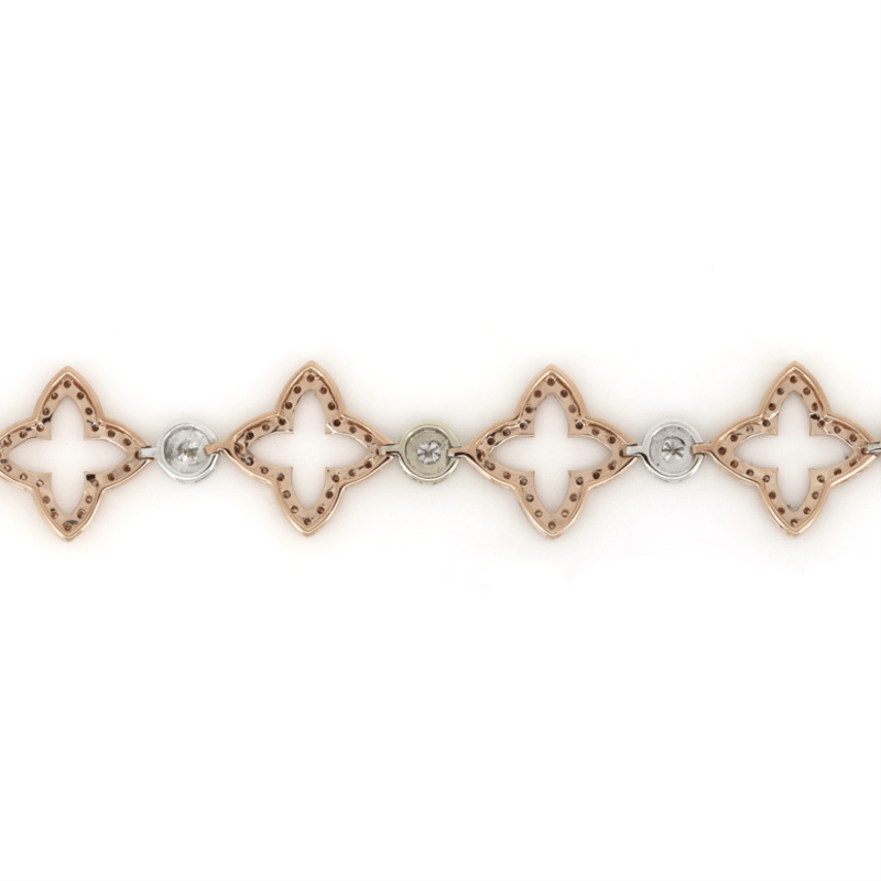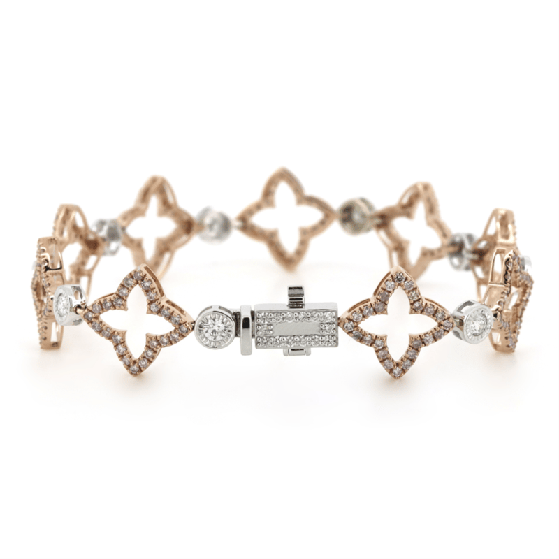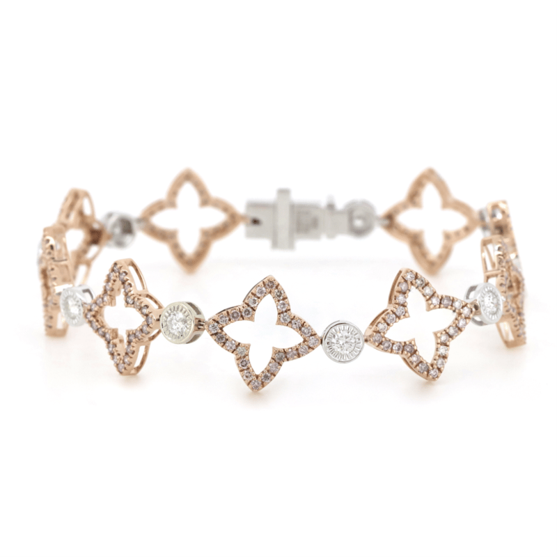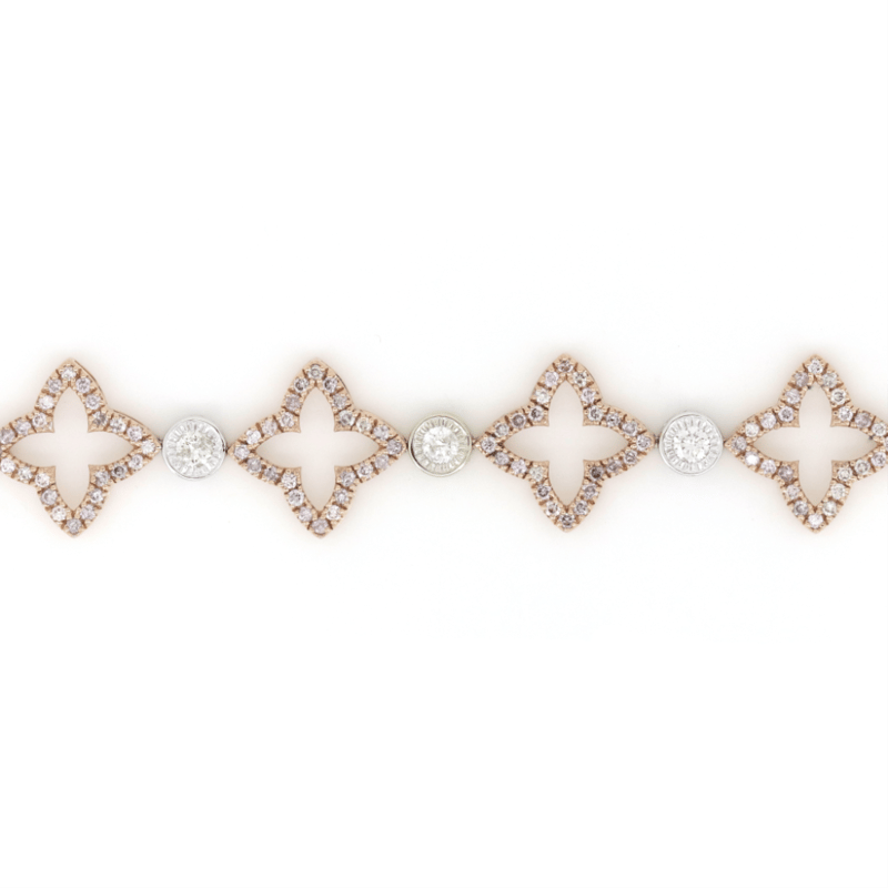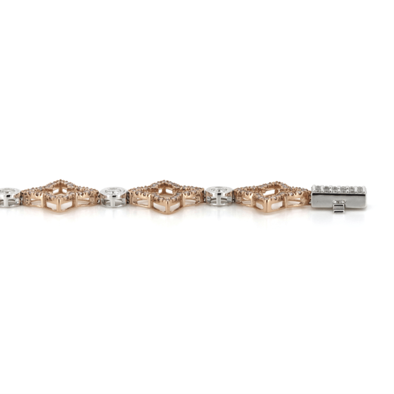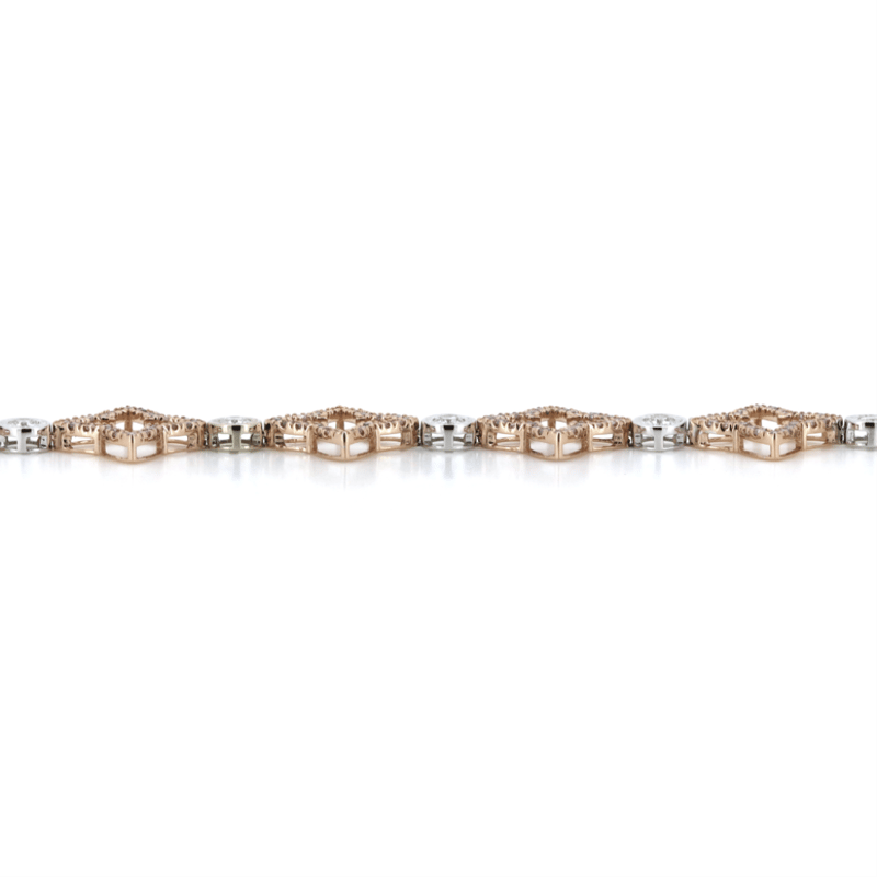 14K WHITE/ROSE GOLD, PINK DIAMOND AND DIAMOND, BRACELET. THE DESIGN FEATURES, 216 ROUND BRILLIANT CUT, BLUSH PINK, DIAMONDS (1.77CT TDW, SI1-SI2 CLARITY), BEAD SET EACH IN ROSE GOLD STARS. ALTERNATING BETWEEN ARE, 23 ROUND BRILLIANT CUT, DIAMONDS (0.97CT TDW, G-H COLOUR, SI1-SI2 CLARITY), BEAD SET. LENGTH IS 19CM. THE BRACELET FEATURES A BOX SNAP CLASP WITH FOLD UNDER SAFETY CLIP.