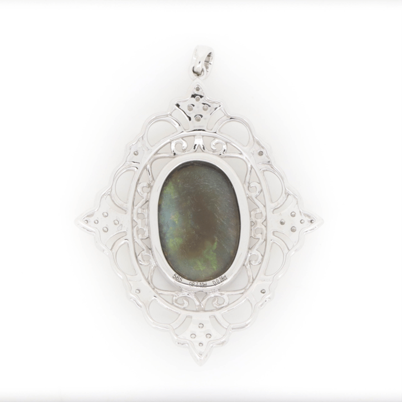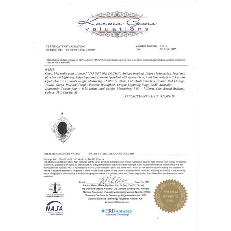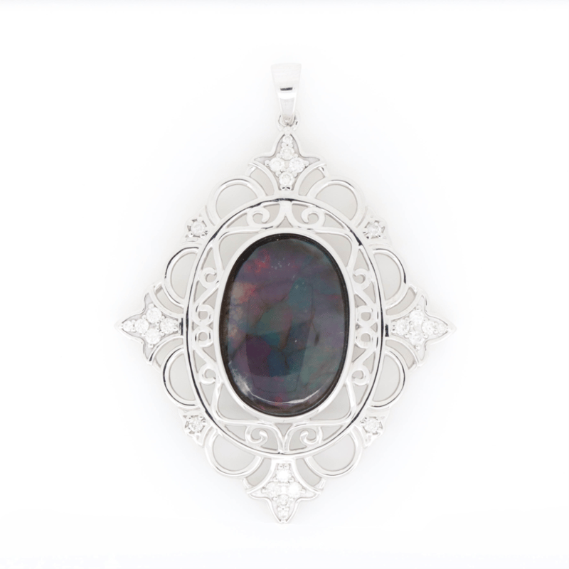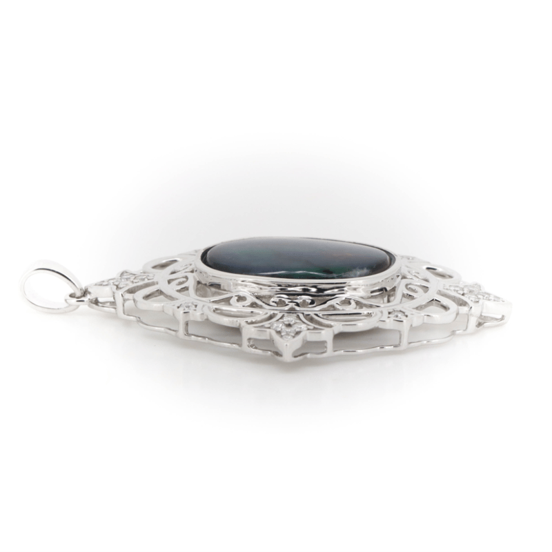 14K WHITE GOLD, 7.10CT LIGHTNING RIDGE OPAL AND DIAMOND, ANTIQUE INSPIRED PENDANT. THE CENTRE FEATURES, ONE OVAL CABOCHON CUT, FLASHES OF RED, ORANGE, YELLOW, GREEN, BLUE AND PURPLE, LIGHTNING RIDGE OPAL (7.10CT) BEZEL SET. ACCOMPANIED BY, 24 ROUND BRILLIANT CUT, DIAMONDS (0.28CT TDW, H-J COLOUR, SI CLARITY) PIP CLAW SET.