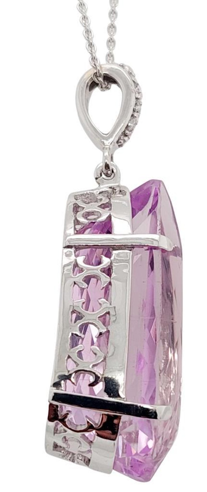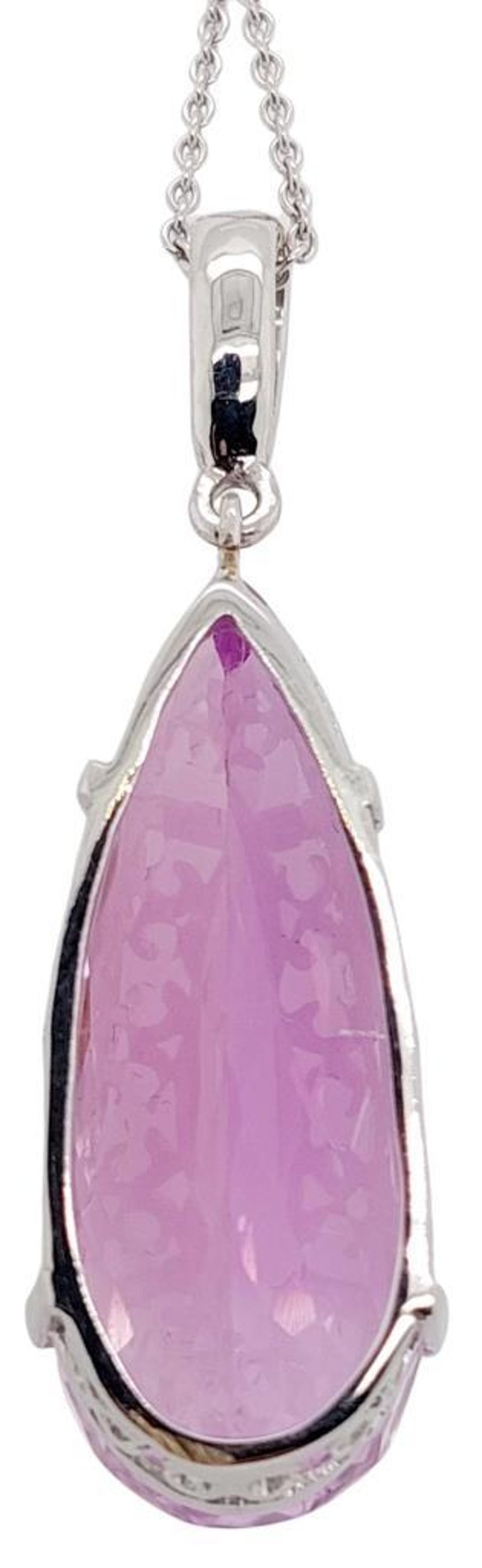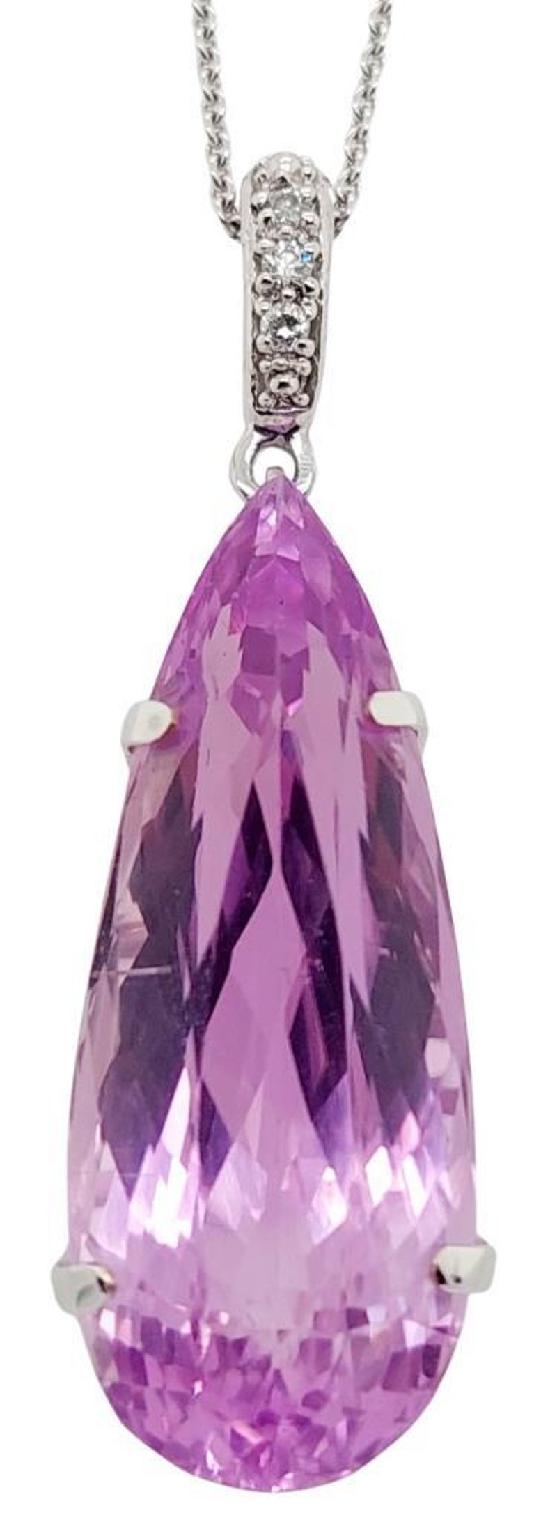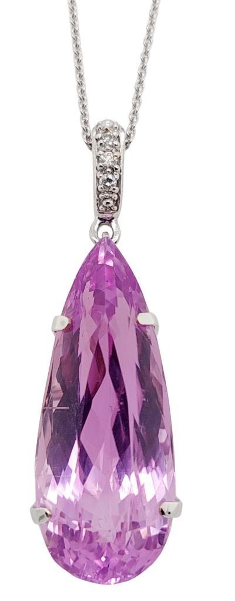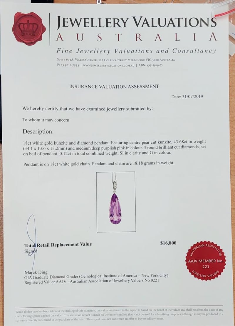 18CT WHITE GOLD KUNZITE AND DIAMOND SET PENDANT ON 18CT WHITE GOLD CHAIN Total Item Weight: 18.18gms This 18Ct White Gold Pendant Features One (1) X Claw Set 43.68Ct Pear Cut Kunzite Measuring 34.1Mm X 13.6Mm X 13.2Mm And Medium Deep Purplish Pink In Colour. This Pendant Also Features Three (3) X Round Brilliant Cut Diamonds Set On Bail, 0.12Ct In Combined Weight, Si In Clarity And G In Colour. This Pendant Is Presented On An 18Ct White Gold Chain. Jewellery Valuations Provided By A Third Party Professional Not Directly Associated With Lloyds Auctions at AUD $16800 This Insurance Valuation has been provided by a registered Jewellery Valuer and is intended for insurance purposes only. The valuation amount has no bearing on the auction value of the item. Any questions regarding the valuation should be directed to the issuing Valuer (refer to contact details on the certificate) as Lloyds have no association or relationship with the Valuer or the valuation amount contained within the valuation. Condition: Excellent- Refer Images 0 162901+26 CROSSDOCK