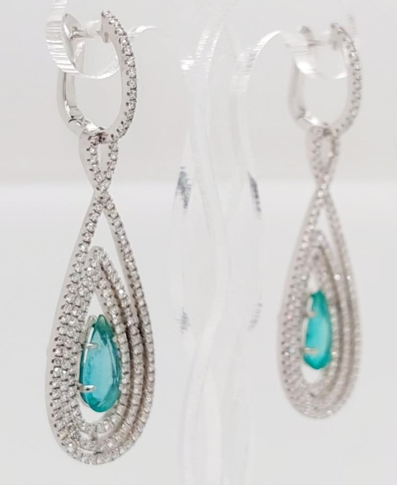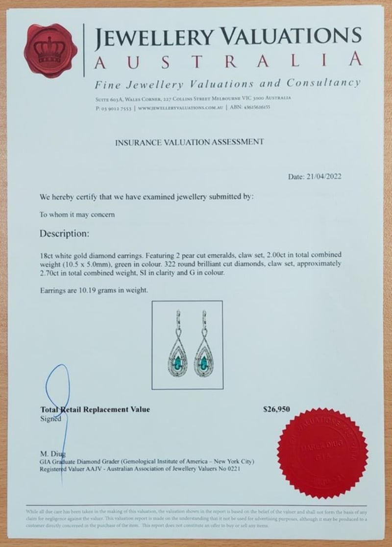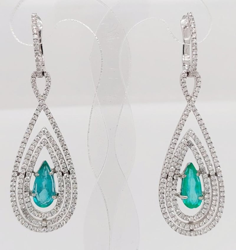 18CT WHITE GOLD EMERALD AND DIAMOND DROP EARRINGS Total Item Weight: 10.19gms These 18Ct White Gold Drop Earrings Feature 2 Pear Cut Claw Set Emeralds, 2.0Ct In Total Combined Weight, Each Measuring 10.5Mm X 5Mm And Green In Colour With 322 Round Brilliant Cut Claw Set Diamonds, 2.70Ct In Total Combined Weight, Si In Clarity And G In Colour. Jewellery Valuations Provided By A Third Party Professional Not Directly Associated With Lloyds Auctions at AUD $26950This Insurance Valuation has been provided by a registered Jewellery Valuer and is intended for insurance purposes only. The valuation amount has no bearing on the auction value of the item. Any questions regarding the valuation should be directed to the issuing Valuer (refer to contact details on the certificate) as Lloyds have no association or relationship with the Valuer or the valuation amount contained within the valuation. Condition: Excellent- Refer Images 0162901+50CROSSDOCK