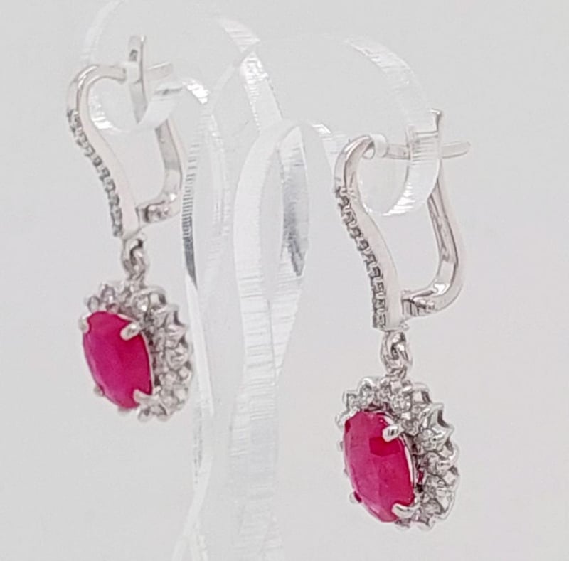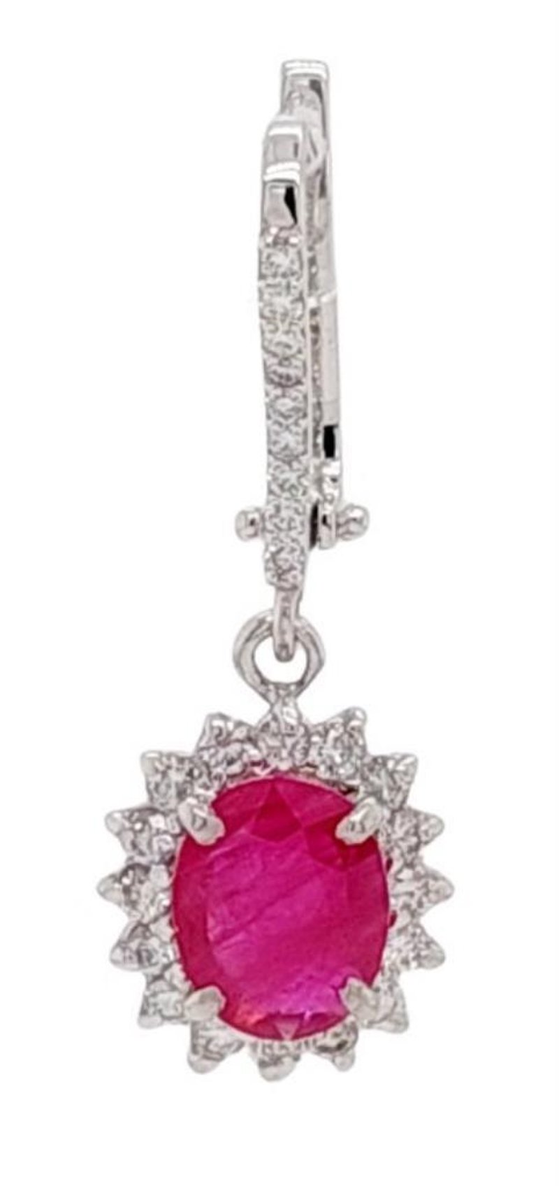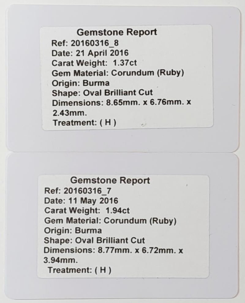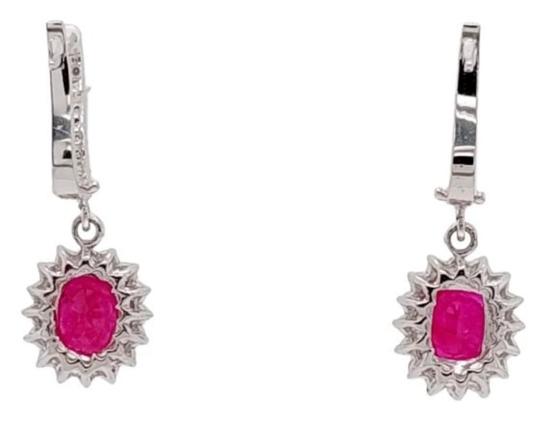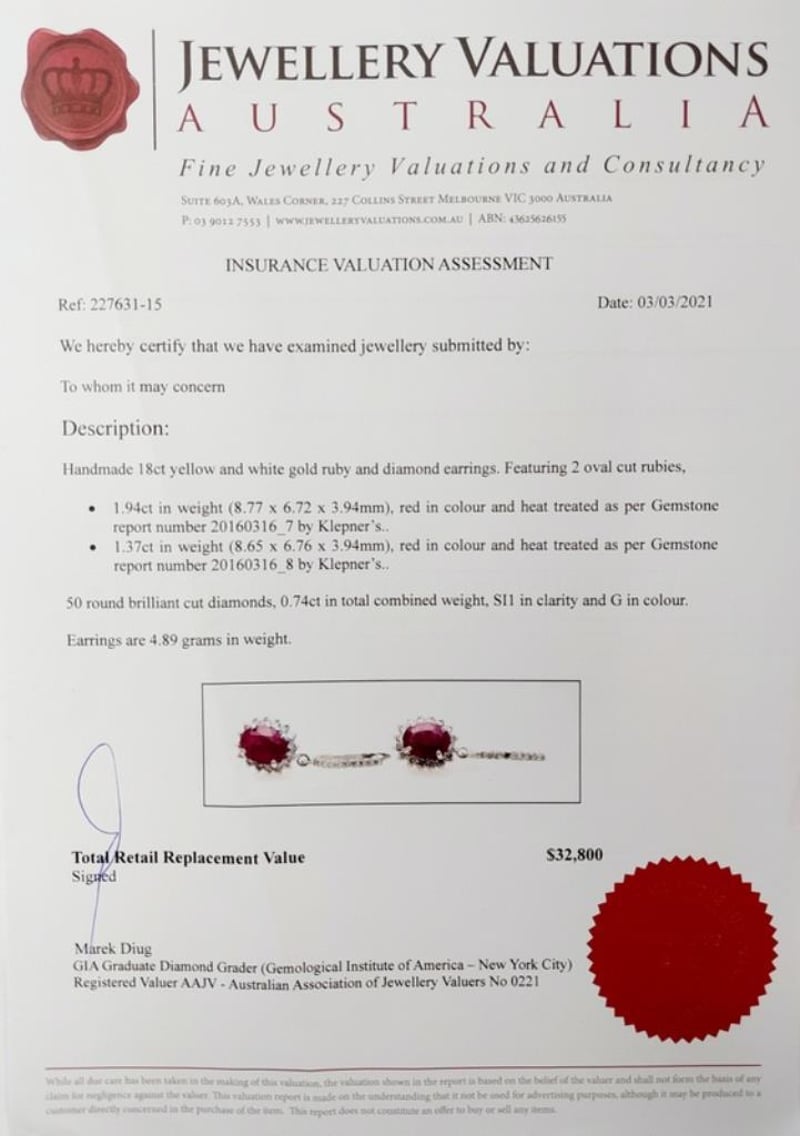 18CT TWO TONED GOLD RUBY AND DIAMOND HAND MADE DROP EARRINGS Total Item Weight: 4.89gms These Hand Made 18Ct Yellow And White Gold Drop Earrings Feature 1 X 1.94Ct Oval Cut Ruby Measuring 8.77Mm X 6.72Mm X 3.94Mm, Heat Treated And Red In Colour As Per Klepner'S Gemstone Report Number: 20160316 And 1 X 1.37 Oval Cut Ruby Measuring 8.65Mm X 6.76Mm X 3.94Mm, Heat Treated And Red In Colour As Per Klepner'S Gemstone Report Number: 20160316. These Earrings Also Feature 50 X Round Brilliant Cut Diamonds, 0.74Ct In Total Combined Weight, Si1 In Clarity And G In Colour. Jewellery Valuations Provided By A Third Party Professional Not Directly Associated With Lloyds Auctions at AUD $32800 This Insurance Valuation has been provided by a registered Jewellery Valuer and is intended for insurance purposes only. The valuation amount has no bearing on the auction value of the item. Any questions regarding the valuation should be directed to the issuing Valuer (refer to contact details on the certificate) as Lloyds have no association or relationship with the Valuer or the valuation amount contained within the valuation. Condition: Excellent- Refer Images 0 162901+79 CROSSDOCK