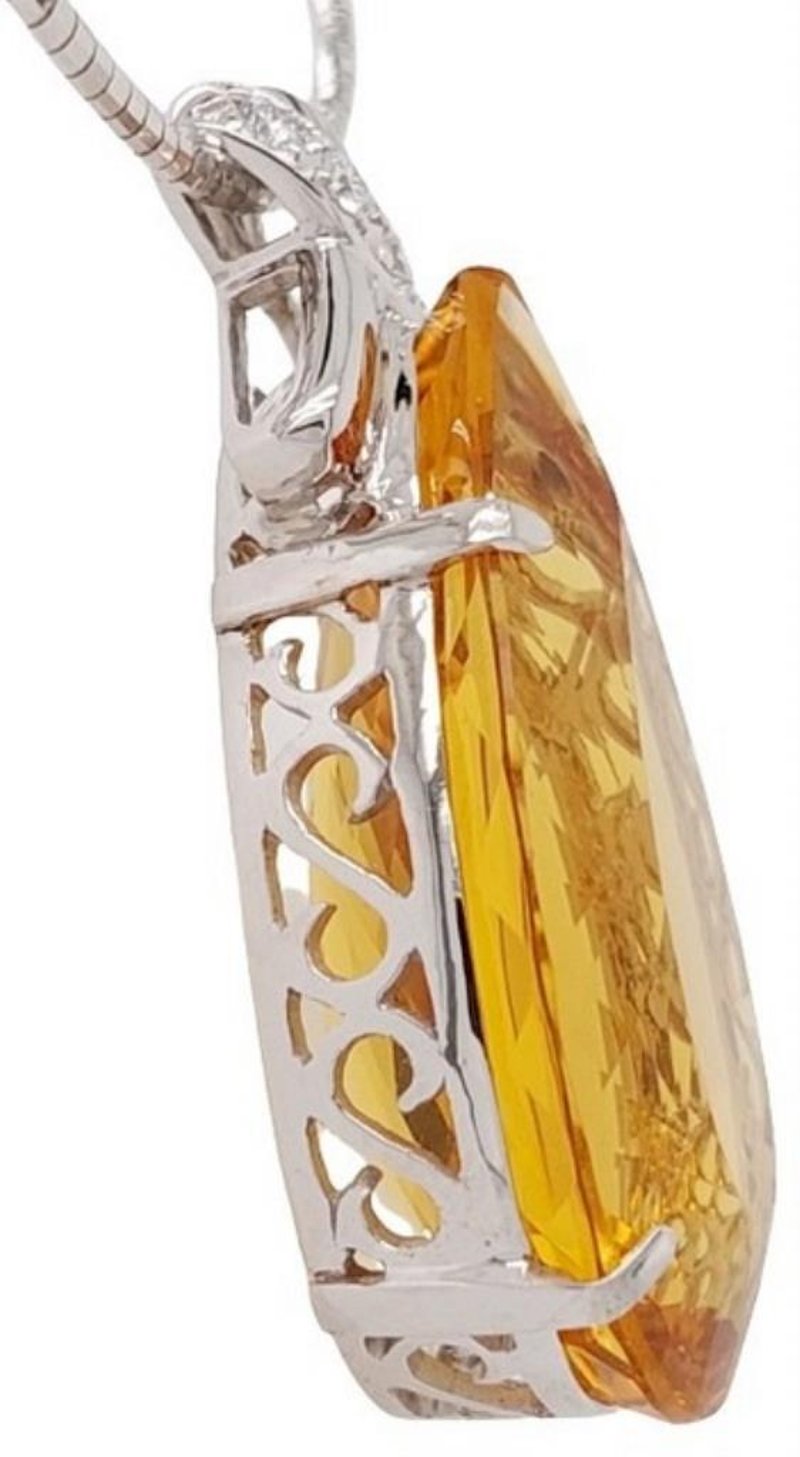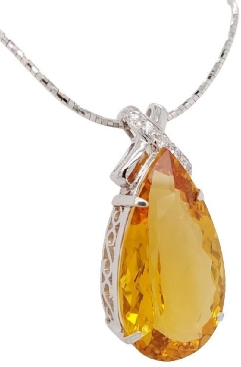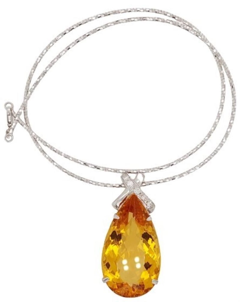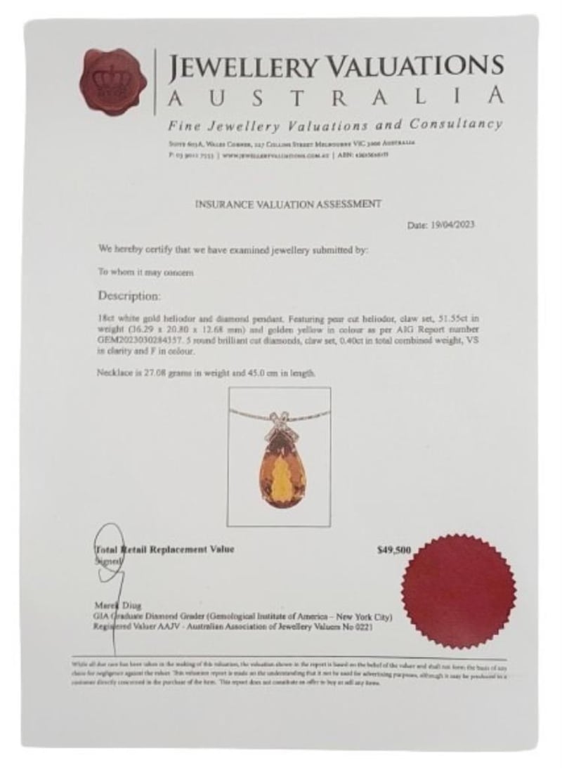 18CT WHITE GOLD HELIODOR AND DIAMOND NECKLACE Total Item Weight: 27.08gms Size: 45cms This 18Ct White Gold Heliodor And Diamond Necklace Features A Pear Cut Heliodor In Claw Set Ct Measuring: 36.29Mm X 20.80Mm X 12.68Mm And Golden Yellow In Colour. The Necklace Also Features 5 Brilliant Round Cut Diamonds In Claw Set 0.40Ct In Total Combined Weight Vs In Clarity And F In Colour. Jewellery Valuations Provided By A Third Party Professional Not Directly Associated With Lloyds Auctions at AUD $49500 This Insurance Valuation has been provided by a registered Jewellery Valuer and is intended for insurance purposes only. The valuation amount has no bearing on the auction value of the item. Any questions regarding the valuation should be directed to the issuing Valuer (refer to contact details on the certificate) as Lloyds have no association or relationship with the Valuer or the valuation amount contained within the valuation. Condition: Excellent- Refer Images 0 162901+88 CROSSDOCK