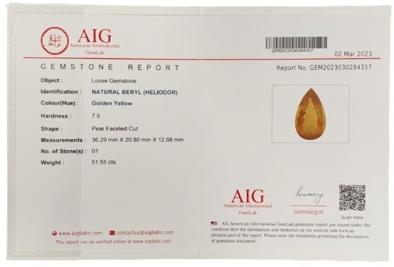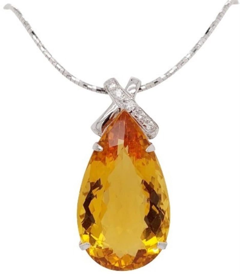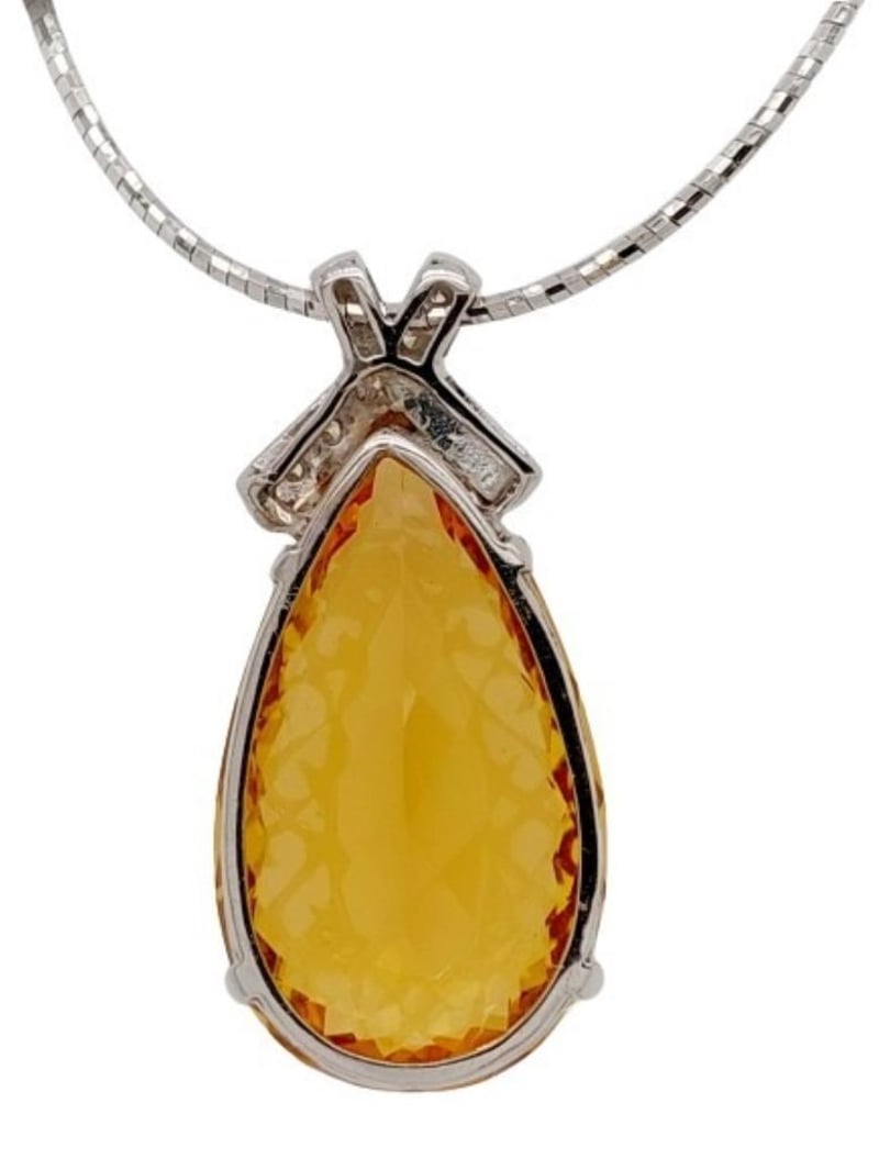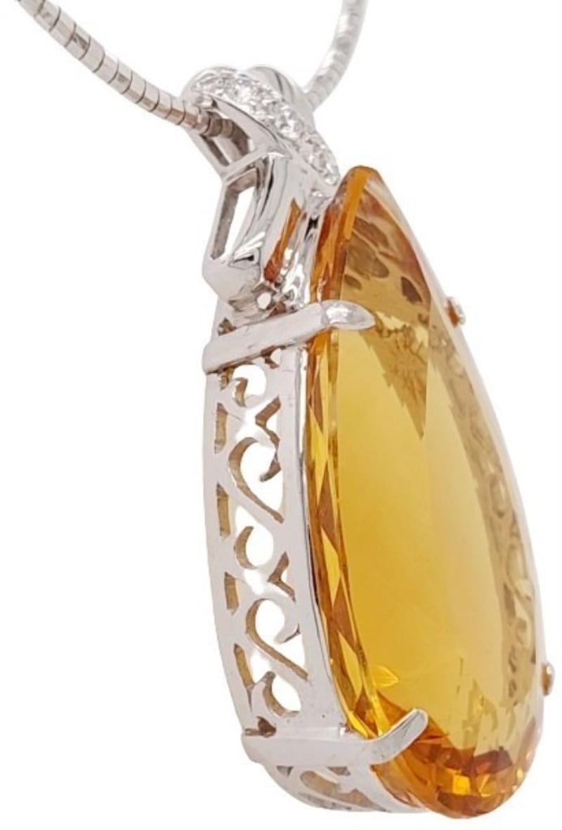 18CT WHITE GOLD HELIODOR AND DIAMOND NECKLACE Total Item Weight: 27.08gms Size: 45cms This 18Ct White Gold Heliodor And Diamond Necklace Features A Pear Cut Heliodor In Claw Set Ct Measuring: 36.29Mm X 20.80Mm X 12.68Mm And Golden Yellow In Colour. The Necklace Also Features 5 Brilliant Round Cut Diamonds In Claw Set 0.40Ct In Total Combined Weight Vs In Clarity And F In Colour. Jewellery Valuations Provided By A Third Party Professional Not Directly Associated With Lloyds Auctions at AUD $49500 This Insurance Valuation has been provided by a registered Jewellery Valuer and is intended for insurance purposes only. The valuation amount has no bearing on the auction value of the item. Any questions regarding the valuation should be directed to the issuing Valuer (refer to contact details on the certificate) as Lloyds have no association or relationship with the Valuer or the valuation amount contained within the valuation. Condition: Excellent- Refer Images 0 162901+88 CROSSDOCK