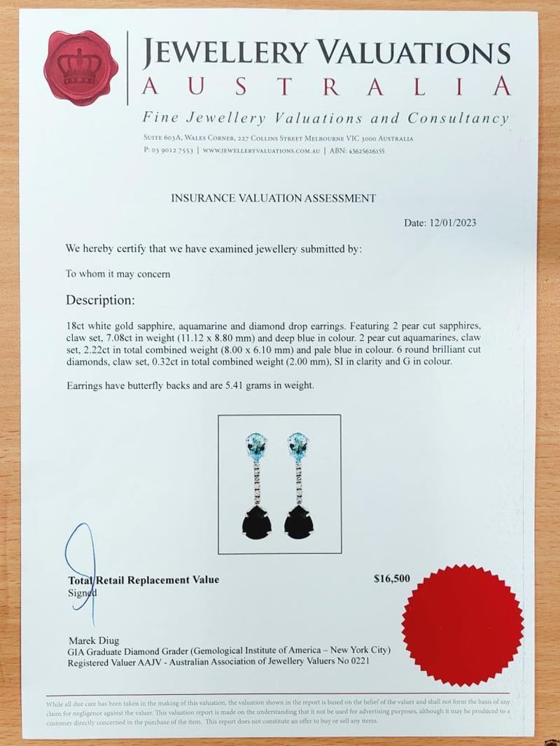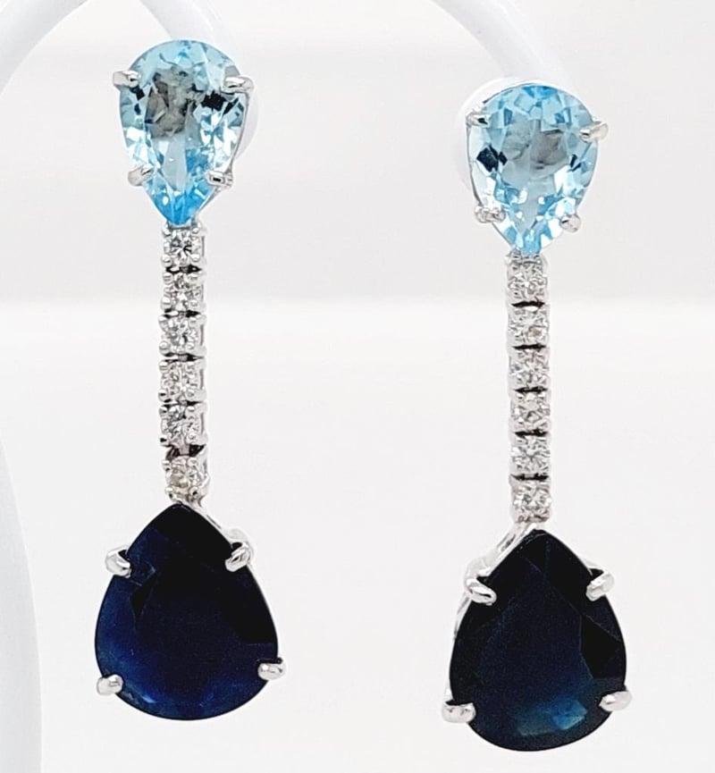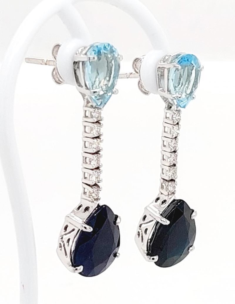 18CT WHITE GOLD SAPPHIRE, AQUAMARINE AND DIAMOND DROP EARRINGS Total Item Weight: 5.41gms These 18Ct White Gold Earrings Feature Two Pear Cut Claw Set Sapphires, 7.08Ct In Total Combined Weight, Measure 11.12Mm X 8.80Mm And Are Deep Blue In Colour. These Earrings Also Feature 2 Pear Cut Claw Set Aquamarines, 2.22Ct In Total Combined Weight, Measure 8.00Mm X 6.0Mm And Are Pale Blue In Colour With 6 Round Brilliant Cut Claw Set Diamonds, 0.32Ct In Total Combined Weight, Measure 2.00Mm, Are Si In Clarity And G In Colour. Markings: 750 Jewellery Valuations Provided By A Third Party Professional Not Directly Associated With Lloyds Auctions at AUD $16500This Insurance Valuation has been provided by a registered Jewellery Valuer and is intended for insurance purposes only. The valuation amount has no bearing on the auction value of the item. Any questions regarding the valuation should be directed to the issuing Valuer (refer to contact details on the certificate) as Lloyds have no association or relationship with the Valuer or the valuation amount contained within the valuation. Condition: Excellent- Refer Images 0162901+100CROSSDOCK