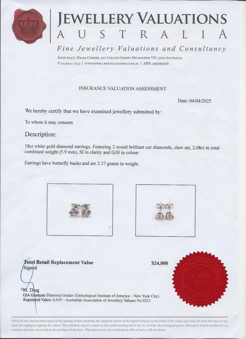 Featuring 2 round brilliant cut diamonds, claw set, 2.08ct in total combined weight (5.9 mm), SI in clarity and G/H in colour.