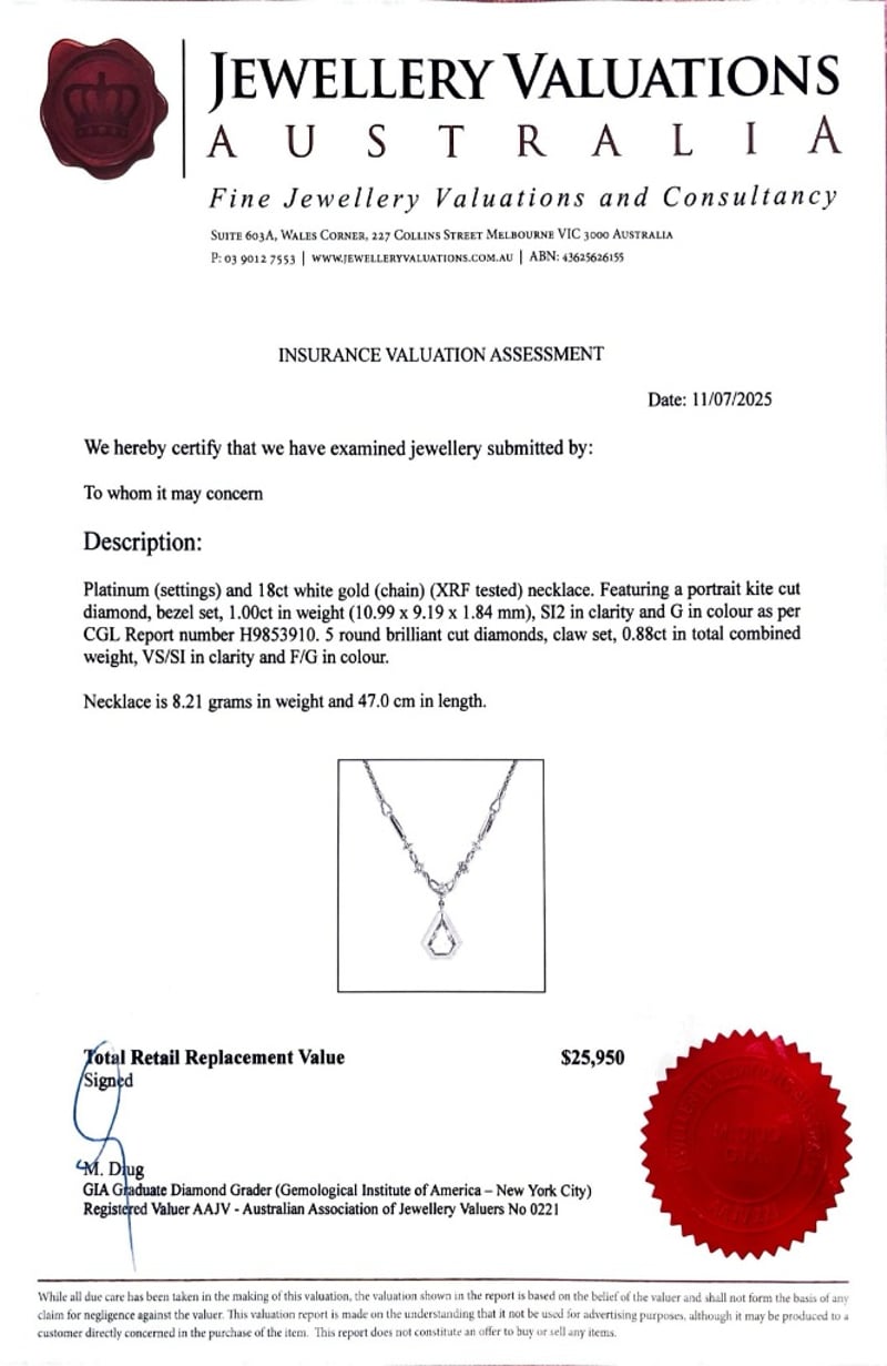'Featuring A Portrait Kite Cut Diamond, Bezel Set, 1.00Ct In Weight (10.99 X 9.19 X 1.84 Mm), Si2 In Clarity And G In Colour As Per Cgl Report Number H9853910. 5 Round Brilliant Cut Diamonds, Claw Set, 0.88Ct In Total Combined Weight, Vs/Si In Clarity And F/G In Colour.