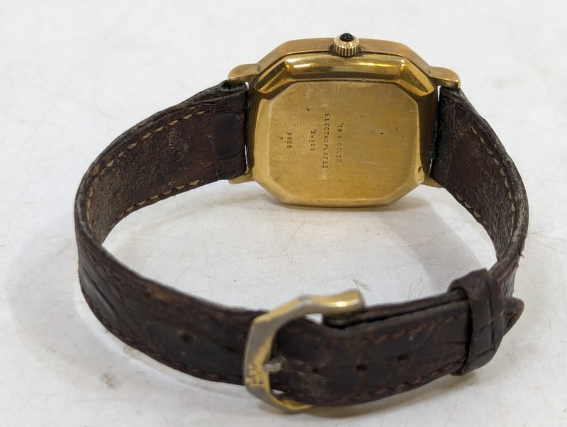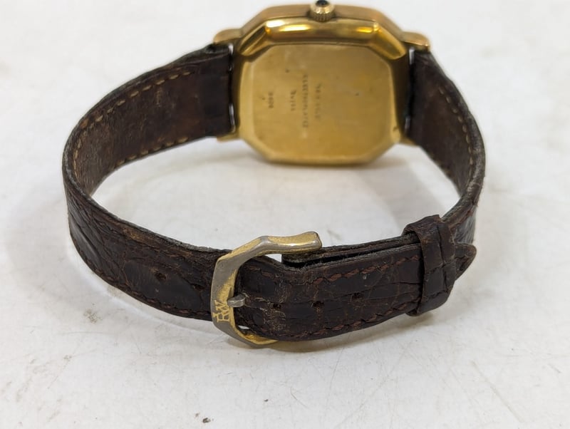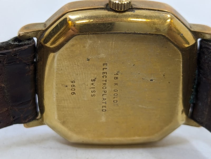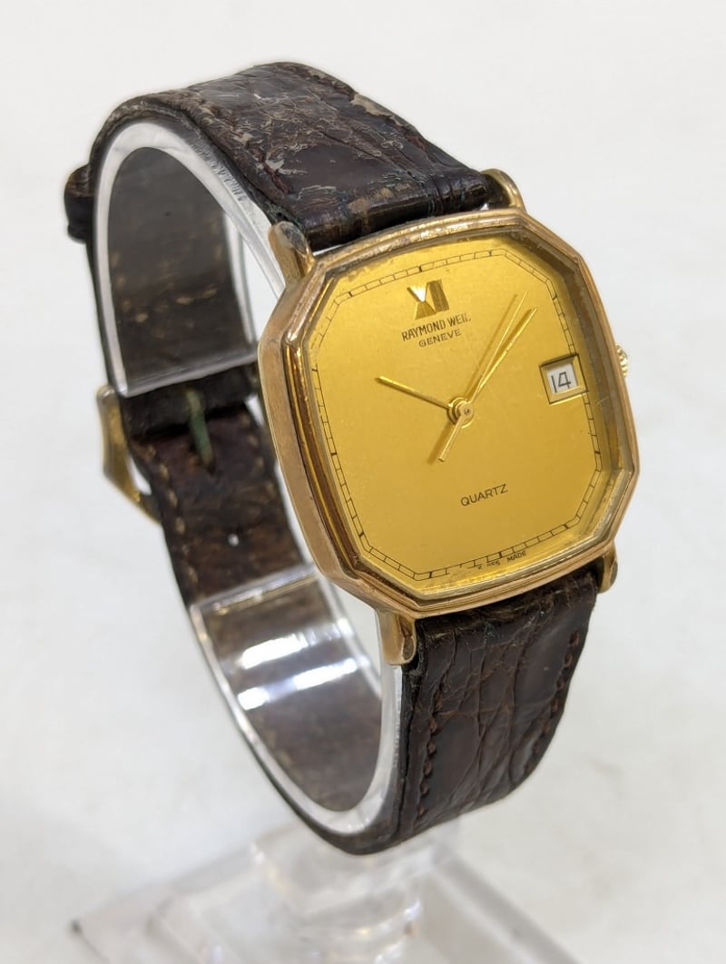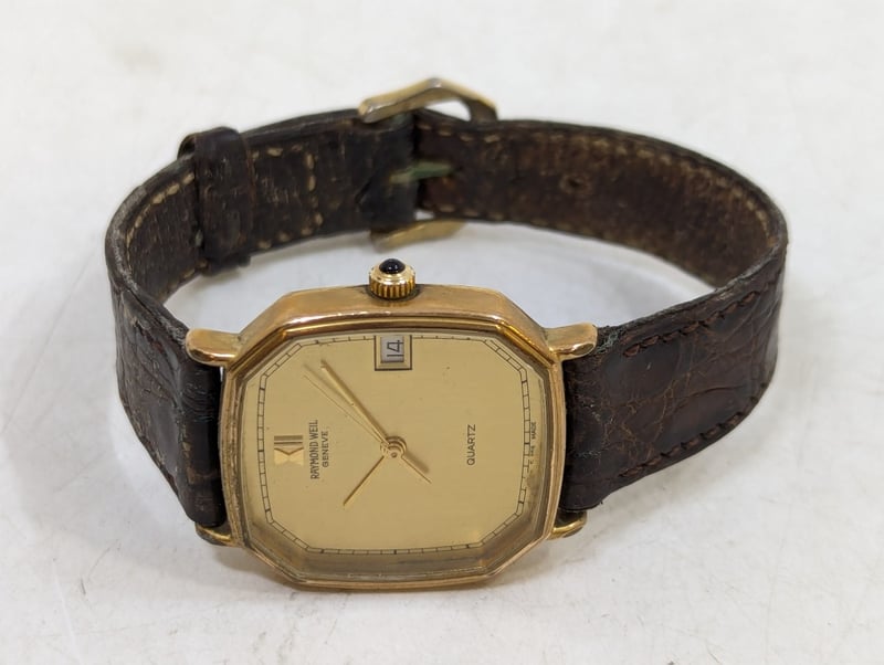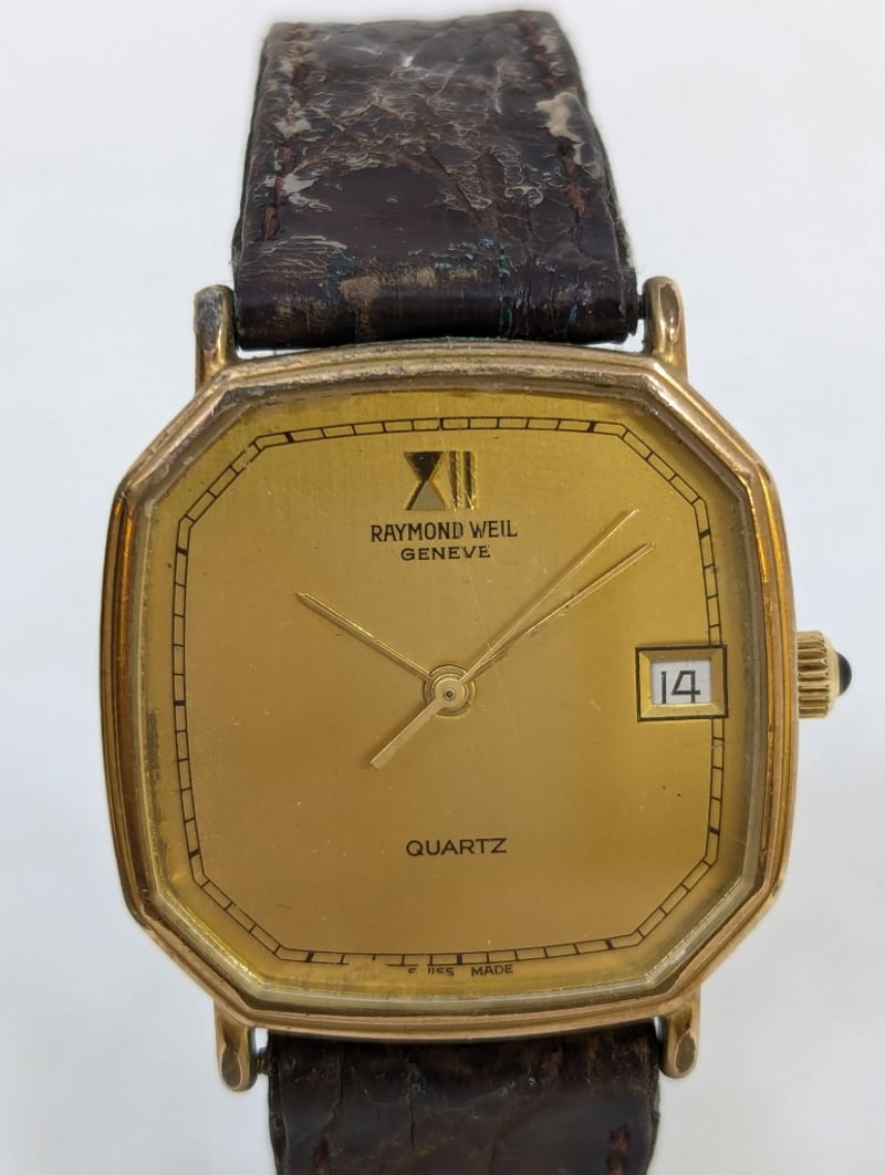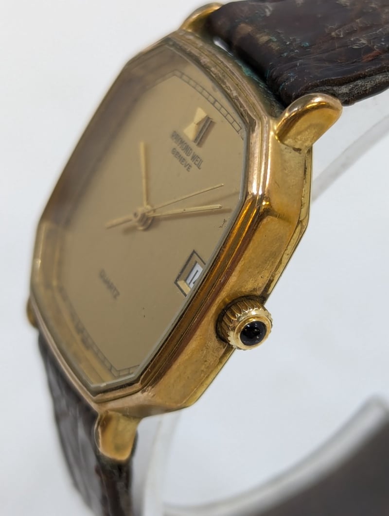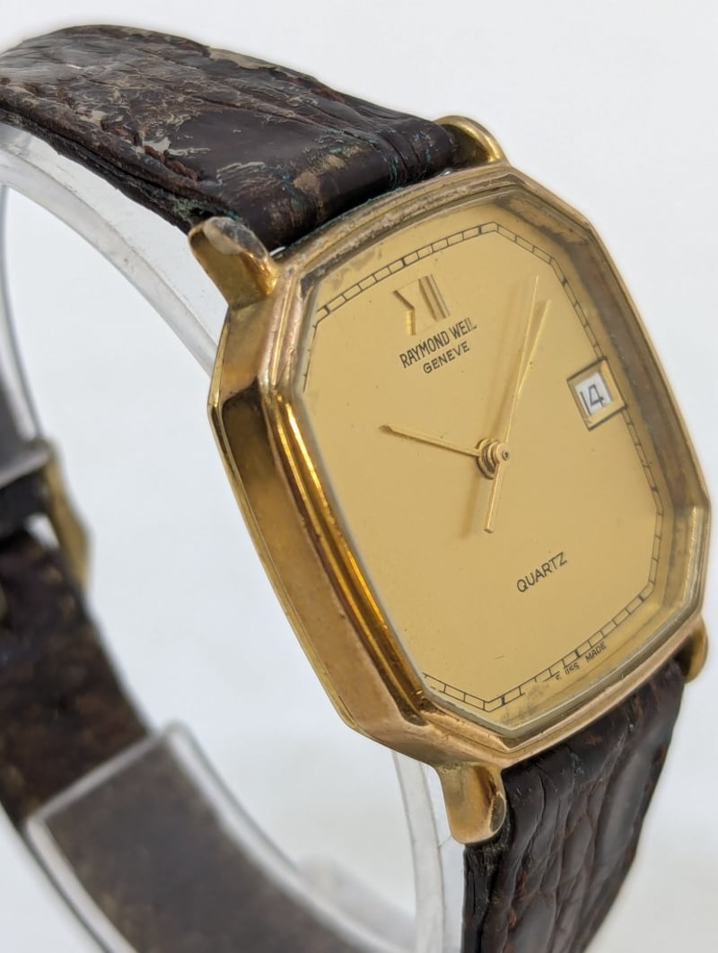 RAYMOND WEIL GENEVE 9606 REFERENCE NO. 9606 DIAL: FAUX GOLD DIAL CASE DESCRIPTION: 18K GOLD ELECTROPLATED CASE SIZE: 30MM BRACELET: LEATHER STYLE BRACELET MOVEMENT: QUARTZ BOX: NOT INCLUDED PAPERS: NOT INCLUDED Additional Information: Non Numerical Hour Markers Date Display At 3 O'Clock Position Buckle Clasp Movement Untested 584956+1