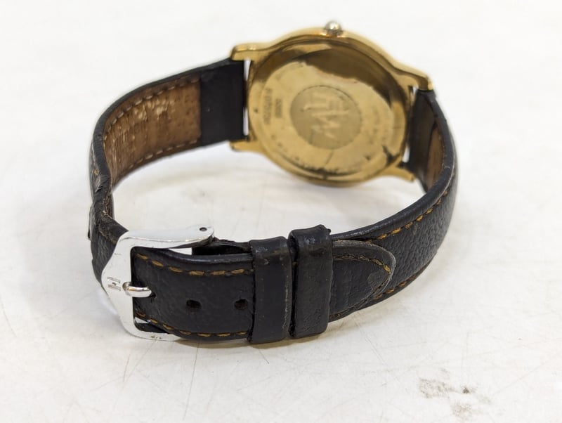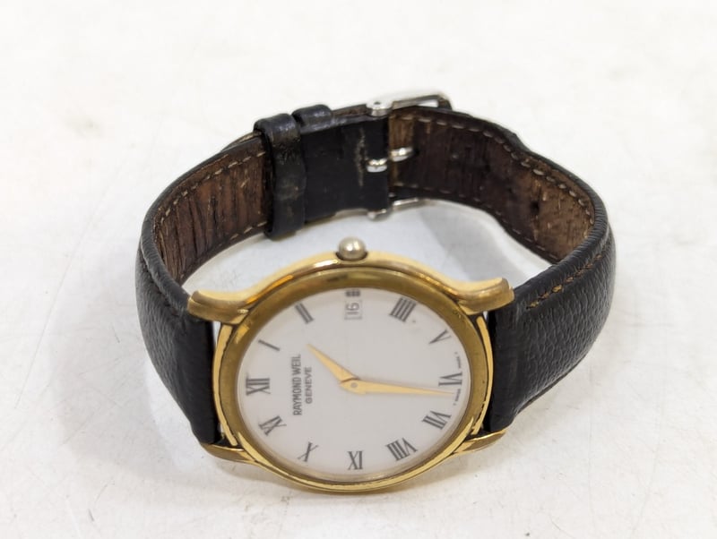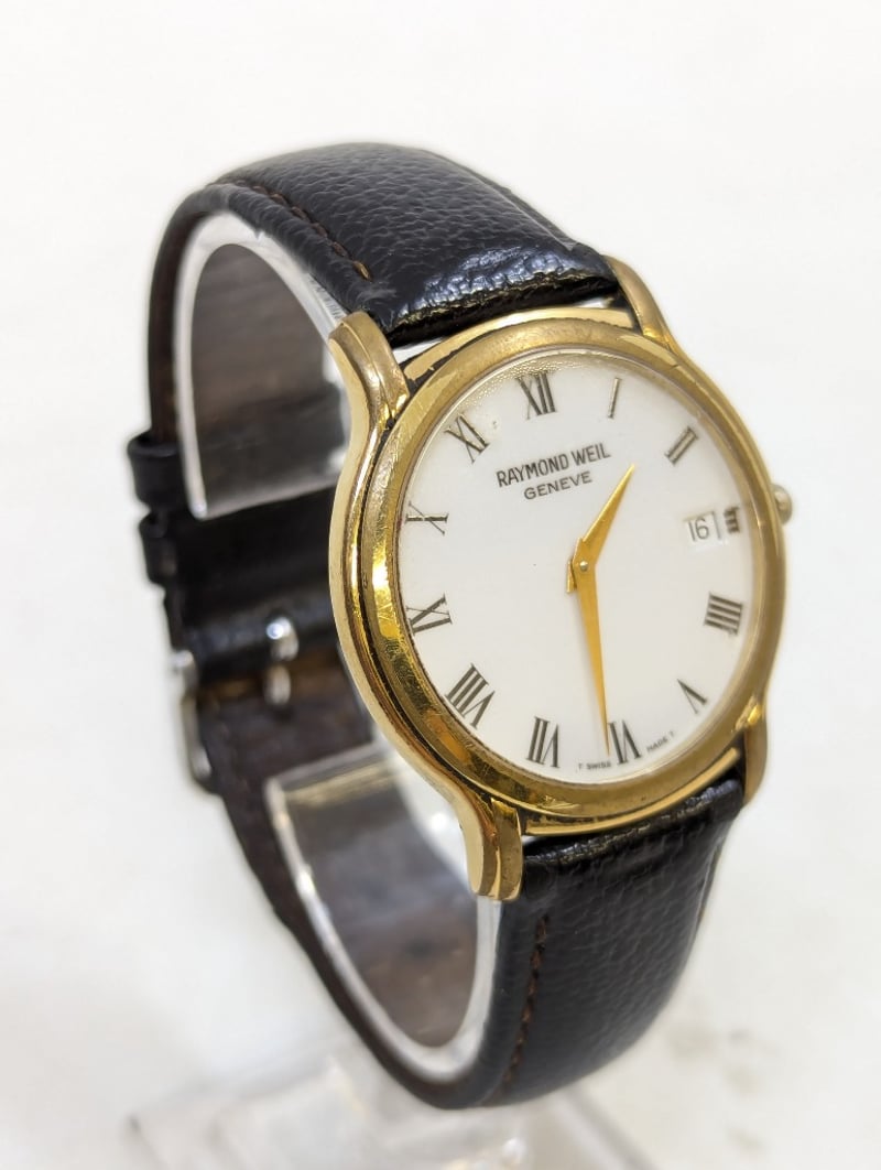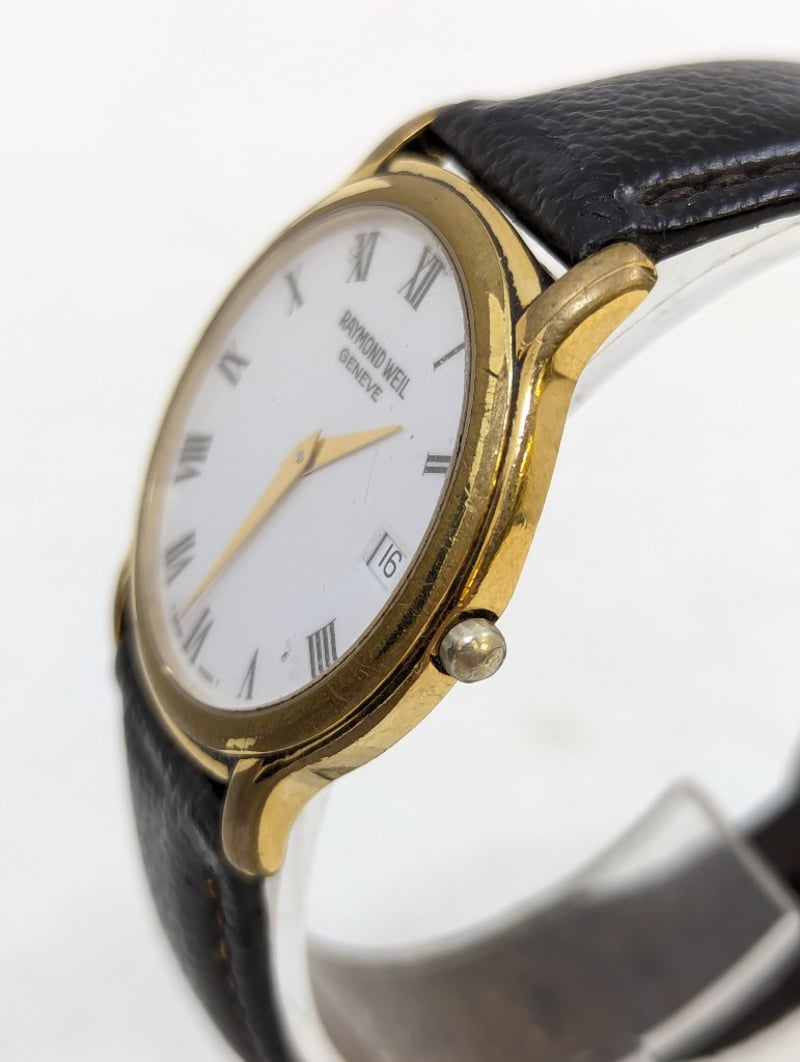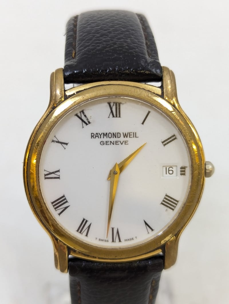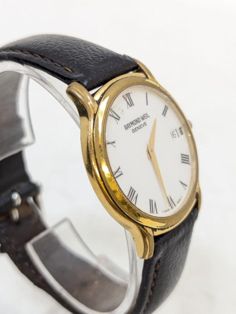 RAYMOND WEIL GENEVE 559 B073738 REFERENCE NO. 559 B073738DIAL: WHITE DIALCASE DESCRIPTION: 18K GOLD ELECTROPLATEDCASE SIZE: 33MMBRACELET: LEATHER STYLEBOX: NOT INCLUDEDPAPERS: NOT INCLUDEDAdditional Information: Roman Numeral Hour MarkersDate Display At 3 O'Clock PositionBuckle ClaspWater Resistant: 3 AtmMovement Untested584956+2
