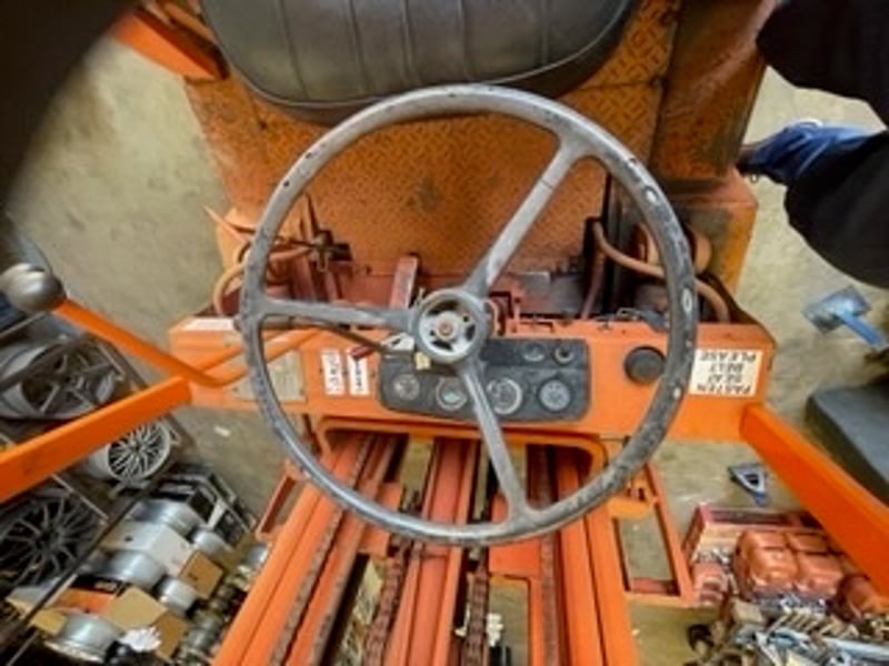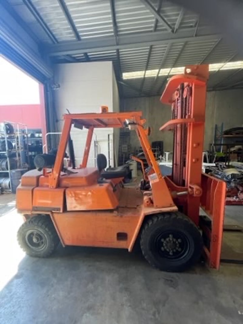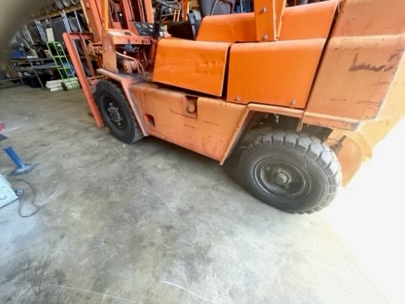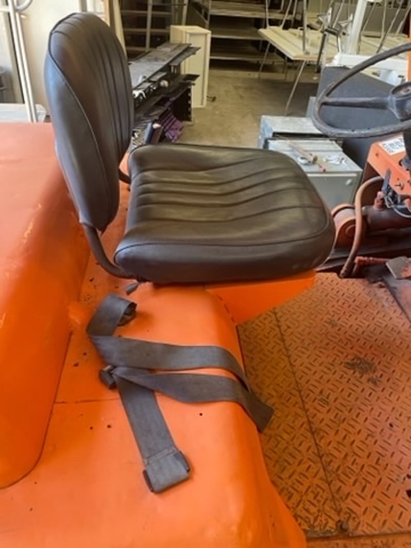 Used forklift with visible wear, scratches, faded paint, and some surface rust. ID plates worn. Seat and controls intact.