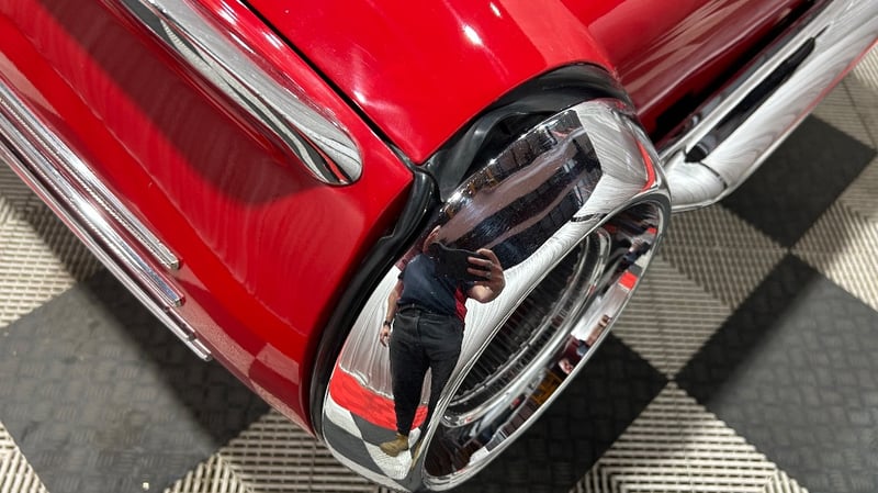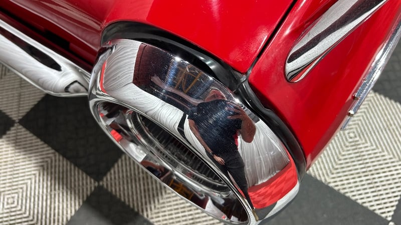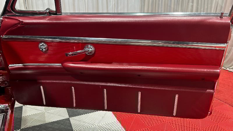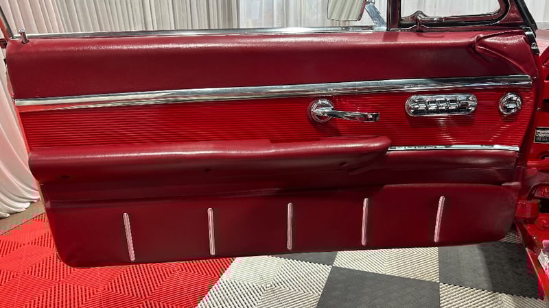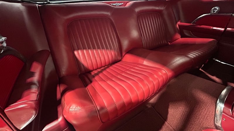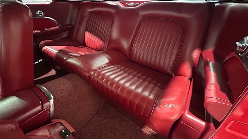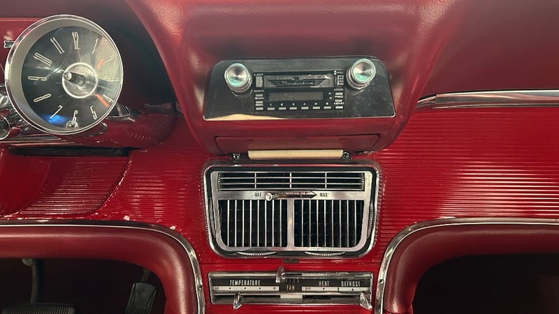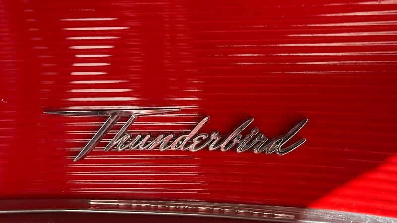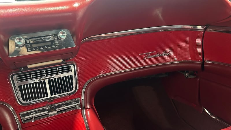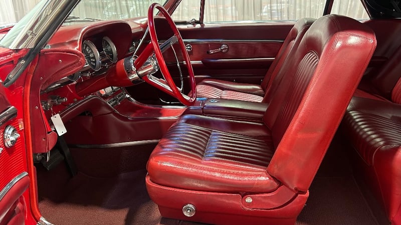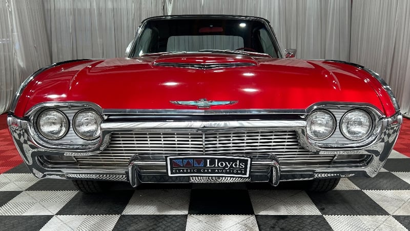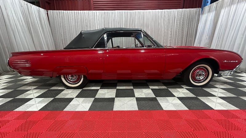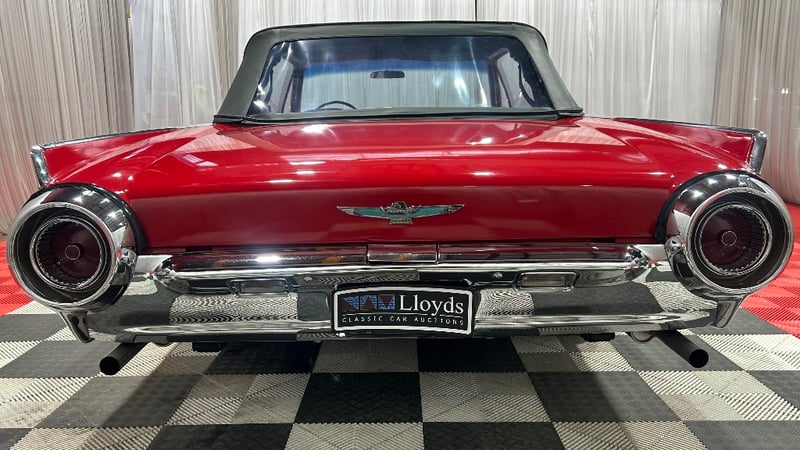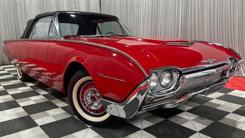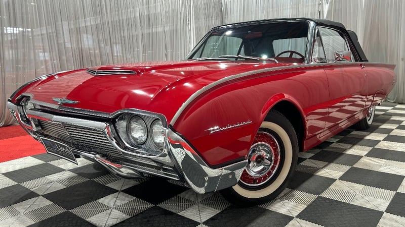 A 1961 Ford Thunderbird 2-door convertible finished in Crimson Red with a contrasting black convertible top, powered by a 390 V8 (6.4-litre) petrol engine paired with a 3-speed automatic transmission. Rear-wheel drive, five-seat configuration, odometer indicating 258,351 miles.