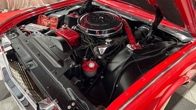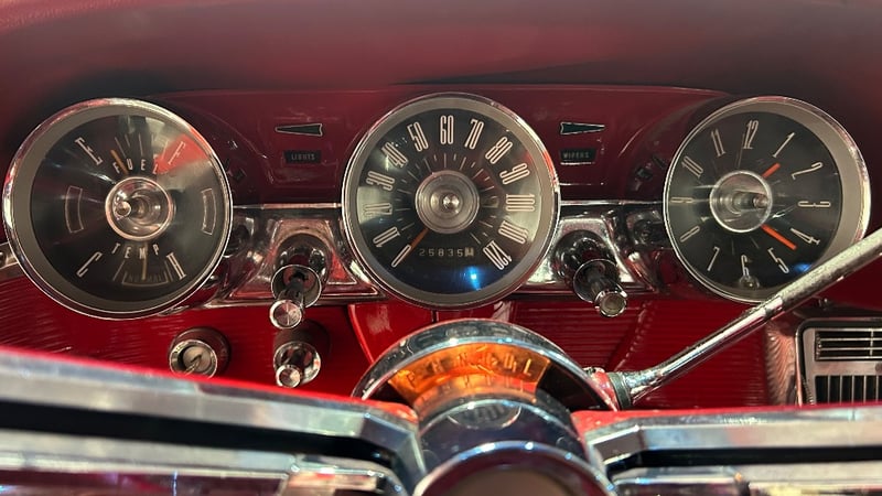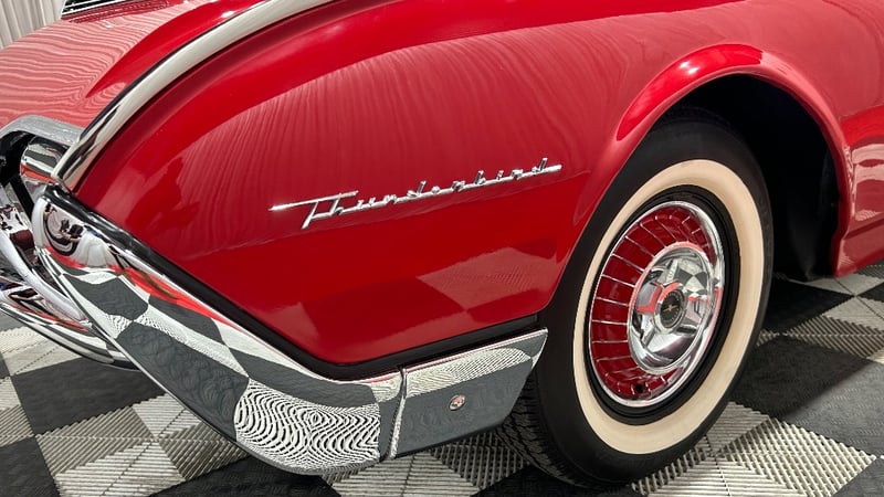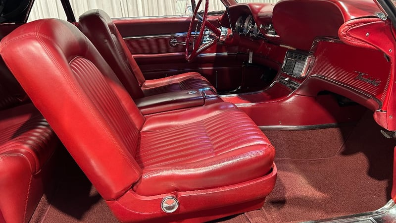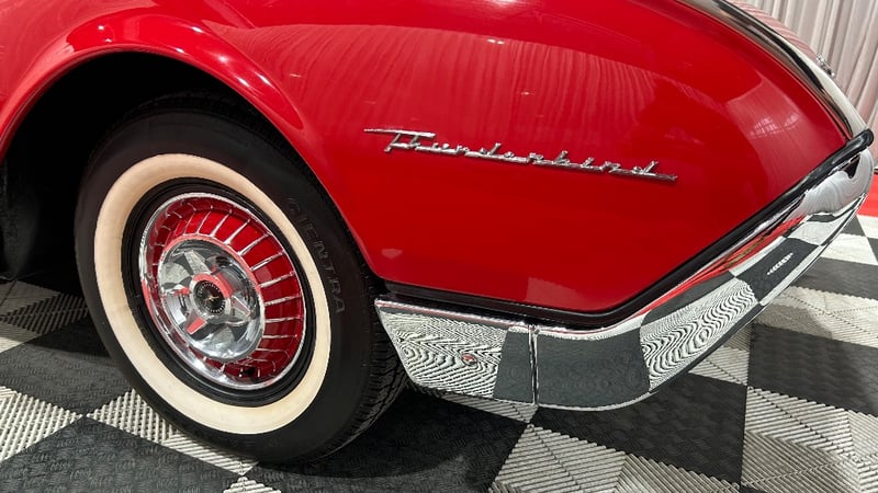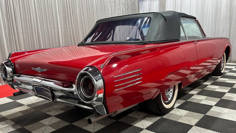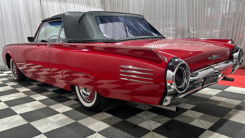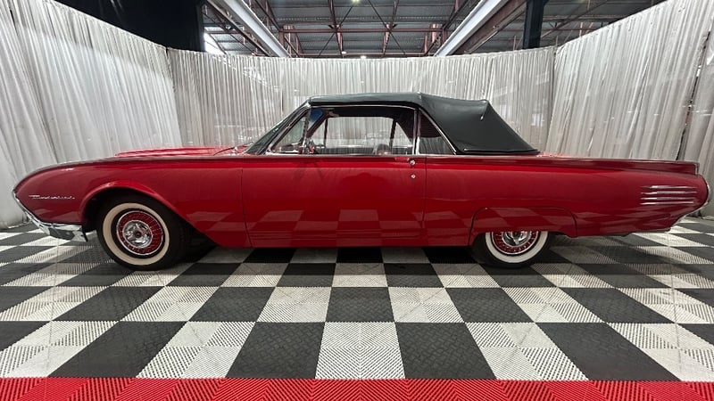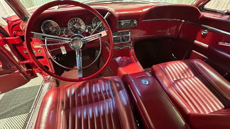 This fourth-generation Thunderbird is a striking example of early 1960s American luxury convertibles. It features the legendary 390 cubic inch V8 engine, smooth 3-speed automatic transmission, and only 25,835 miles on the odometer, indicating careful preservation. The interior is finished in pristine red leather with period-correct ribbed seating surfaces, original steering wheel, and full gauge cluster. Chrome detailing throughout remains bright, including dual headlights, prominent front grille, rear tail lights, and door handles.
