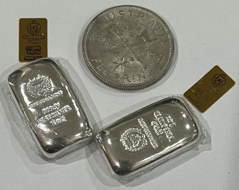 SCOTTSDALE LION 1/100OZ 9999 GOLD BULLION BAR X 2 , 1-OUNCE GERMANIA MINT SILVER 2 BARS, 1951 AUSTRALIA SILVER FLORIN 23528+17