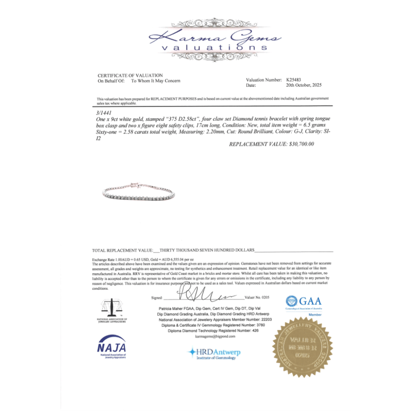 9K WHITE GOLD, 2.58CT TDW DIAMOND, TENNIS BRACELET. THE DESIGN FEATURES, 61 ROUND BRILLIANT CUT, DIAMONDS (2.58CT TDW, G-J COLOUR, SI-I2 CLARITY), 4-CLAW SET. THE BRACELET HAS A BOX CLASP WITH DOUBLE FIGURE 8 CLASPS. BRACELET LENGTH IS 17CM. Valuations Provided by an Independent Third-Party Professional Not Directly Associated With Lloyds Auctions at AUD $30,700.00This valuation has been conducted by an independent third-party professional. The valuation amount is an assessment by the issuing valuer and does not reflect the auction value of the item. Any inquiries regarding the valuation should be directed to the issuing valuer (refer to contact details on the certificate), as Lloyds Auctions has no affiliation or influence over the valuation, the valuer, or the stated amount. Condition: Good - Refer Images 0645886+5318