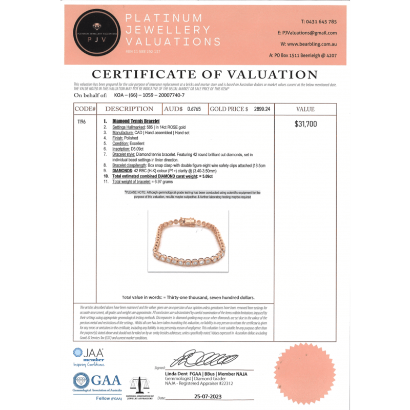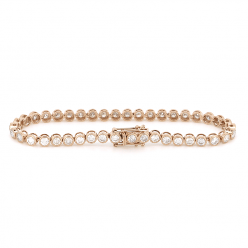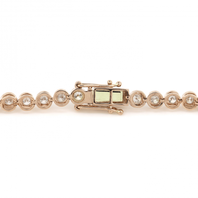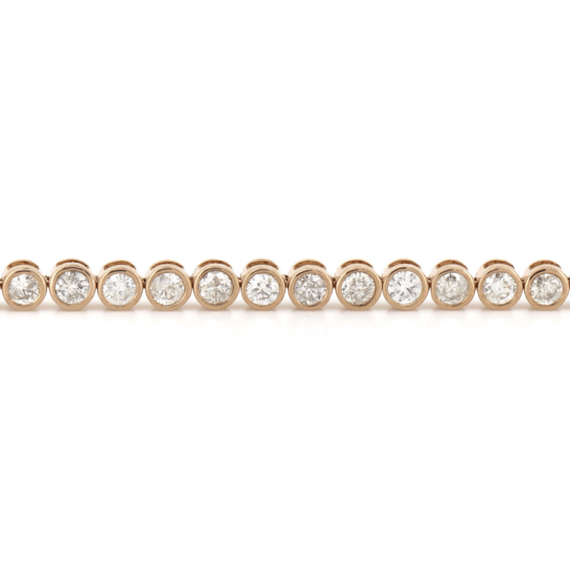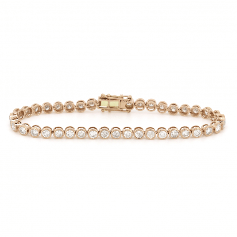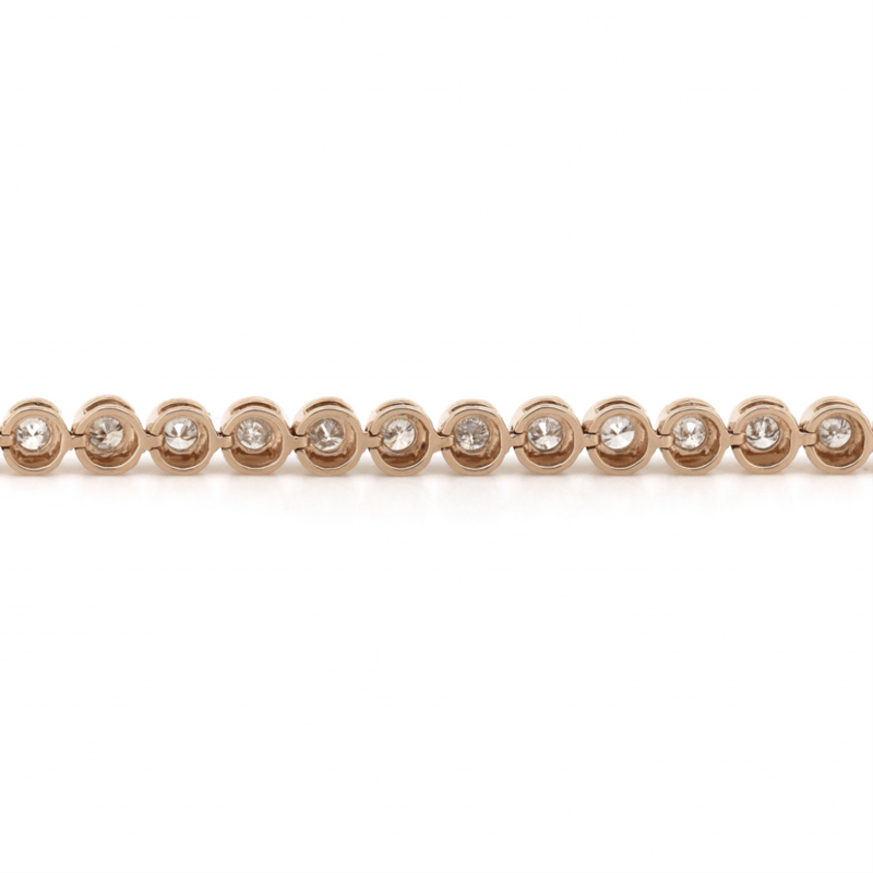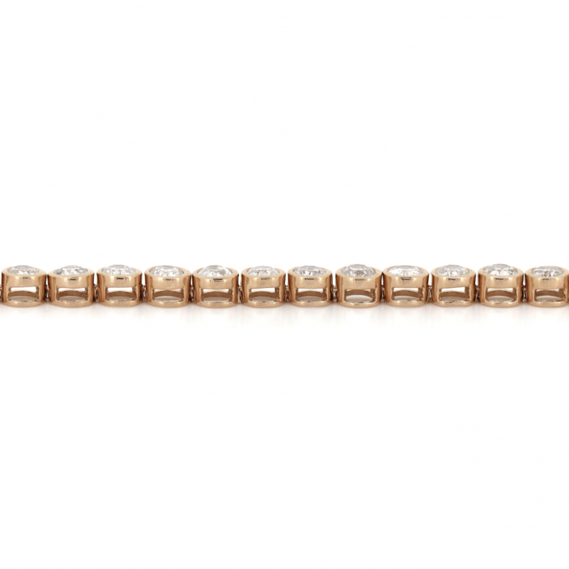 14K ROSE GOLD, 5.09CT TDW DIAMOND, TENNIS BRACELET. THE DESIGN FEATURES, 42 ROUND BRILLIANT CUT, DIAMONDS (5.09CT TDW, H-K COLOUR, P1+ CLARITY), BEZEL SET. THE BRACELET HAS A BOX LOCK CLASP, WITH TWO FIGURE '8' SAFETY LATCHES. BRACELET LENGTH IS 18.5CM.
