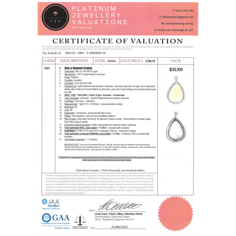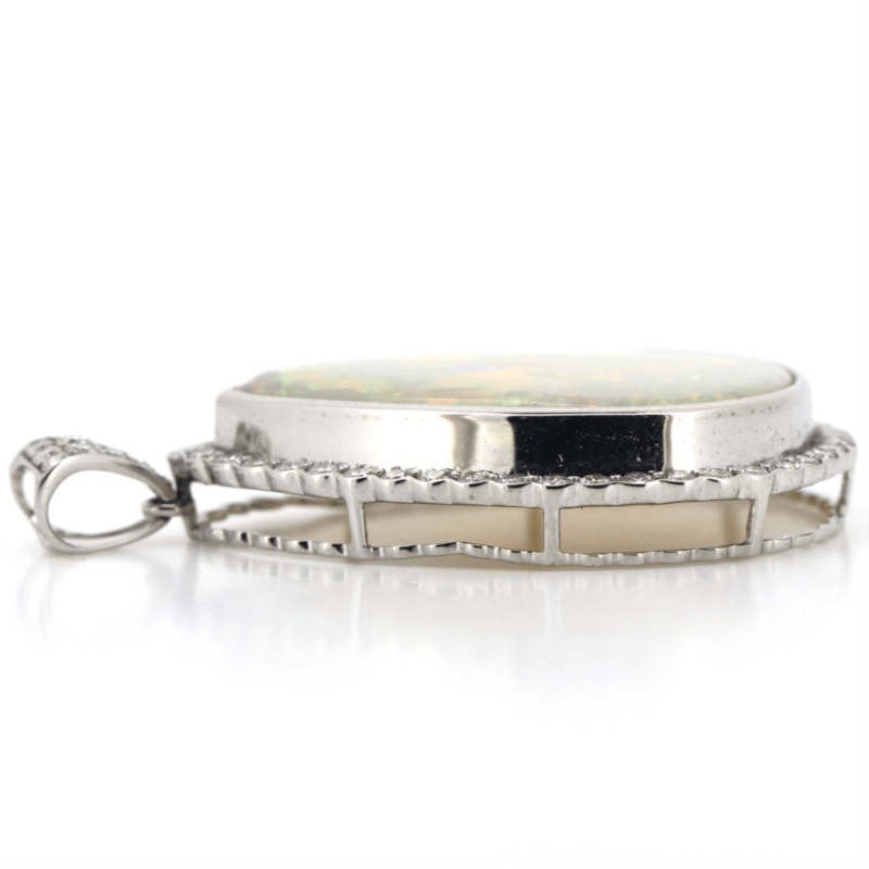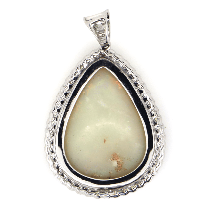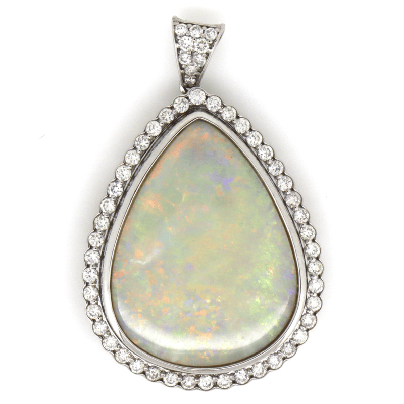 14K WHITE GOLD, 12.36CT AUSTRALIAN ANDAMOOKA OPAL AND DIAMOND, STATEMENT PENDANT. THE CENTRE FEATURES, ONE TEARDROP CABOCHON CUT, SOLID GREY, AUSTRALIAN ANDAMOOKA OPAL (12.36CT, ORANGE, GREEN, BLUE-VIOLET, PURPLE AND YELLOW, BROAD FLASH PATTERN), BEZEL SET. SURROUNDING THE CENTRE IN A HALO AND DECORATING THE BAIL ARE, 53 ROUND BRILLIANT CUT, DIAMONDS (0.736CT TDW, H-K COLOUR, P2+ CLARITY), BEAD SET.