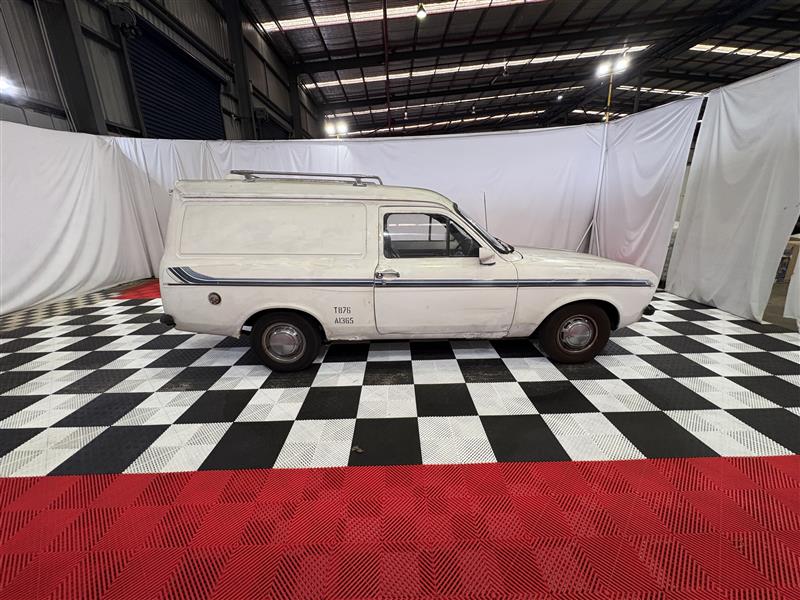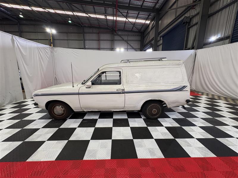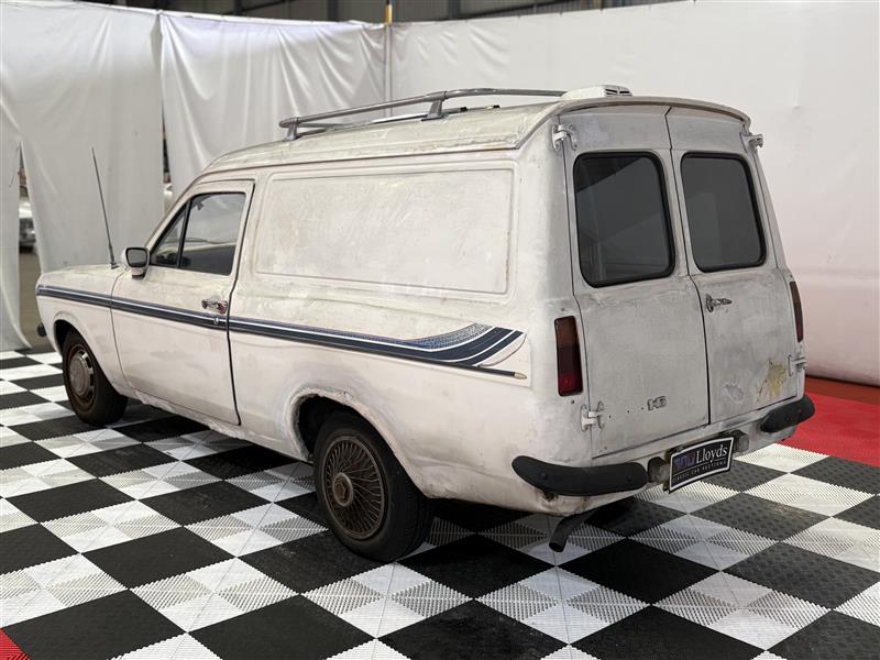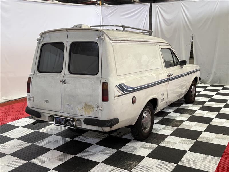 A 1978 Ford Escort 3-door panel van finished in White, powered by a 1.6-litre inline-four petrol engine paired with a 4-speed manual transmission. Rear-wheel drive, two-seat configuration, odometer indicating 131,509 kilometres.
