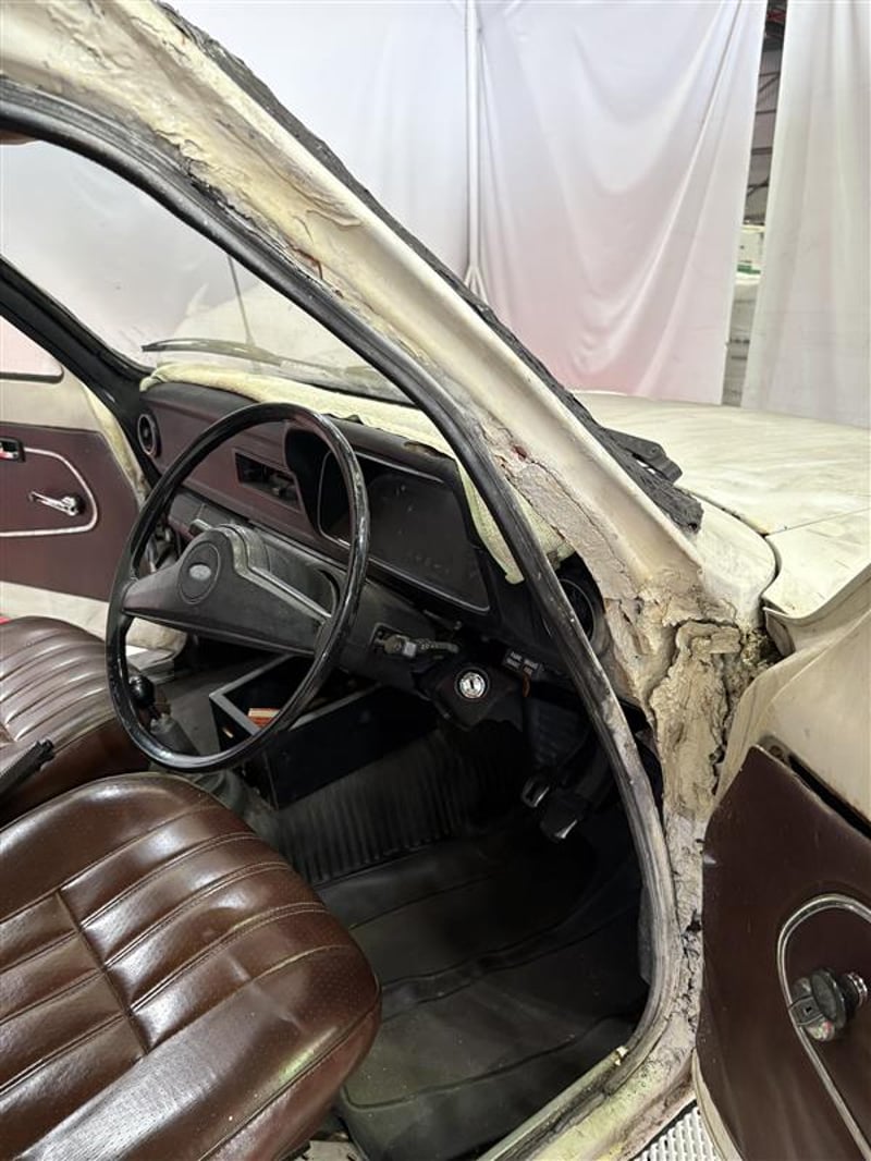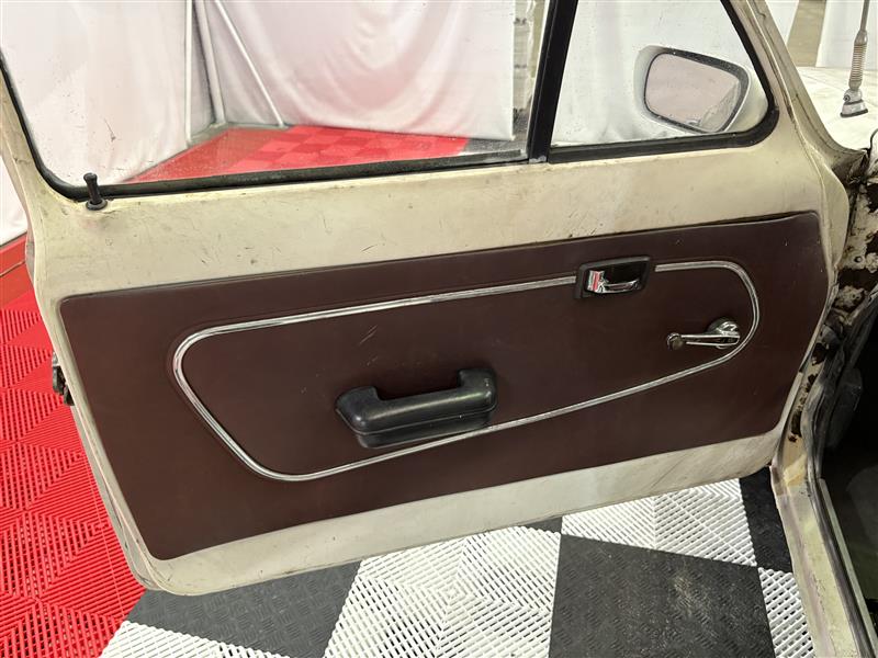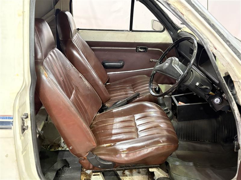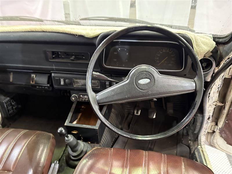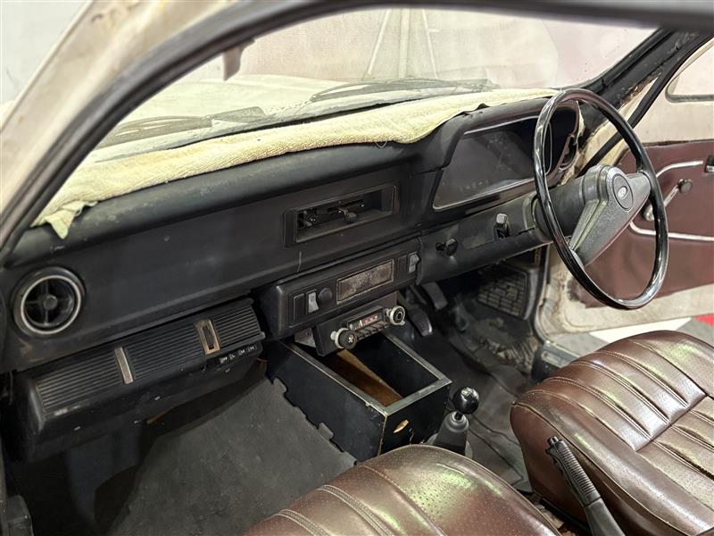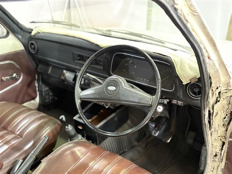 This Escort Wagon is presented as a project vehicle. Rust is visible inside the door jambs, along the bottom edges of the doors, on the quarter panels, and around the roof sills. The seats show tears, and the dashboard has cracks. Ideal for restoration enthusiasts or as a base for a custom build.