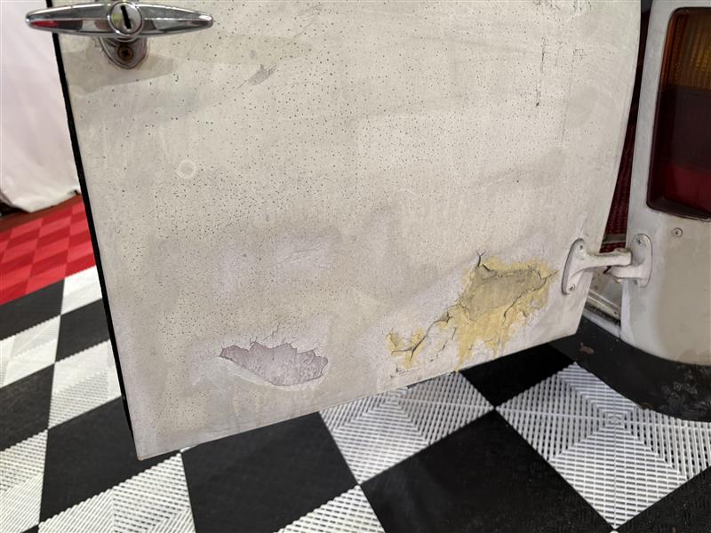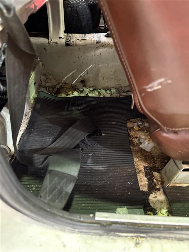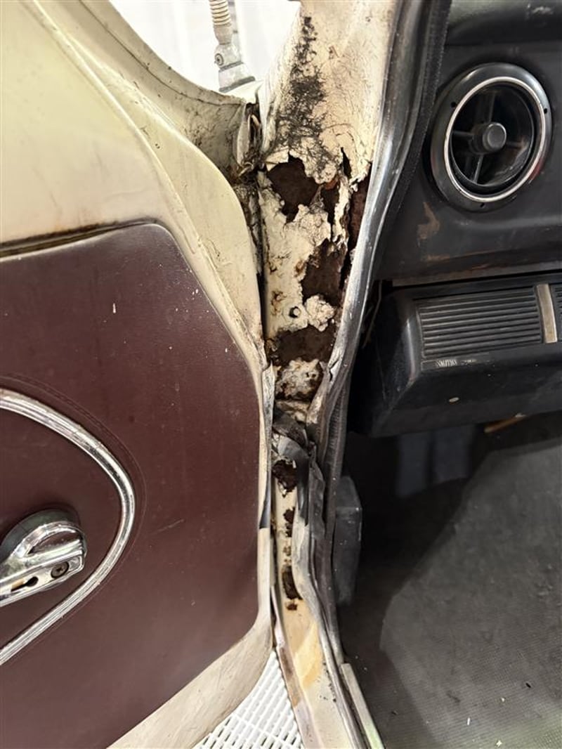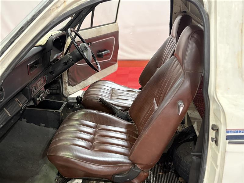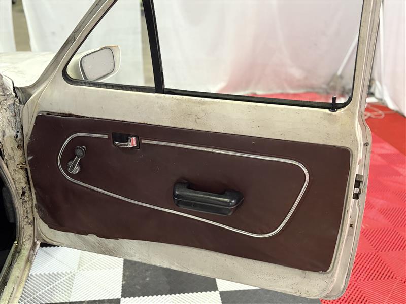 This Escort Wagon is presented as a project vehicle. Rust is visible inside the door jambs, along the bottom edges of the doors, on the quarter panels, and around the roof sills. The seats show tears, and the dashboard has cracks. Ideal for restoration enthusiasts or as a base for a custom build.