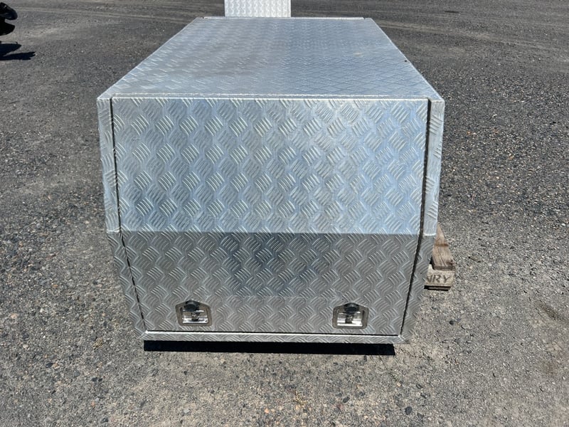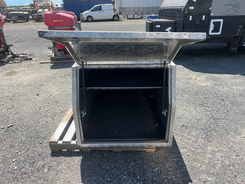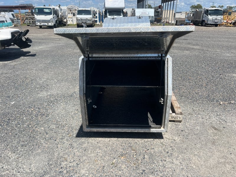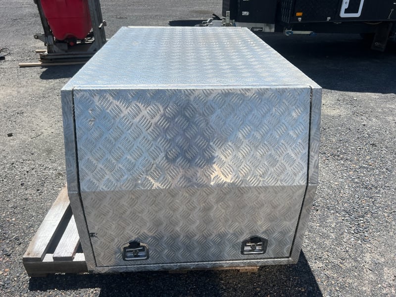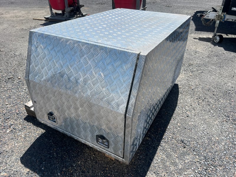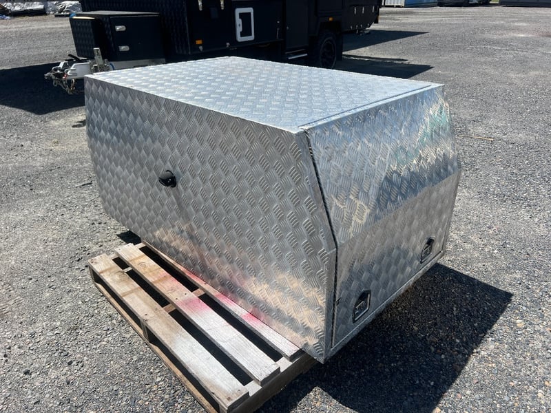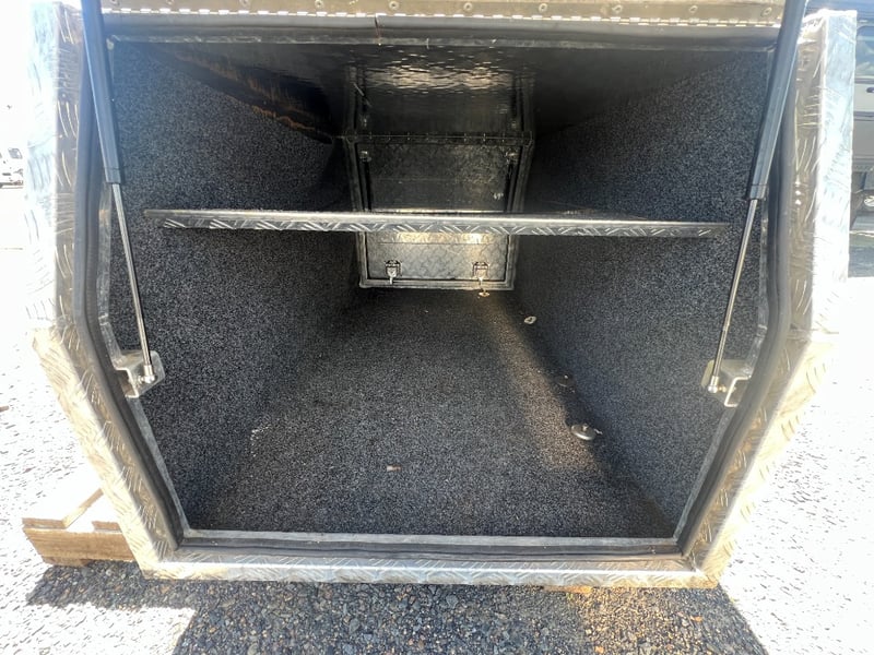 Heavy-duty aluminium Toolbox/Canopy with twin front latches and angled front design. Ideal for Utes, trailers, or site storage. Mounted Camera, 2 x tier shelf