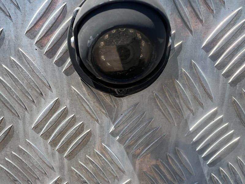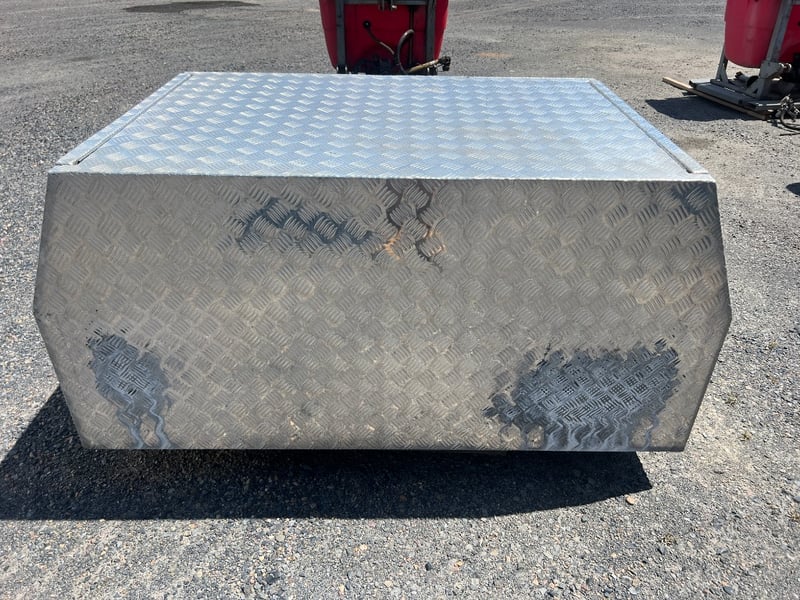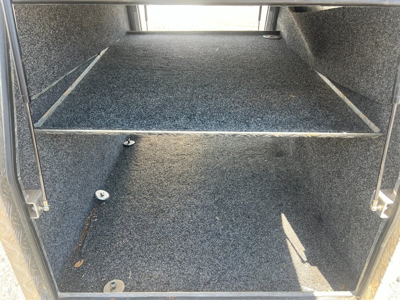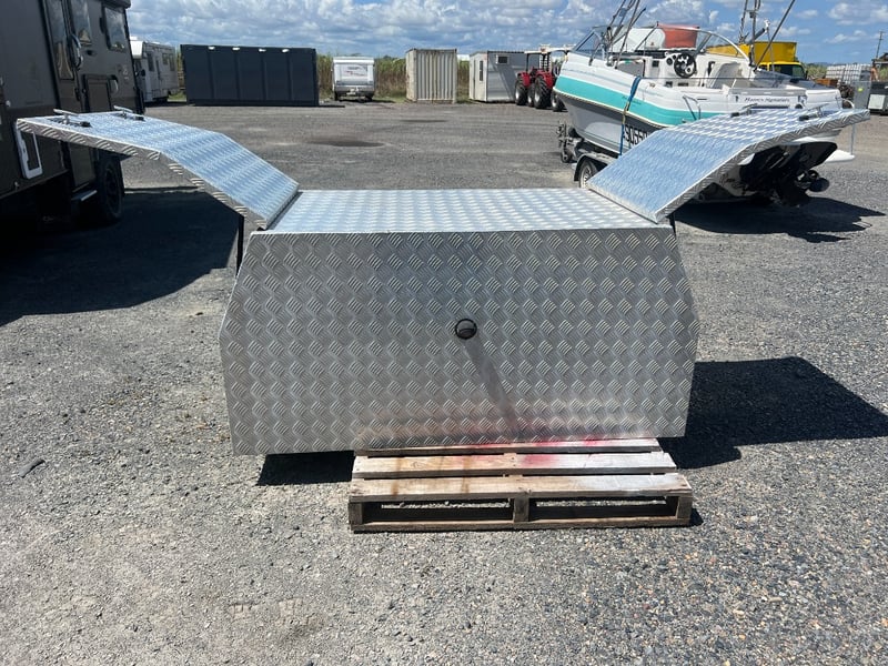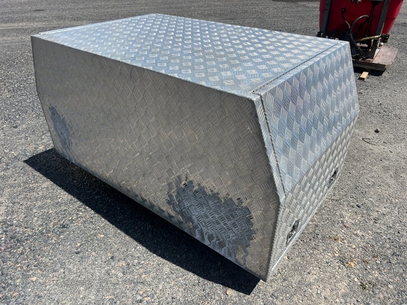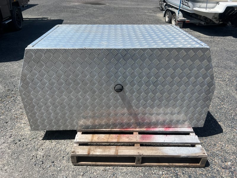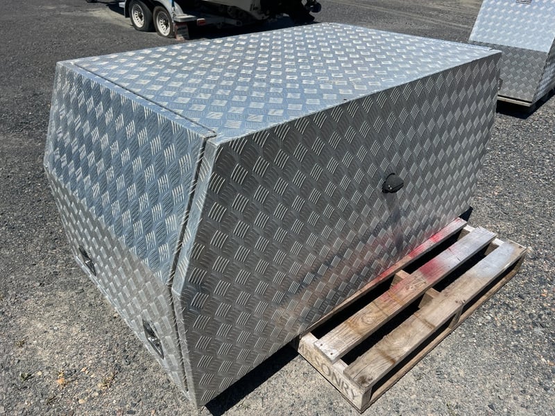 Heavy-duty aluminium Toolbox/Canopy with twin front latches and angled front design. Ideal for Utes, trailers, or site storage. Mounted Camera, 2 x tier shelf