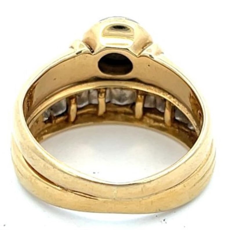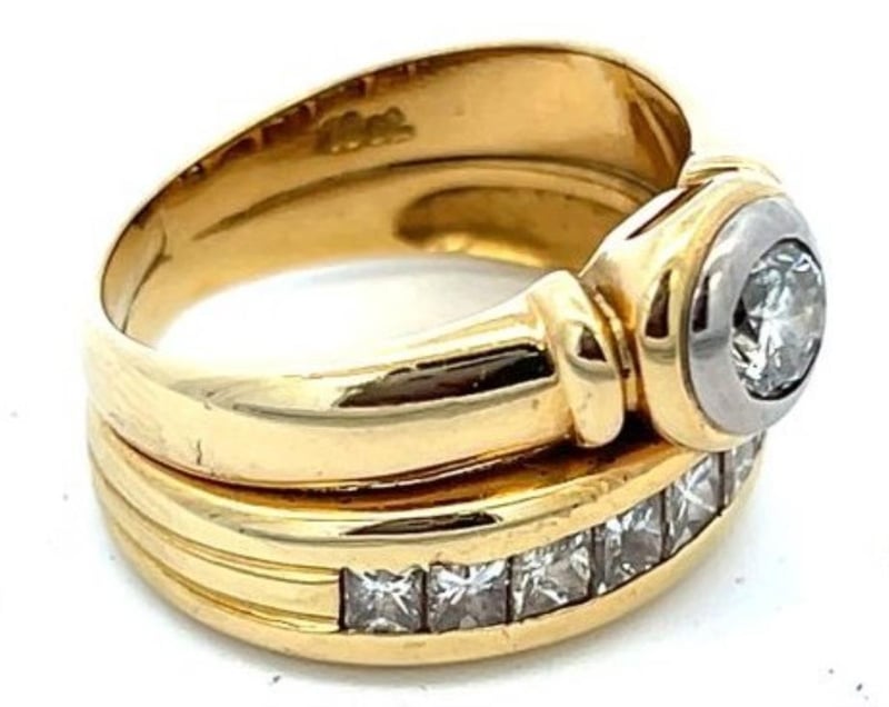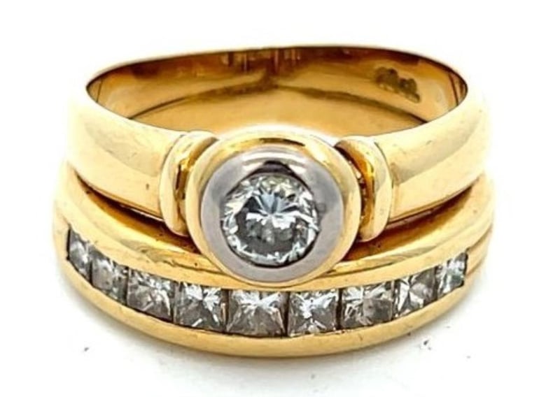 18CT YELLOW GOLD 1.50CT DIAMOND BRIDAL SET SOLDERED, 0.50CT ROUND BRILLIANT CUT DIAMOND DOUBLE BEZEL SET IN RING, 9 PRINCESS CUT DIAMONDS CHANNEL SET IN BAND, TOTAL DIAMOND WEIGHT IN BOTH RINGS 1.50CT H SI-SI2, STAMP 750, RING WEIGHT 8.1 GRAMS 7.84 GRAMS. THIS ITEM HAS BEEN PROFESSIONALLY VERIFIED AS A GENUINE PRODUCT AND COMES WITH ACCOMPANYING 3RD PARTY MARKET APPRAISAL OF $17,880.00 DATED 2021. Condition: Good - Refer To Images