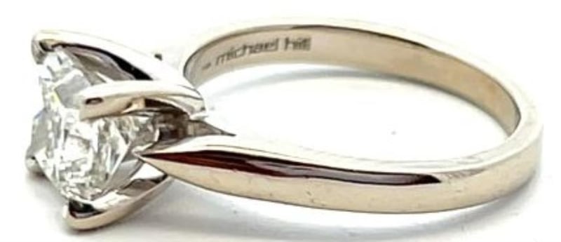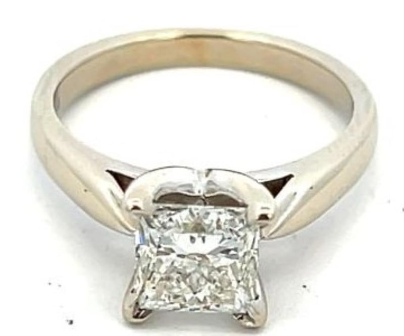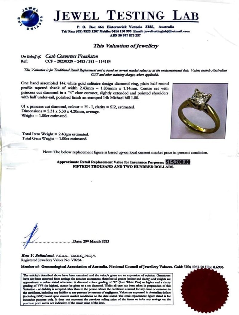 14CT WHITE GOLD 1.00CT DIAMOND RING, PRINCESS CUT DIAMOND 4 CLAW SET IN A VEE GALLERY WITH SWEPT UP POINTED SHOULDERS, TOTAL DIAMOND WEIGHT 1.00CT H-I SI2, STAMP 14K, RING WEIGHT 2.43GRAMS. THIS ITEM HAS BEEN PROFESSIONALLY VERIFIED AS A GENUINE PRODUCT AND COMES WITH ACCOMPANYING 3RD PARTY VALUATION $15,200.00