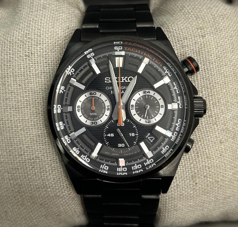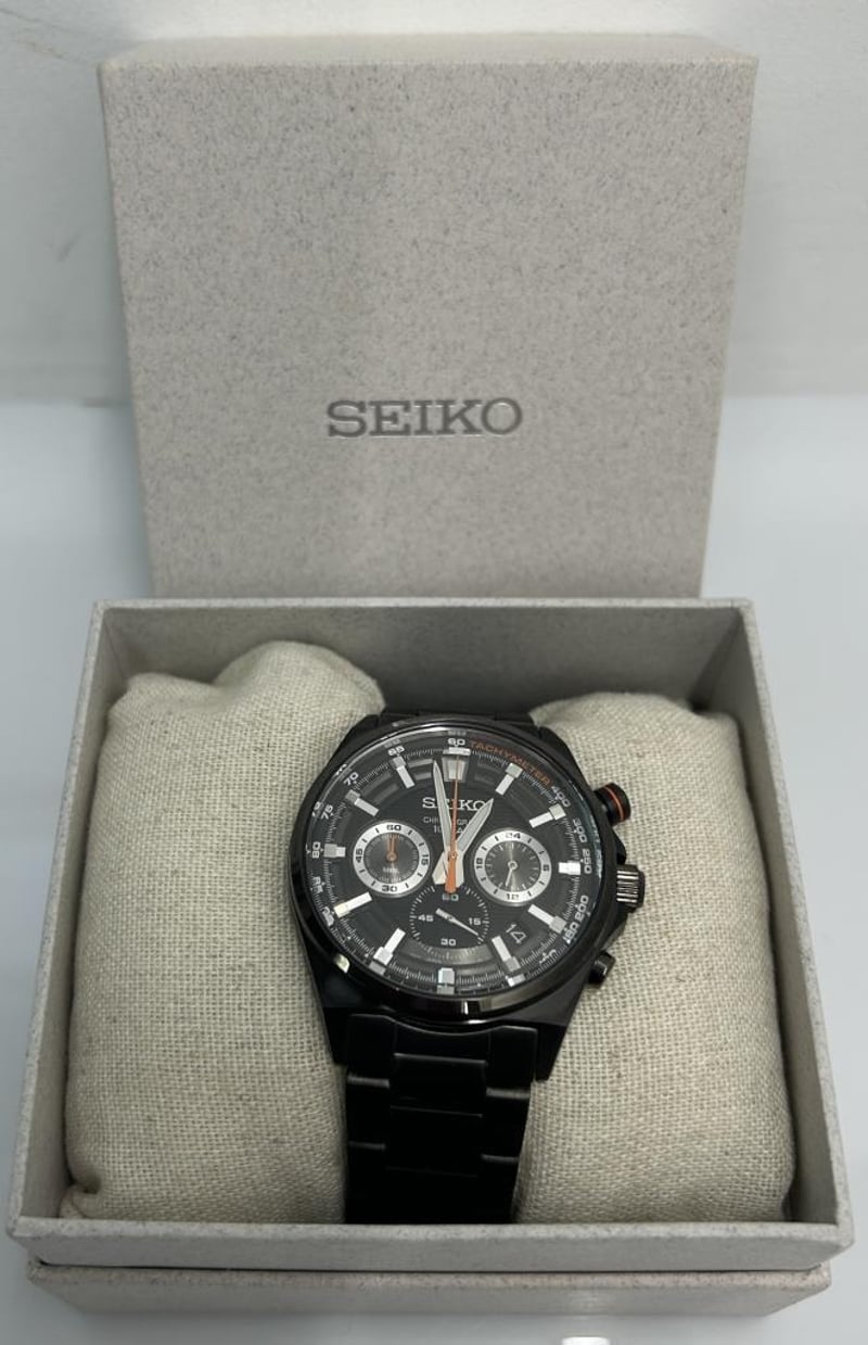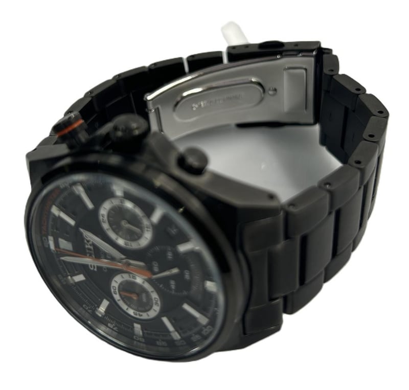 SEIKO CHRONOGRAPH BLACK WATCH, MODEL 8T63-00T0 STAINLESS STEEL BLACK ION-PLATED CASE 40MM AND BRACELET, BLACK DIAL WITH SILVER SUBDIALS AND ORANGE ACCENTS, QUARTZ CHRONOGRAPH MOVEMENT, TACHYMETER BEZEL, DATE DISPLAY, WATER RESISTANT, INCLUDES ORIGINAL SEIKO BOX AND ONE EXTRA LINK, EXCELLENT CONDITION WITH LIGHT WEAR.Condition: Good - Refer To Images