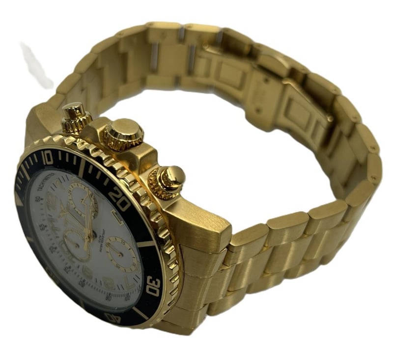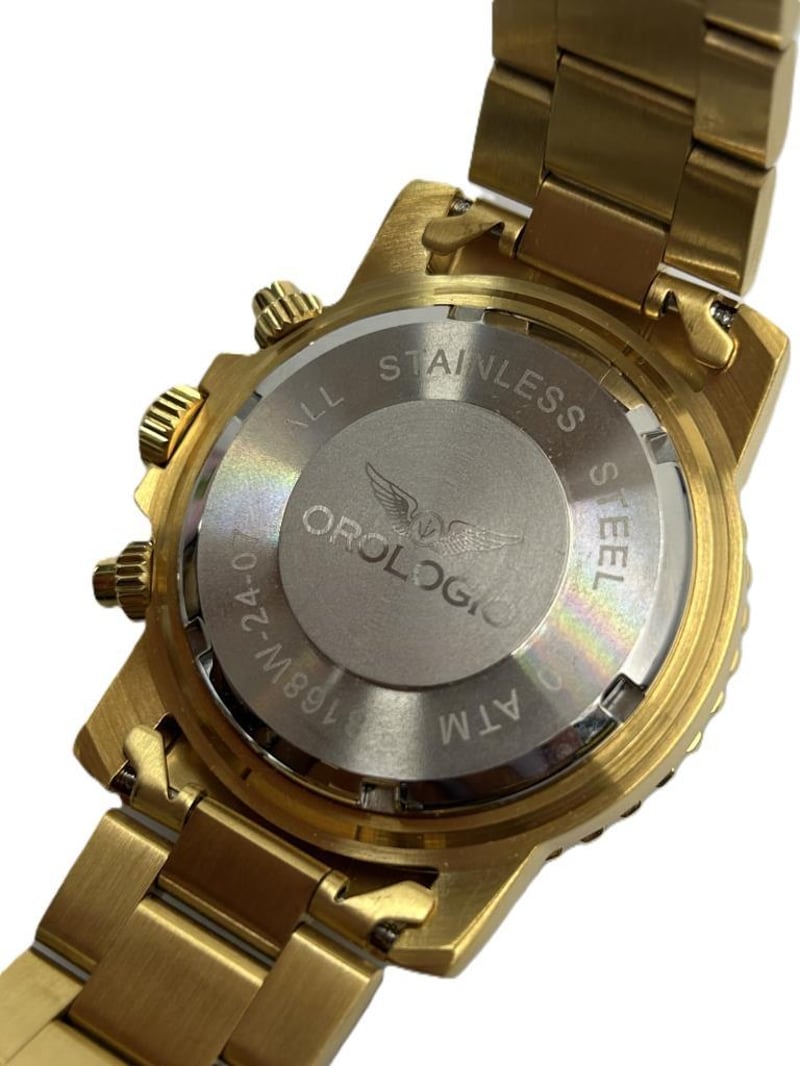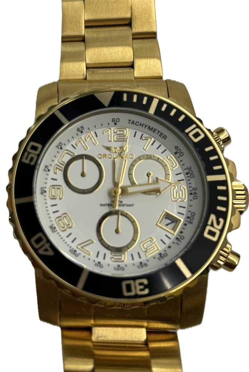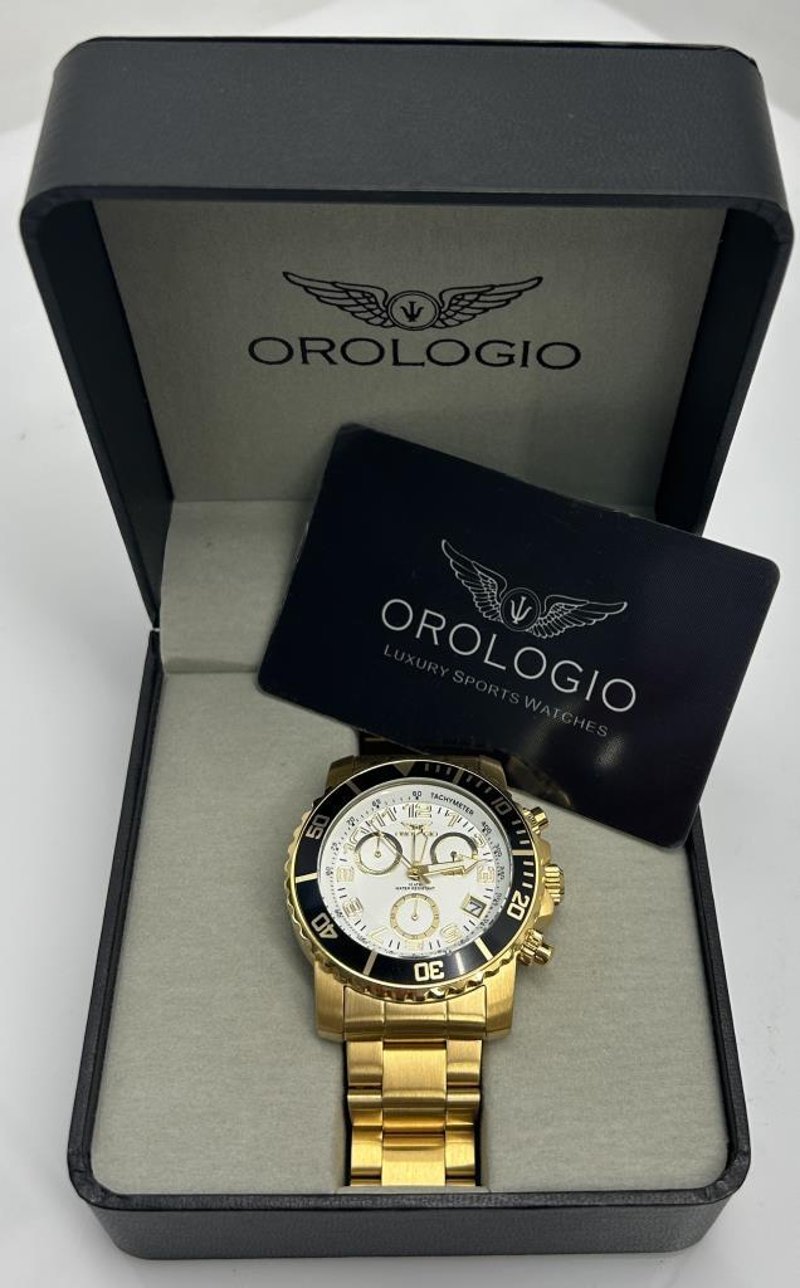 OROLOGIO CHRONOGRAPH WATCH, MODEL 8168W-24-07, WHITE DIAL WITH GOLD-TONE NUMERALS AND SUBDIALS, BLACK TACHYMETER BEZEL, CASE SIZE 40MM, QUARTZ CHRONOGRAPH MOVEMENT, WATER RESISTANT 3 ATM, GOLD-TONE STAINLESS STEEL CASE AND BRACELET WITH FOLD-OVER CLASP, INCLUDES ORIGINAL OROLOGIO BOX AND CARD, EXCELLENT CONDITION WITH LIGHT WEAR.